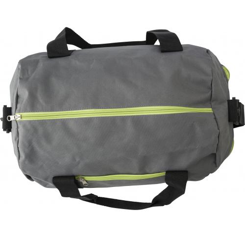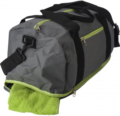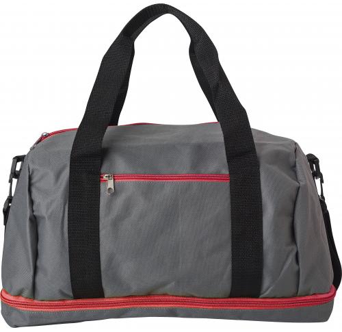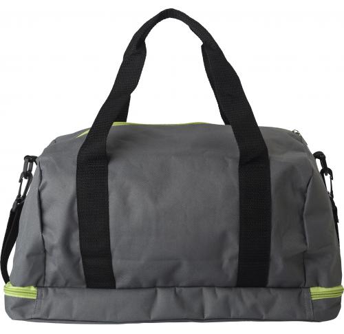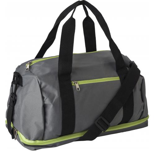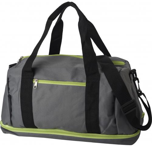 Small polyester (600D) sports bag with one zippered pocket and a separate shoe compartment at the bottom. The bag has two handles and an adjustable shoulder strap.