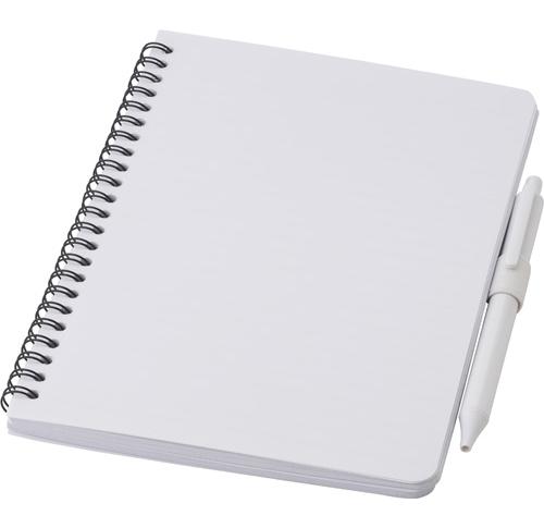 Antibacterial notebook with pen, blue ink, in pen loop. The notebook has 70 lined sheets. Approximately A5 size.