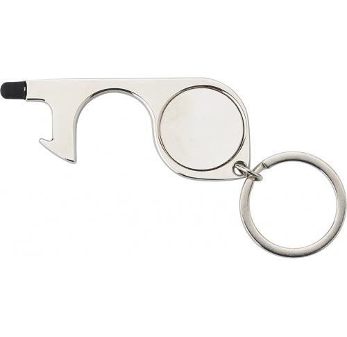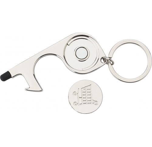 Metal door opener with rubber tip for capacitive screens, key ring, and trolley coin.