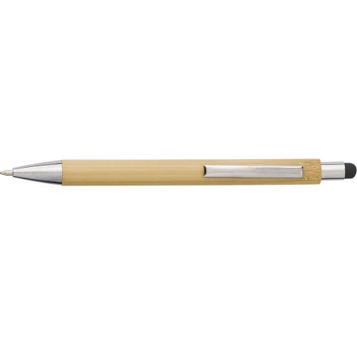 Bamboo ballpen with plastic tip and top, including rubber tip for capacitive screens. The clip is metal. Blue ink.