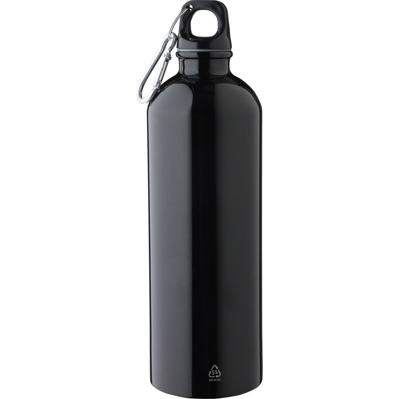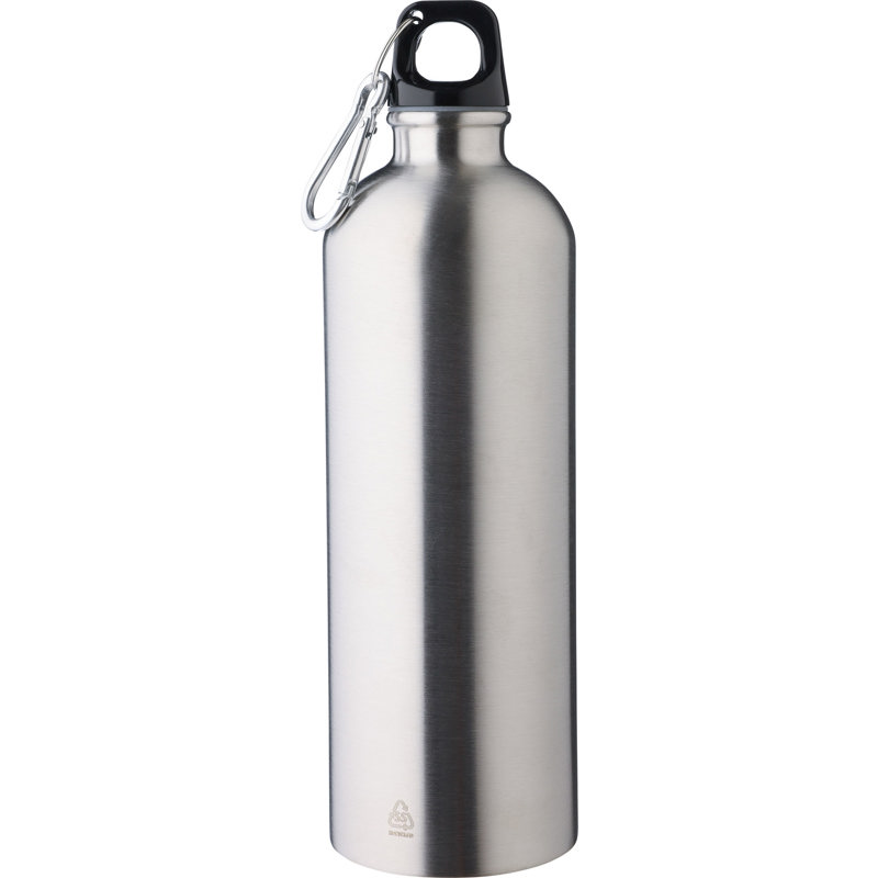 Recycled stainless steel single-walled bottle with a carabiner belt clip. Features a recycled engraved logo on the front. Not dishwasher safe.. This item contains a recycled logo towards the bottom of the bottle on one side.