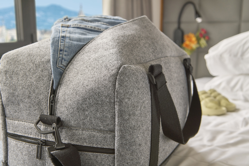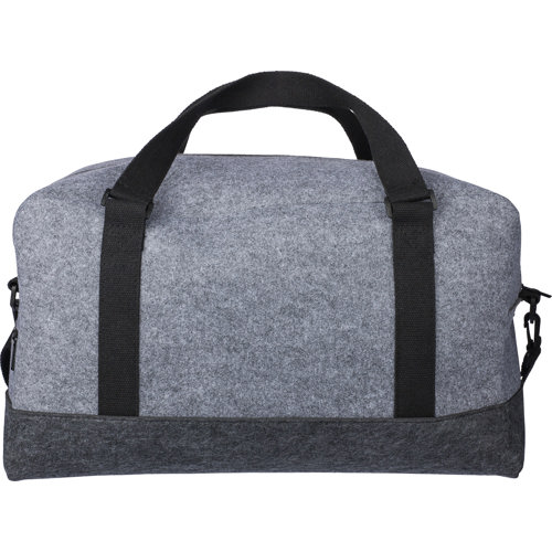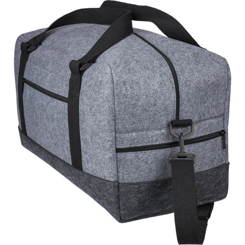 Sports bag made of RPET felt with canvas carrying handles, and an adjustable shoulder strap. Features a large zipped compartment and a small zipped pocket. Capacity: 30L. Carrying capacity: 10 kg.
