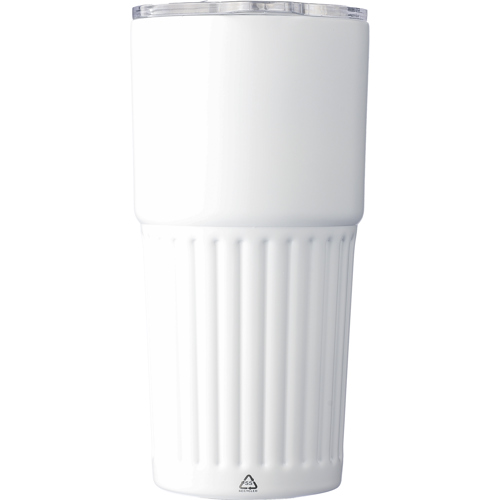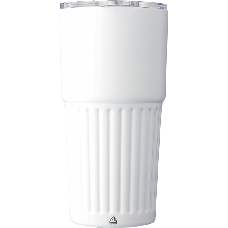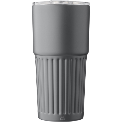 Recycled stainless steel double walled drinking mug. Includes an engraved recycled logo on the body. Individually packaged in a brown cardboard box.