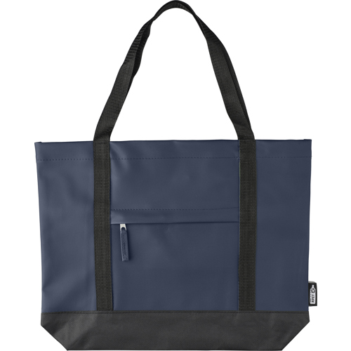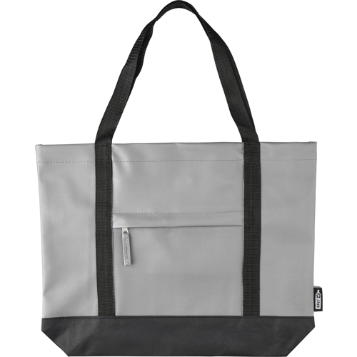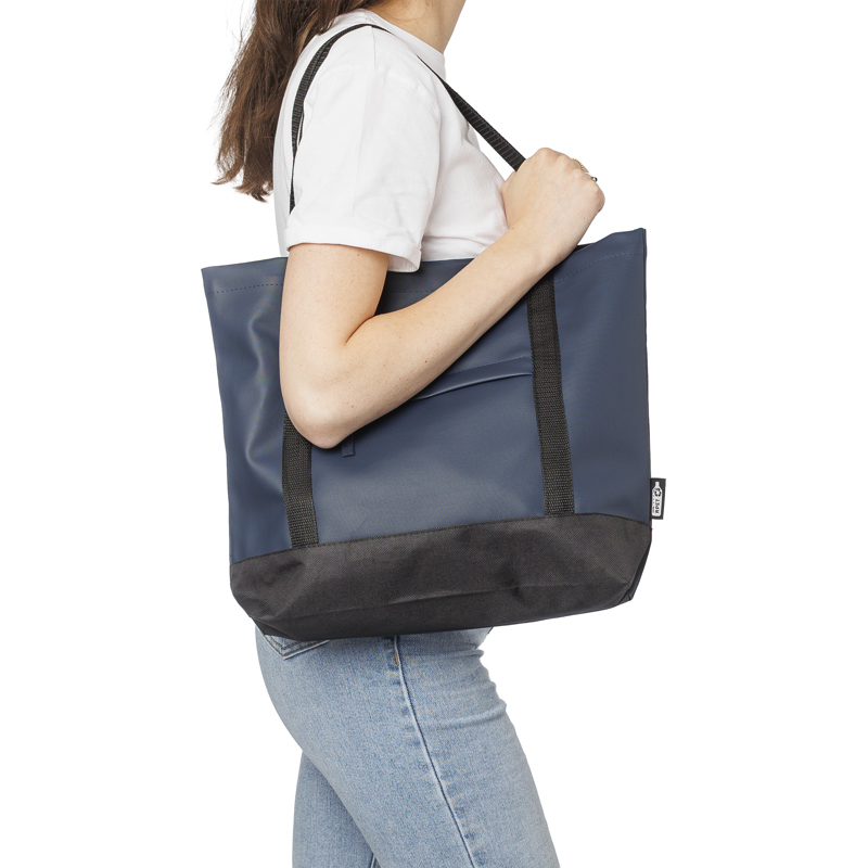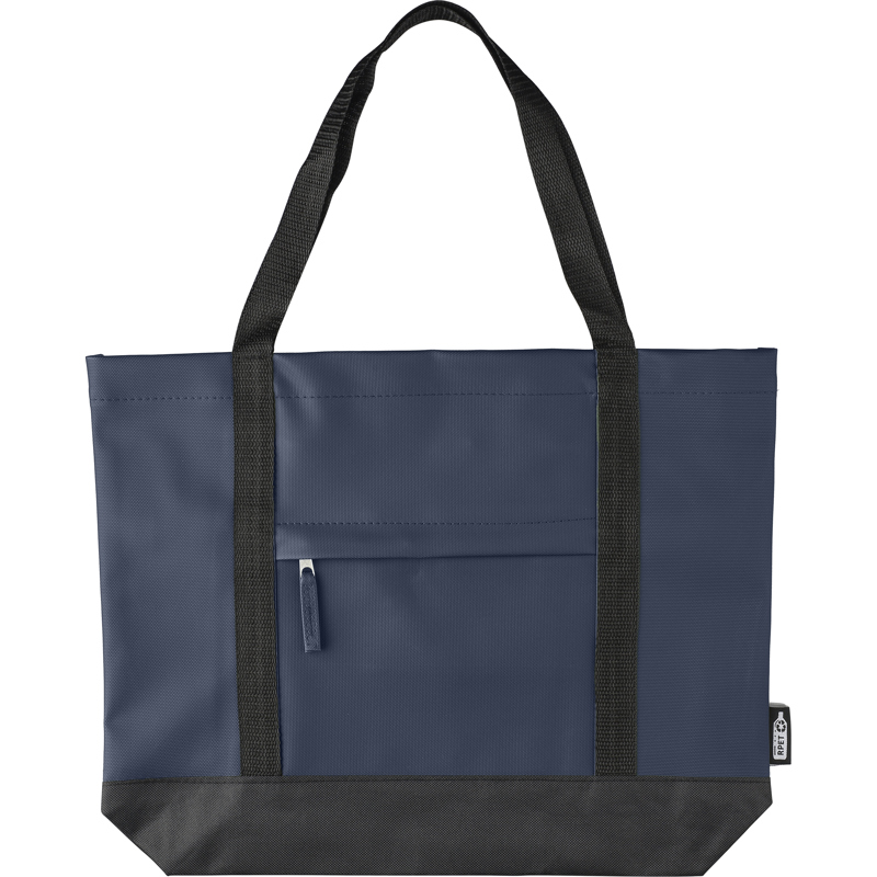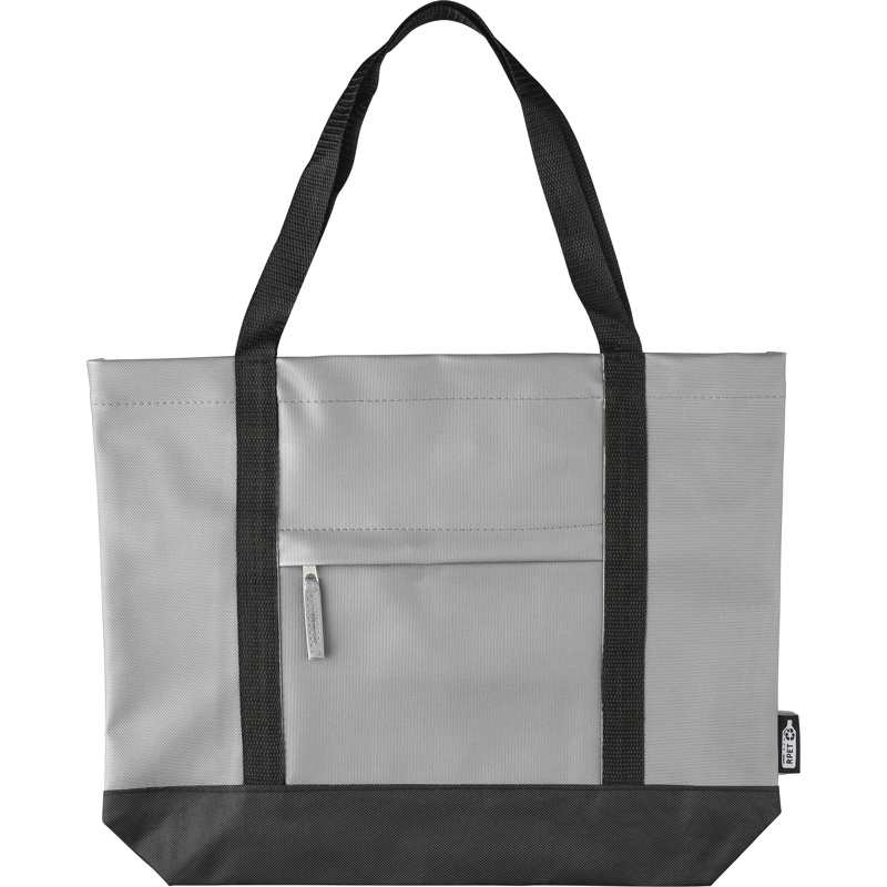 RPET (600D) polyester tote bag with PU coating on both sides for water repellency. Features a front zipped pocket, a small zipped pocket inside and long carrying handles. Designed with a 10-litre capacity and a 10 kg carrying capacity. Includes an rPET label