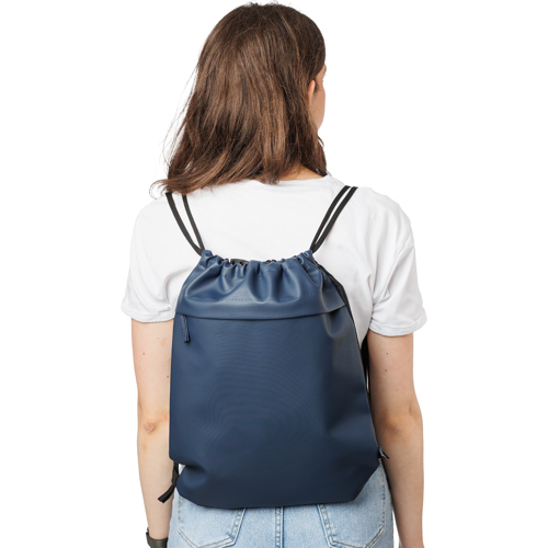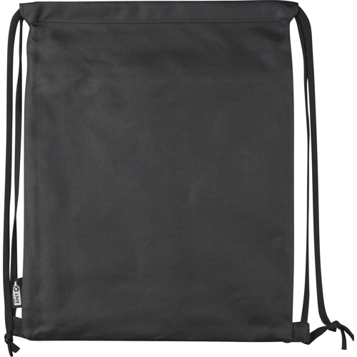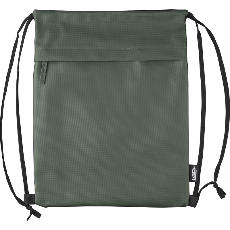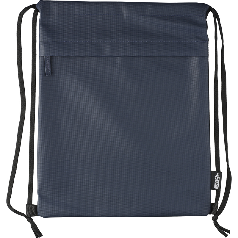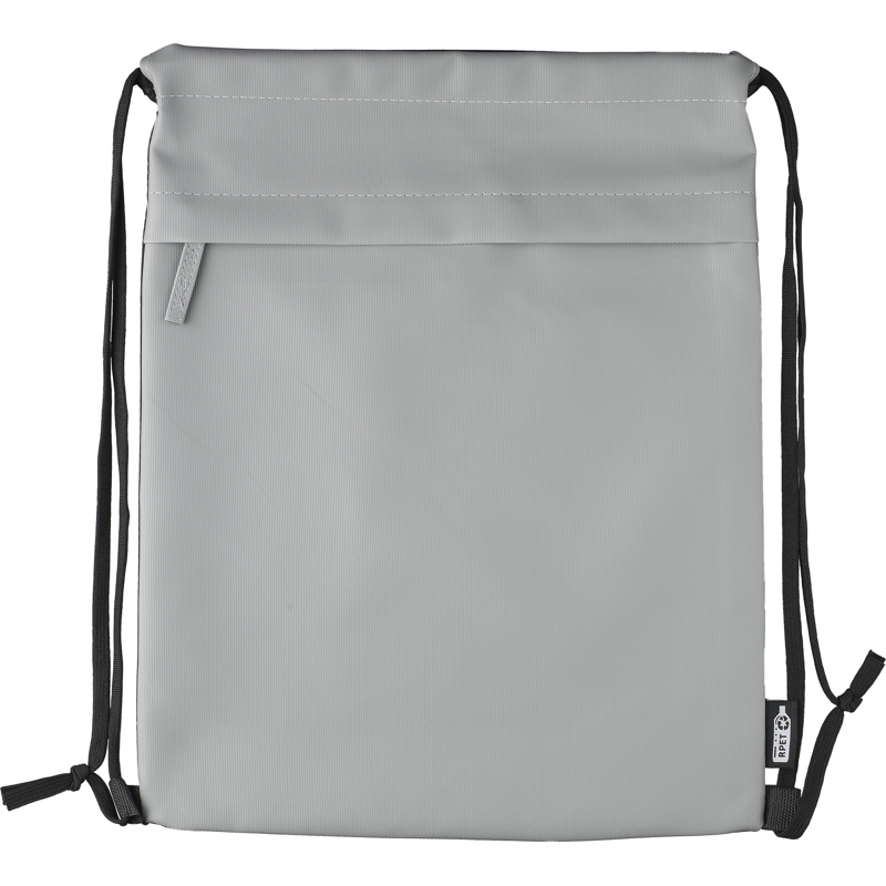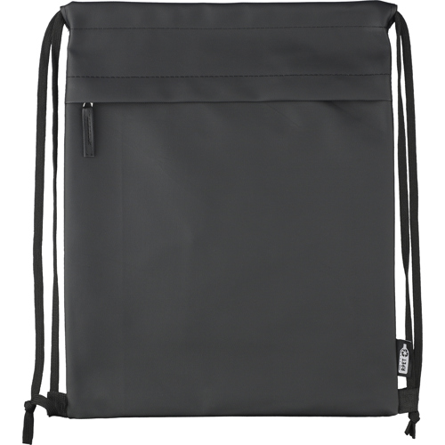 RPET (600D) polyester drawstring bag with PU coating on the front side for water repellency. Features a hidden zipped front pocket and a spacious drawstring compartment. Capacity, 8 litre and a 8kg carrying capacity. Includes an rPET label.