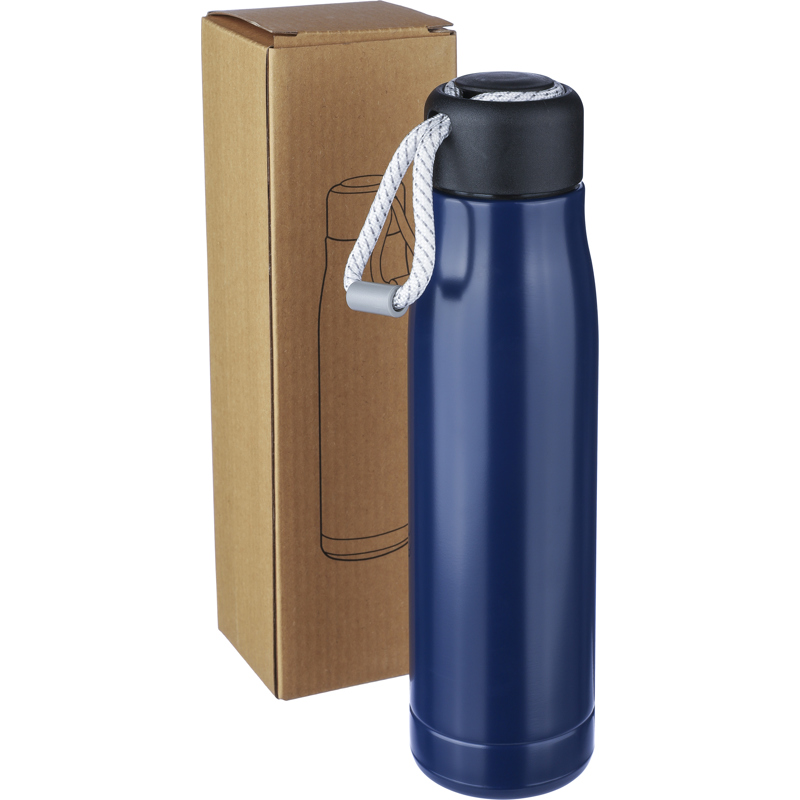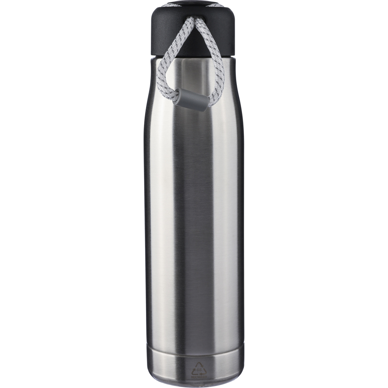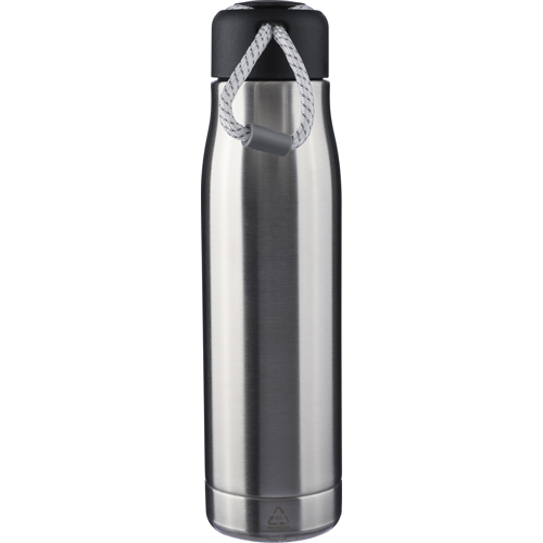 Recycled stainless steel double walled bottle with a screw lid and polyester carrying cord. Includes an engraved recycled logo. Individually packaged in a brown cardboard box.