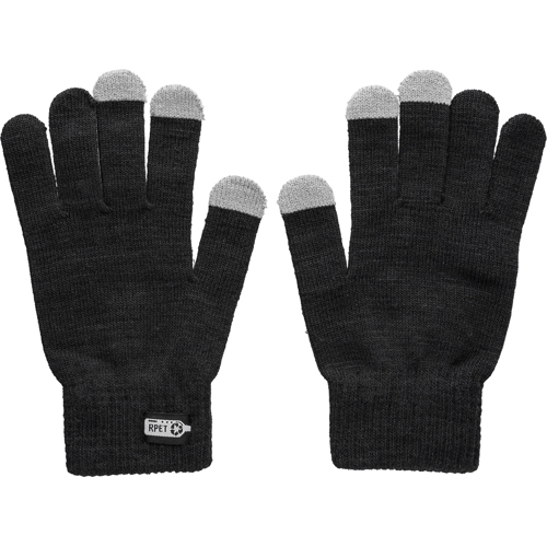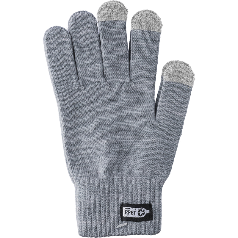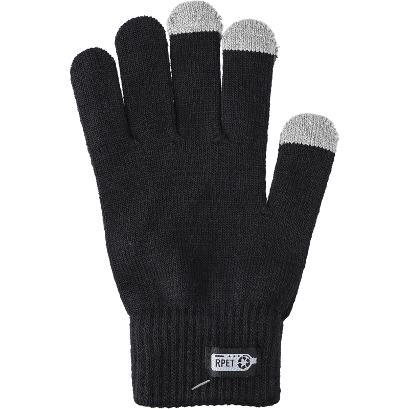 RPET touchscreen gloves with conductive coating on three fingers for screen use. Includes an rPET label on the outside and a washing label with information on the inside.