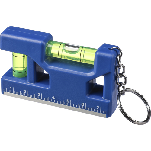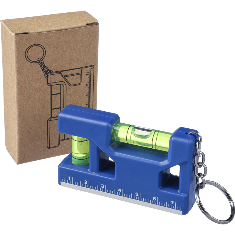 Recycled magnetic spirit level key holder with a magnetic strip on the base for attaching to metal surfaces. Includes a key chain and recycled plastic logo on the back. Individually packaged in a brown cardboard box.