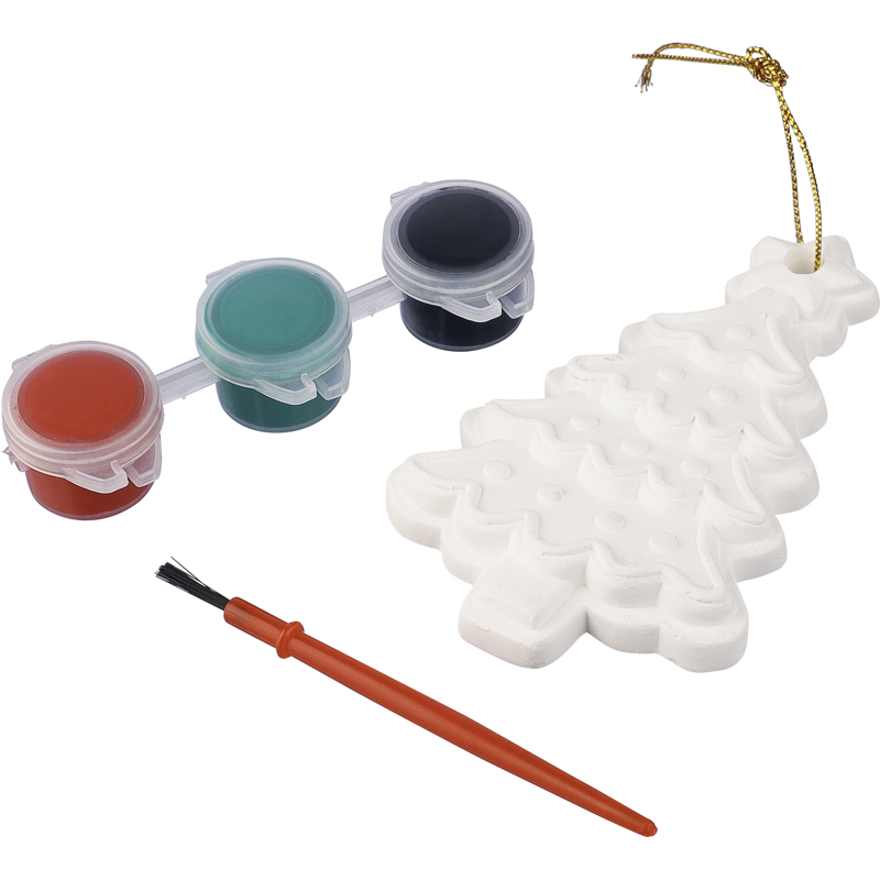 Christmas tree painting set including one plaster figure, three acrylic paints and a brush. Features a hole with polyester cord to hang as a Christmas tree decoration.