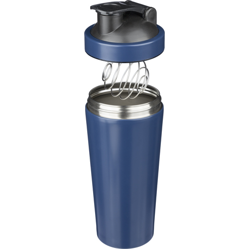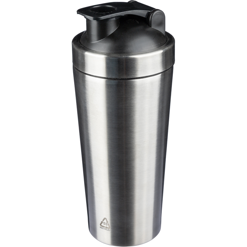 Recycled stainless steel sport drinking bottle and a screw top lid and metal shaker ball for mixing. Laser-engraved recycled logo on the front. Individually packaged in a kraft paper box.