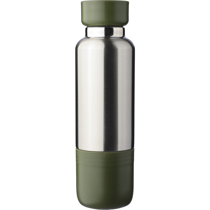 Stainless steel double walled bottle with a screw top lid and a 200ml drinking cup in the base. Individually packaged in a brown cardboard box.