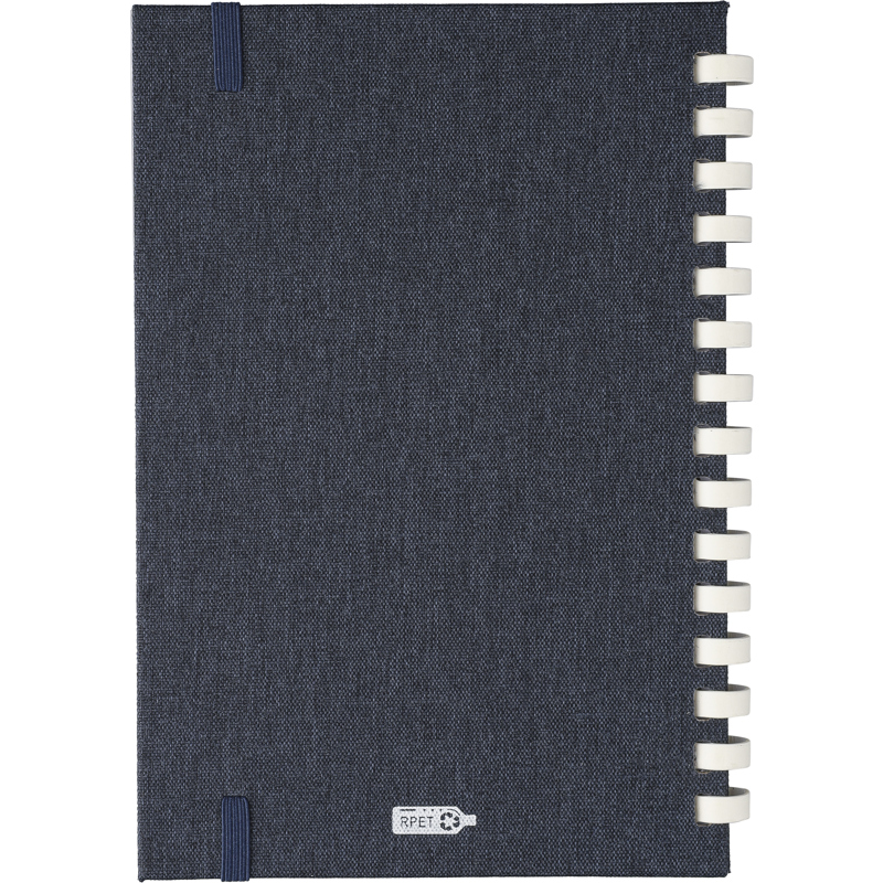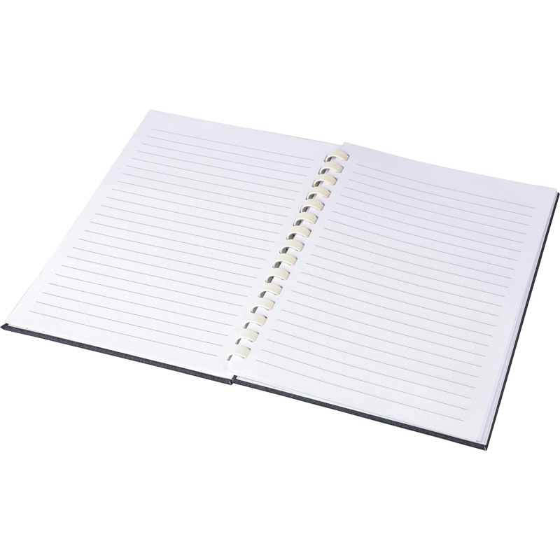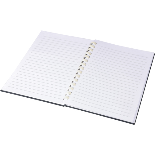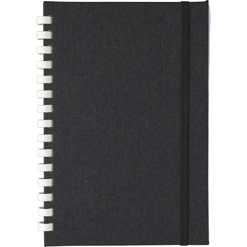 RPET notebook with a hard cover and elastic closing band. Features a white cardboard spiral binding, ribbon marker and 80 sheets of 70gsm lined paper. Includes an rPET logo on the back.
