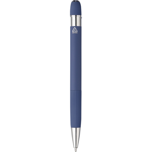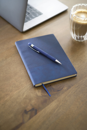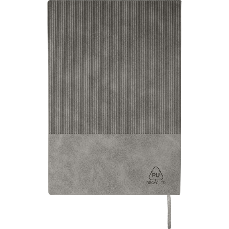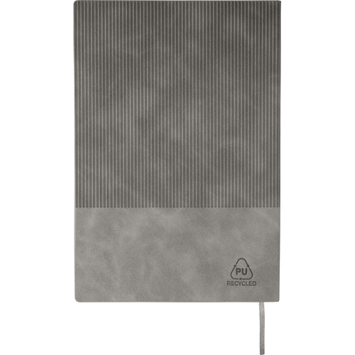 Recycled PU notebook and ballpen. The notebook has a corduroy-look finish on the top part of the front and back and includes a ribbon marker and 100 lined pages of 80gsm paper and features an embossed recycled logo on the back. The ballpen has a rubberized finish and laser-engraved recycled logo. Packed in a strong brown carton box with EVA inlay.