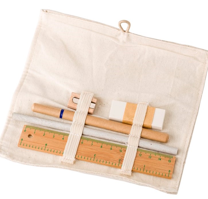 Cotton roll-up pouch with drawing set including: bamboo ruler, wooden pencil sharpener, eraser, pencil and ballpen with blue ink.