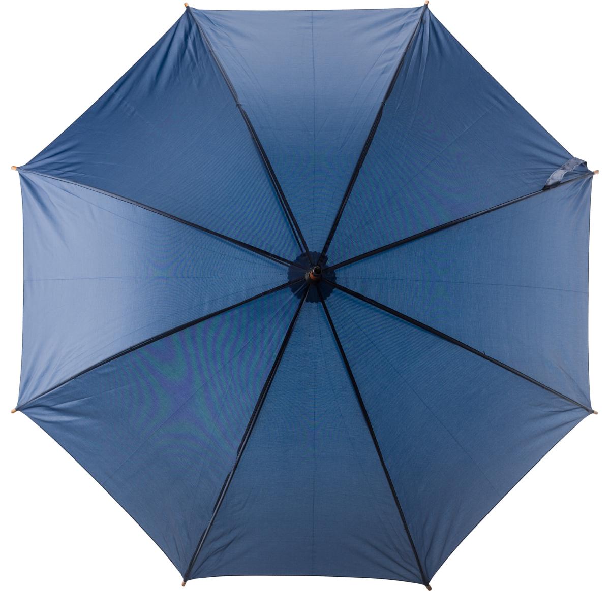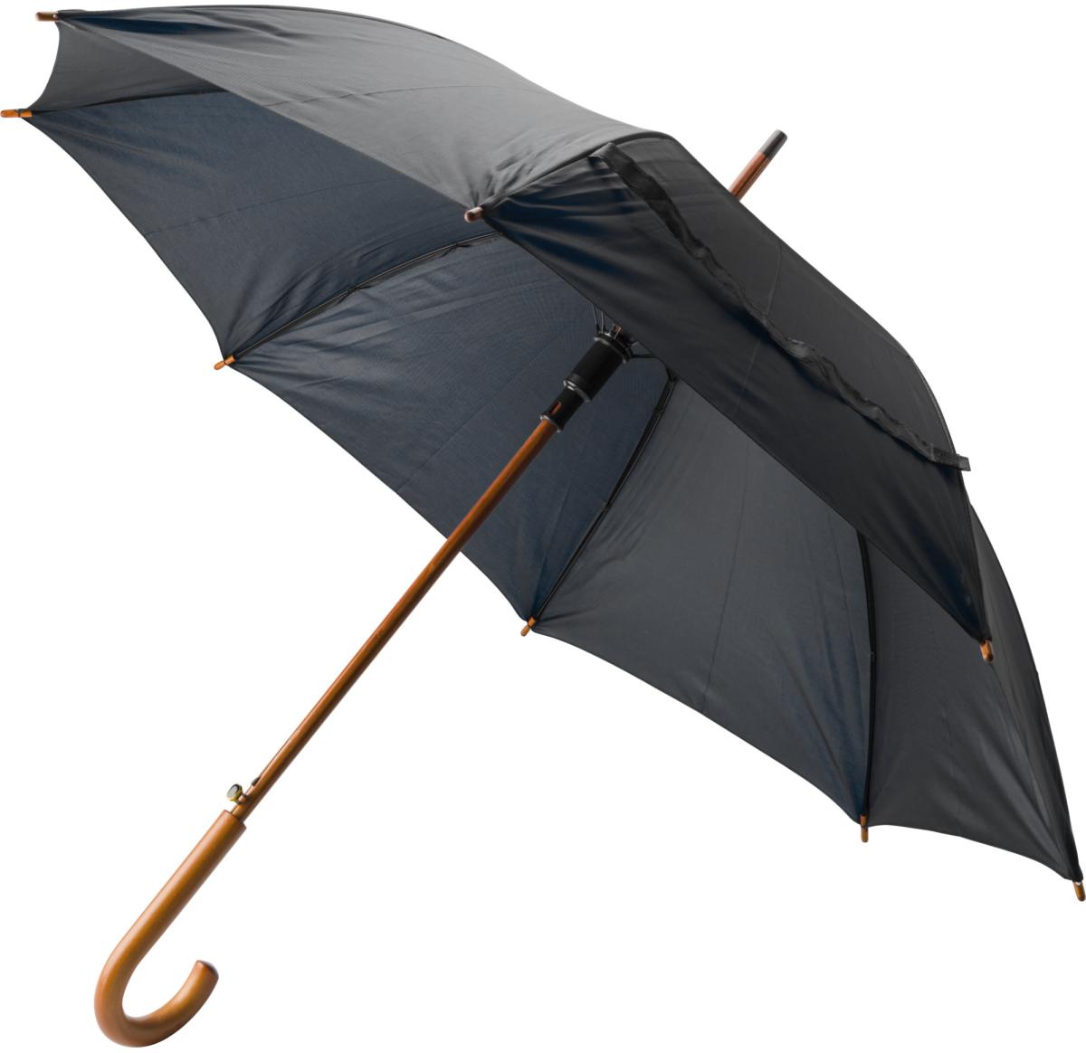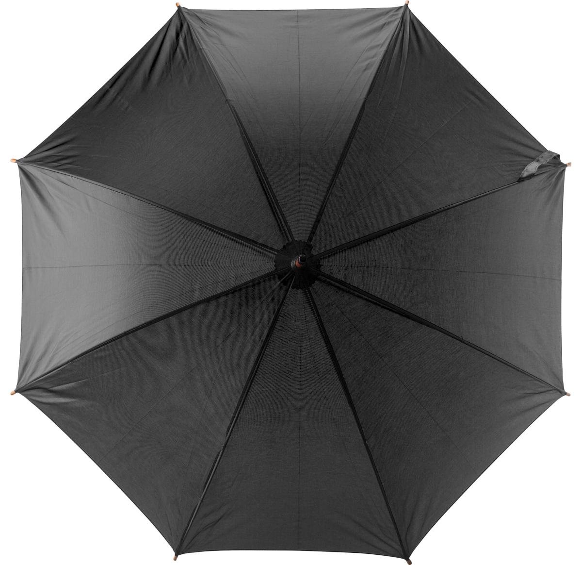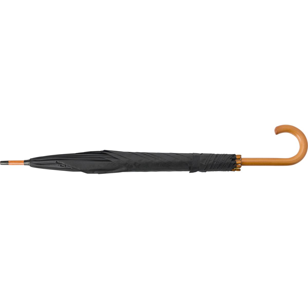 Polyester (190T) automatic umbrella with eight panels. Metal frame and wooden shaft and handle.