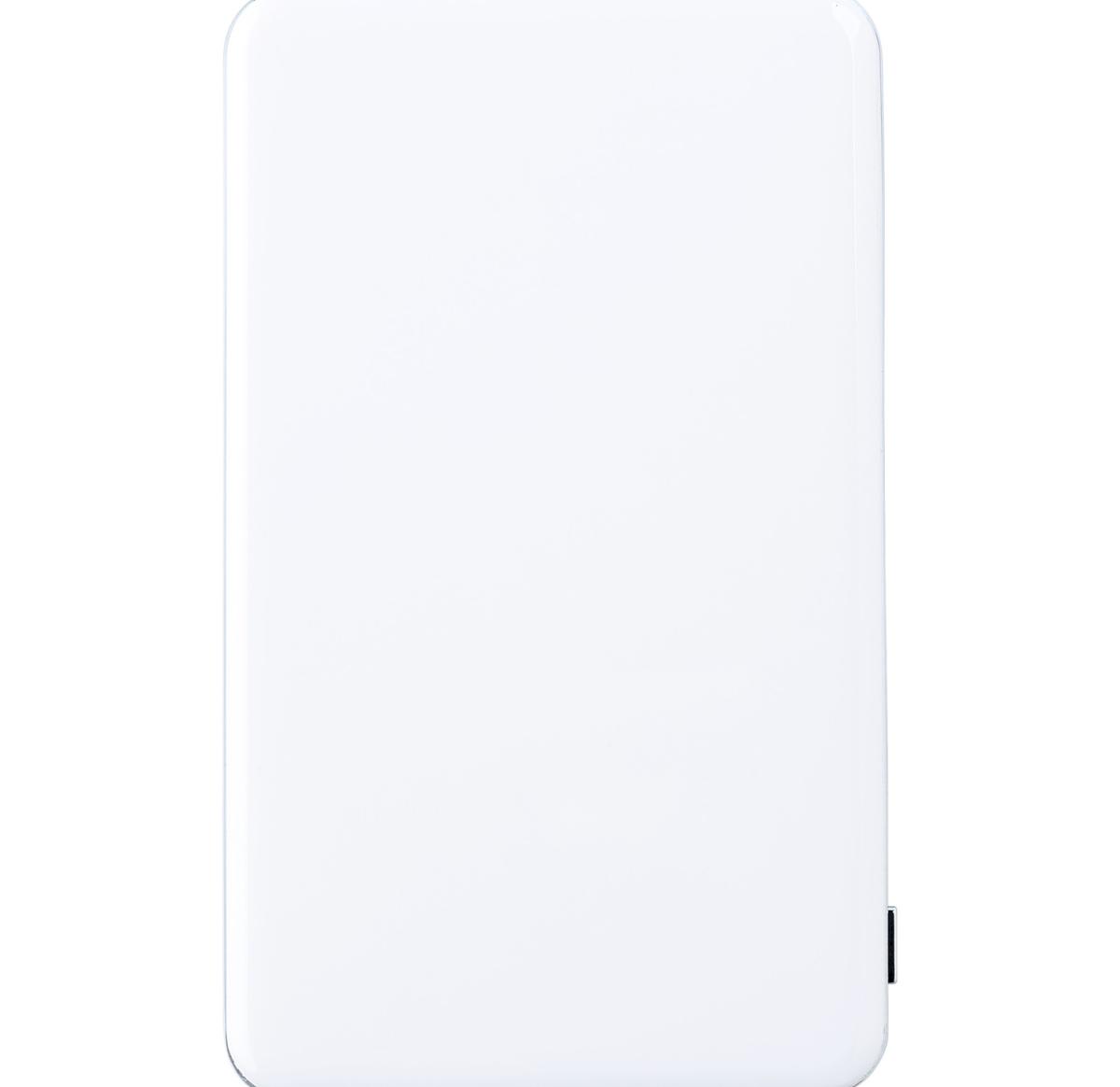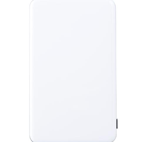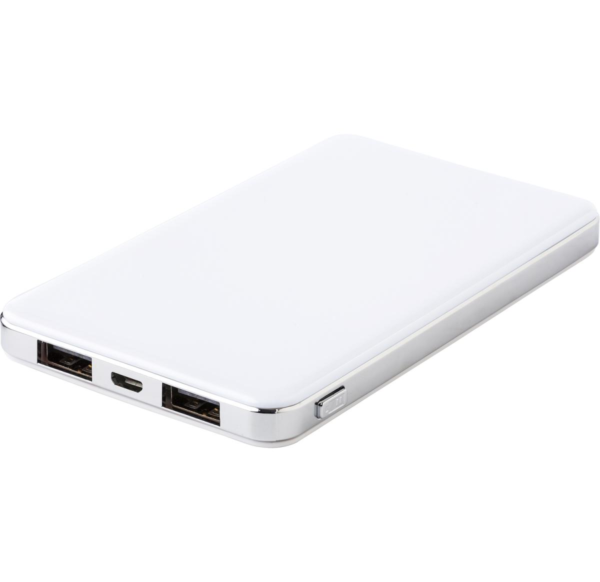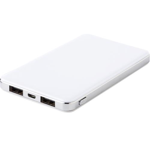 Plastic Li-polymer power bank with a capacity of 5000mAh, input of 5V/1000mA, and output of 1500mA/2100mA/5V. Both sides are shiny with a silver coloured rim. Includes 5 blue LED power indication lights and a white USB/micro USB cable (approx. 32 cm.).