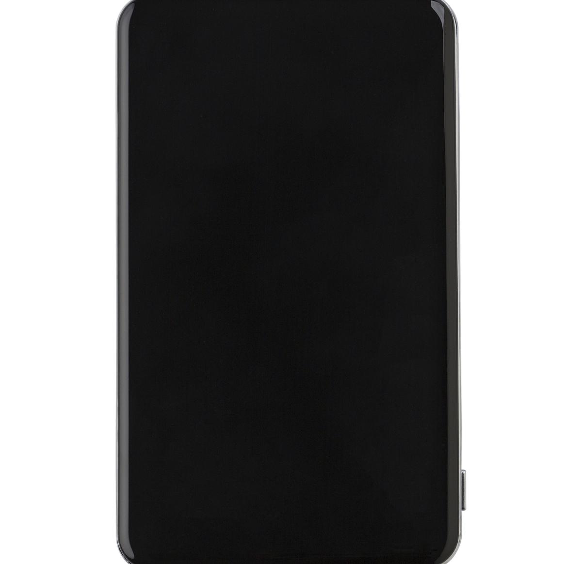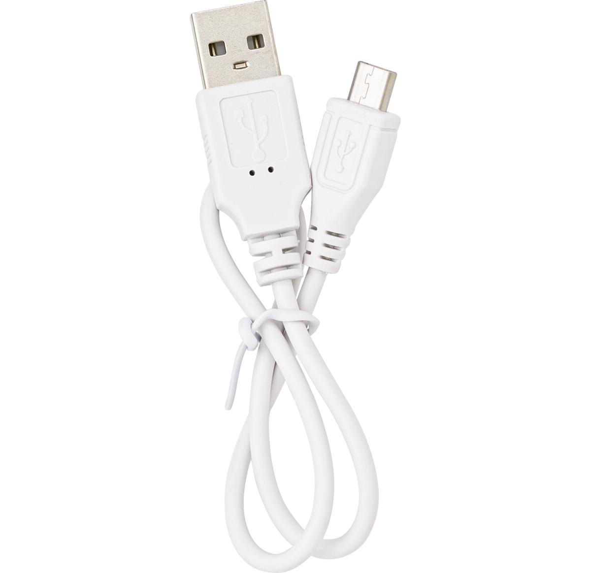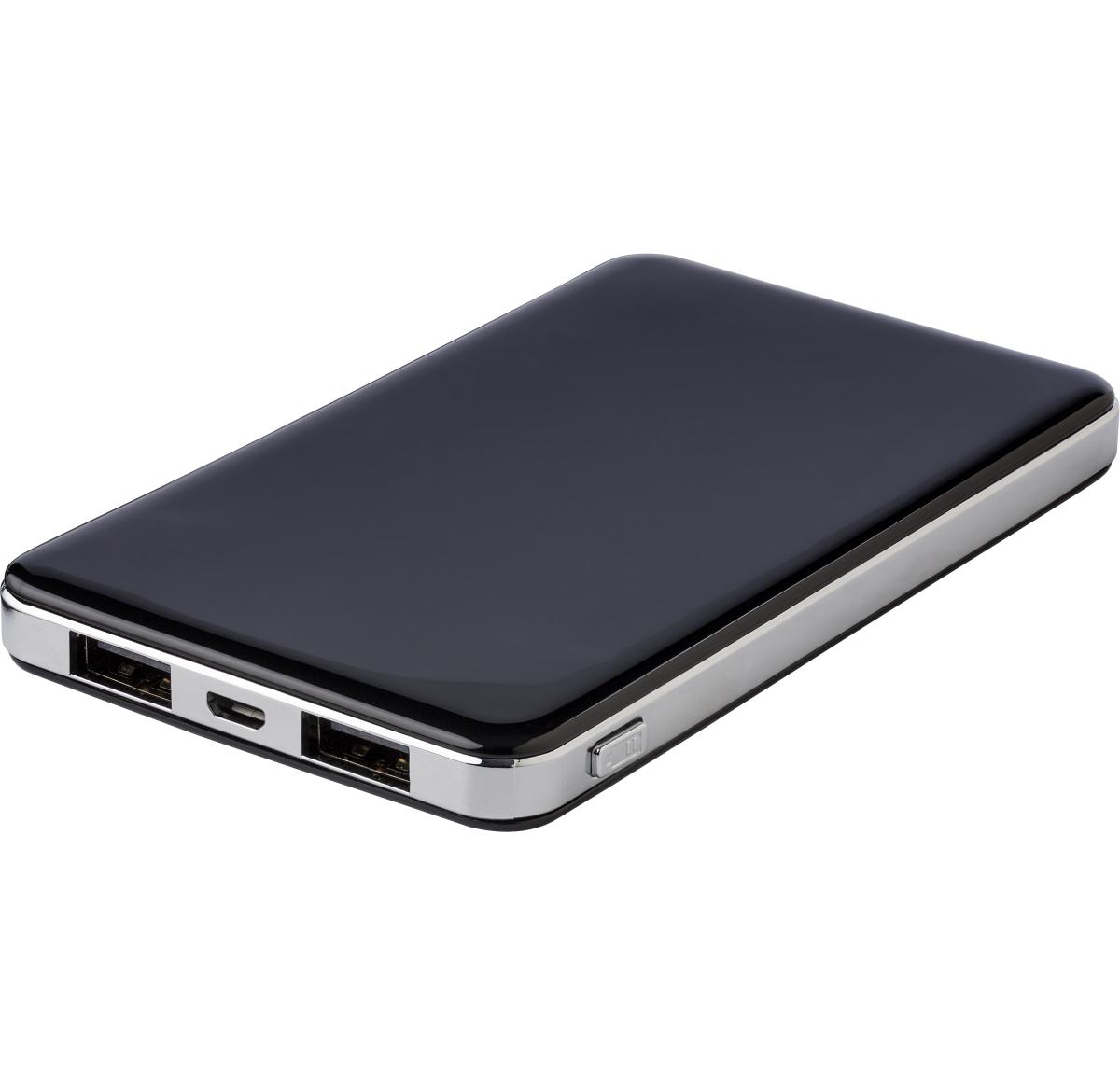 Plastic Li-polymer power bank with a capacity of 5000mAh, input of 5V/1000mA, and output of 1500mA/2100mA/5V. Both sides are shiny with a silver coloured rim. Includes 5 blue LED power indication lights and a white USB/micro USB cable (approx. 32 cm.).