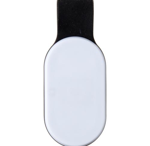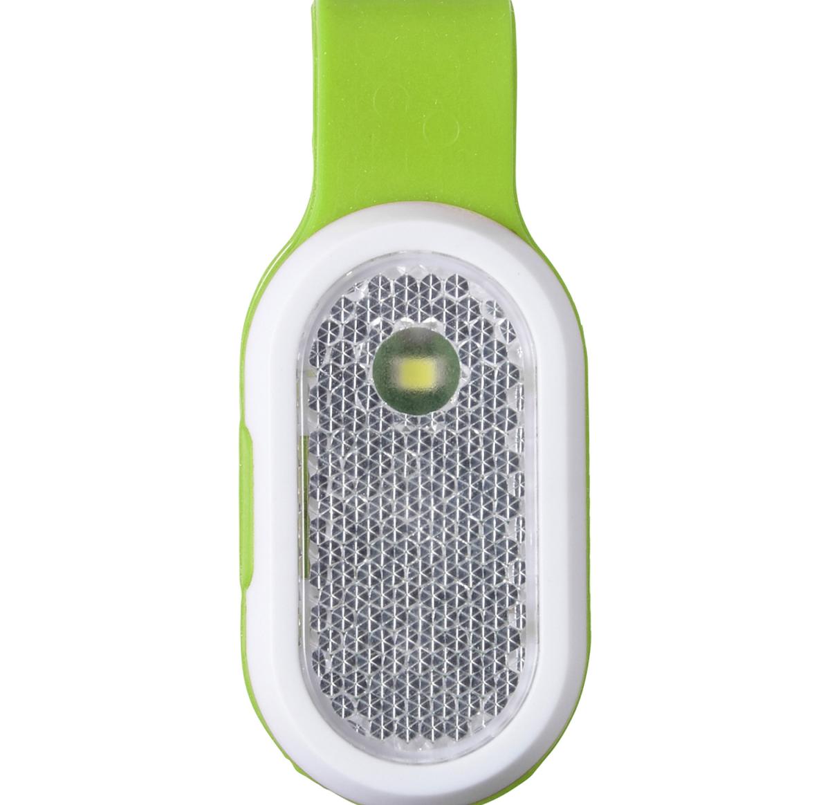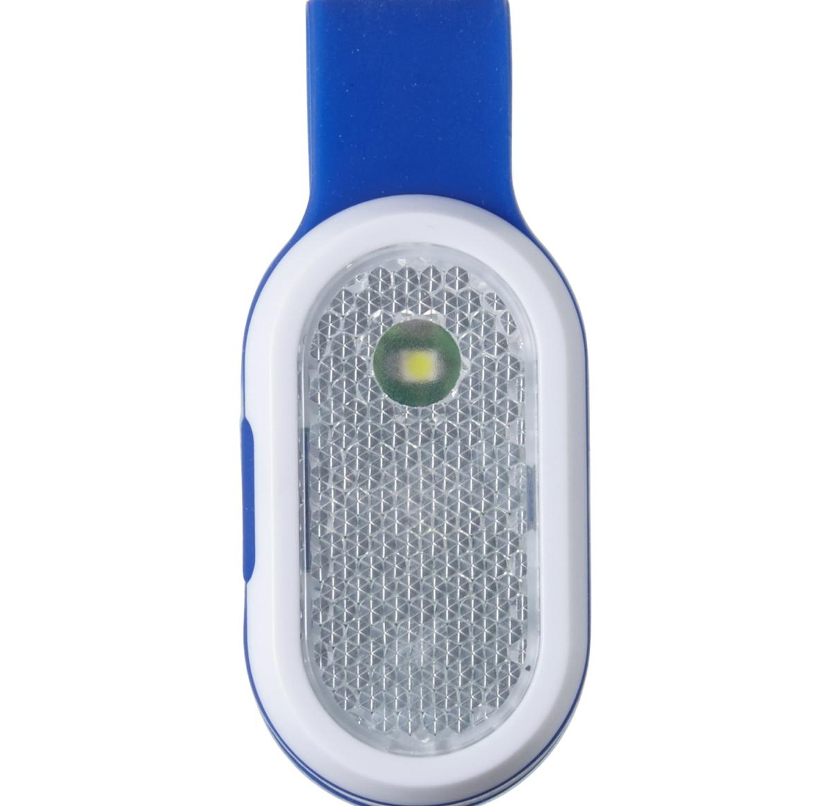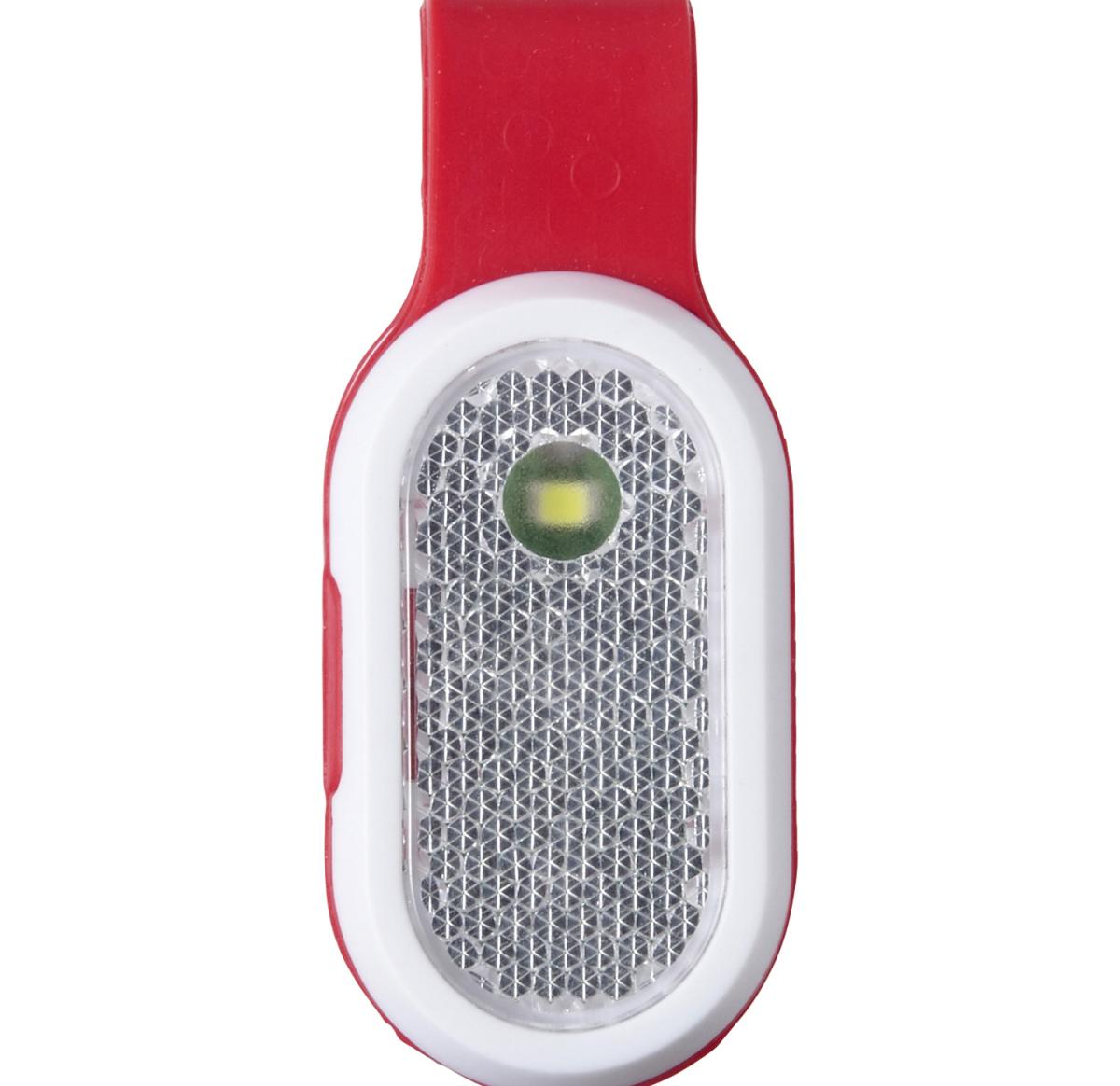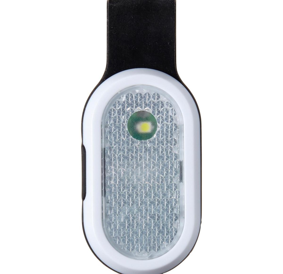 Safety light with powerful COB (chip on board) LED lights in both white and red. With strong magnets, the front and back are connected by a silicon strap. Batteries included.