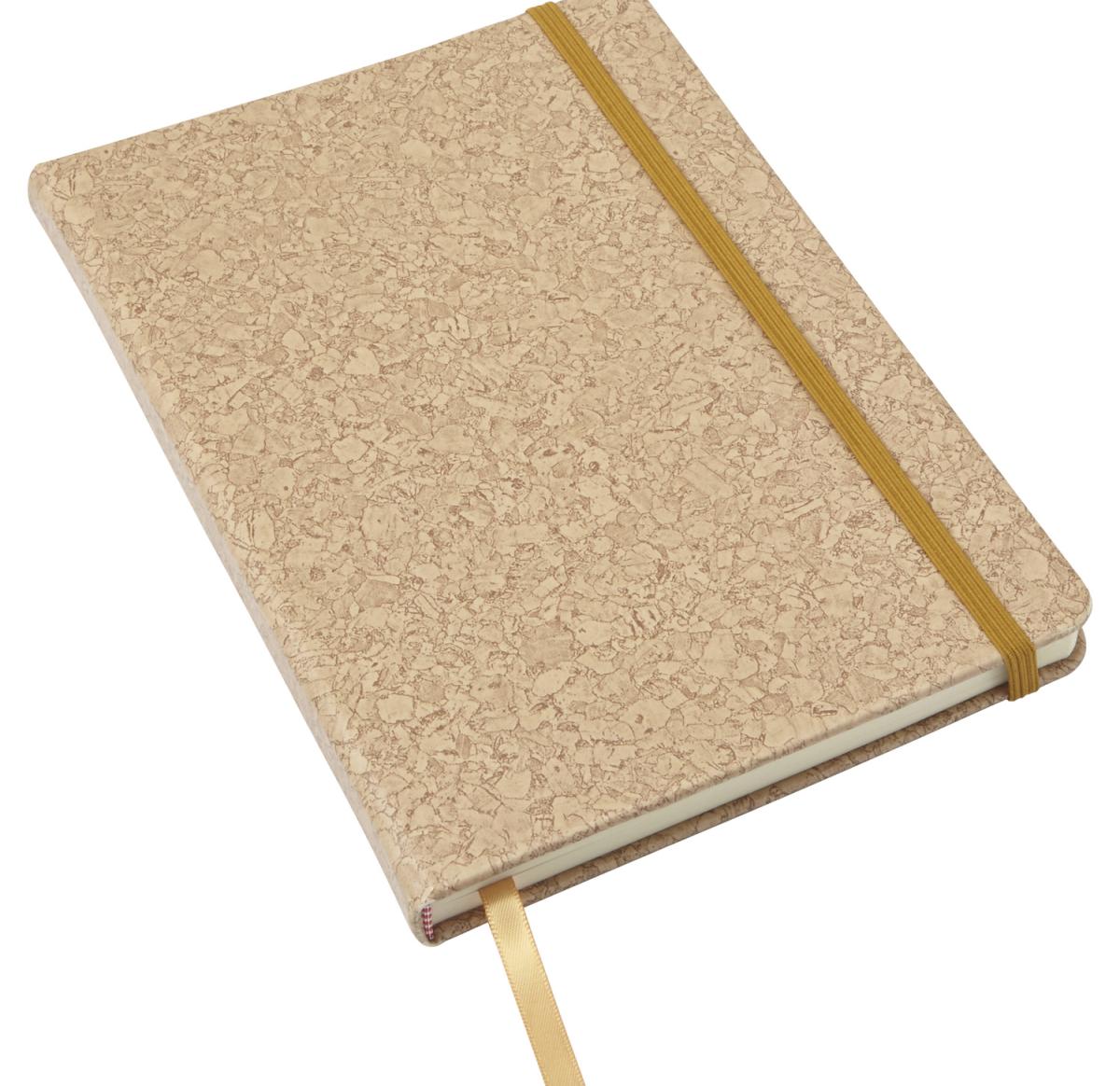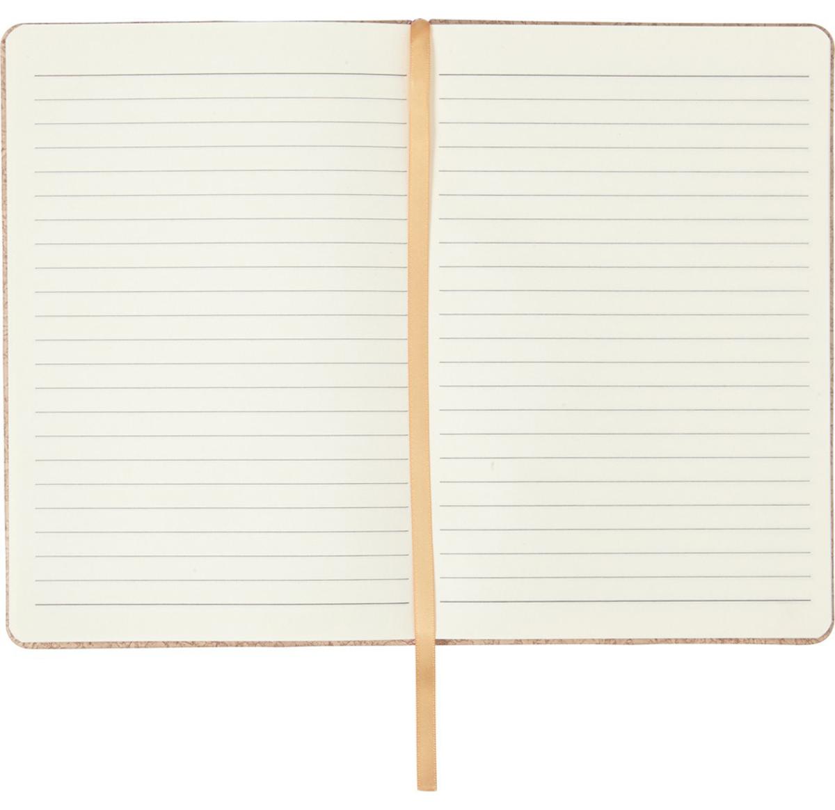 PU covered note book with cork print (approx. A5) ninety six lined pages, ribbon marker and matching coloured, elastic nylon band for closing.