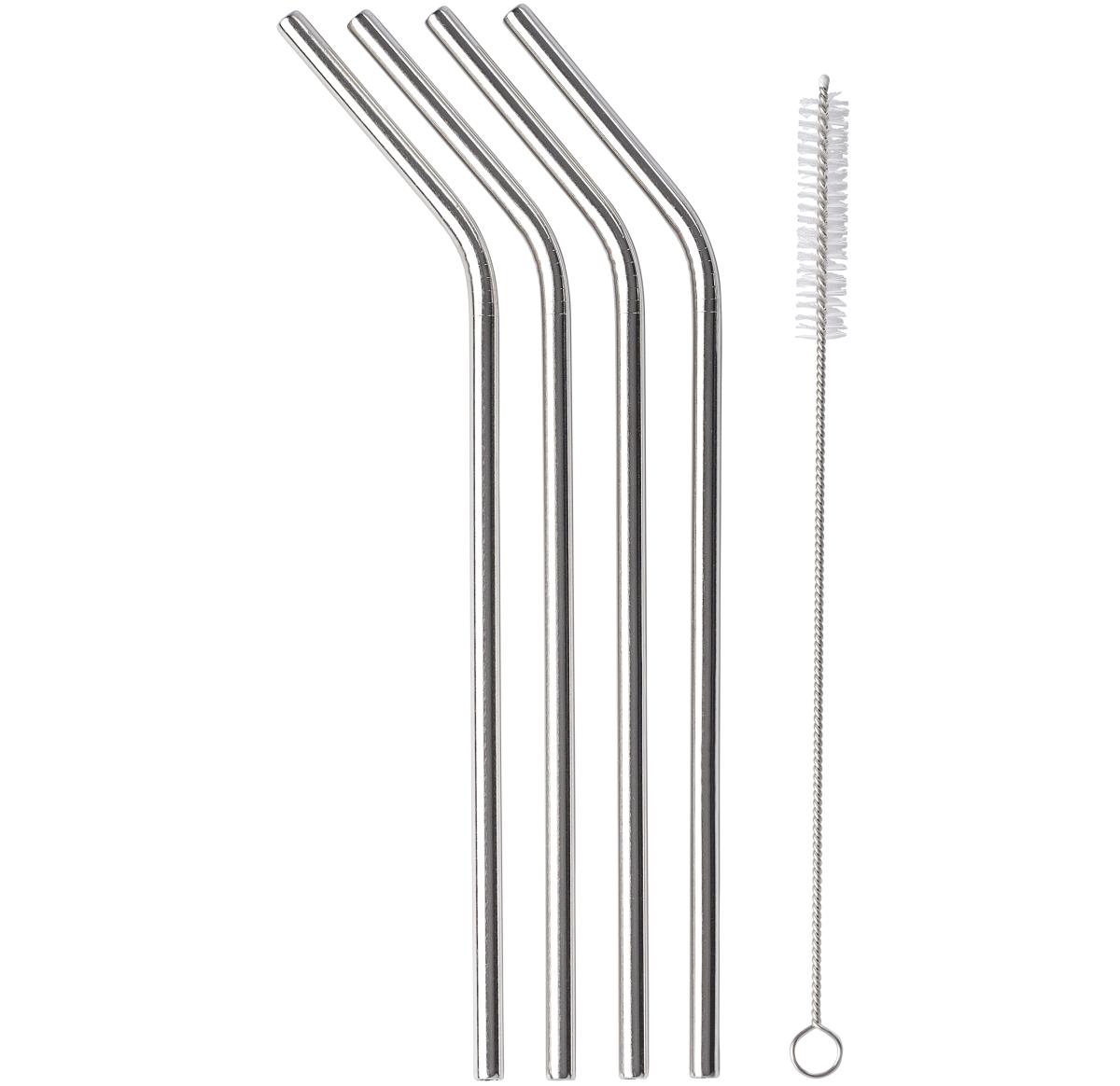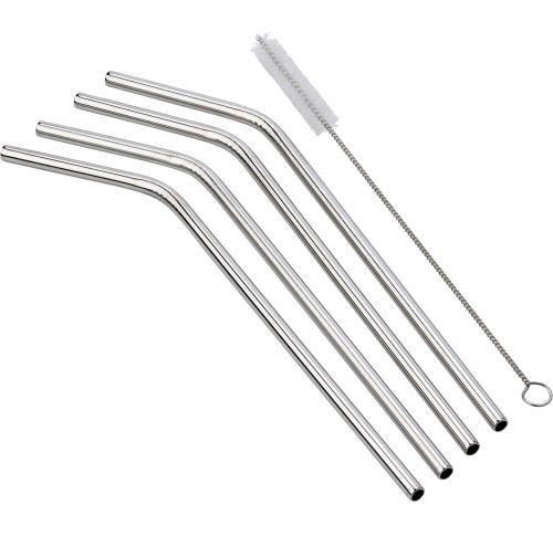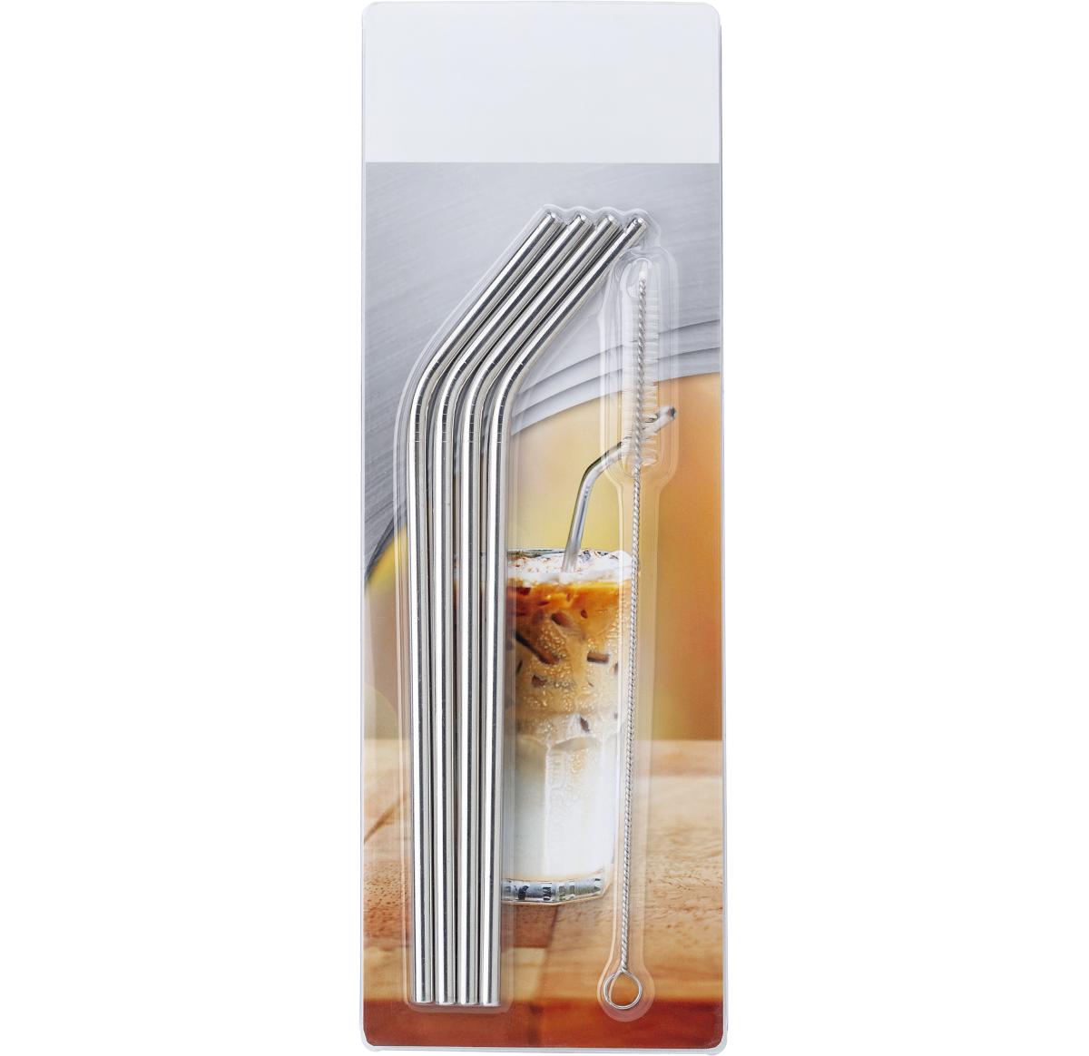 Four stainless steel, environmentally friendly drinking straws. Length of the straws is 23 cm. The set includes a cleaning brush.