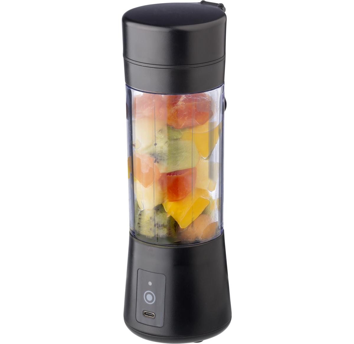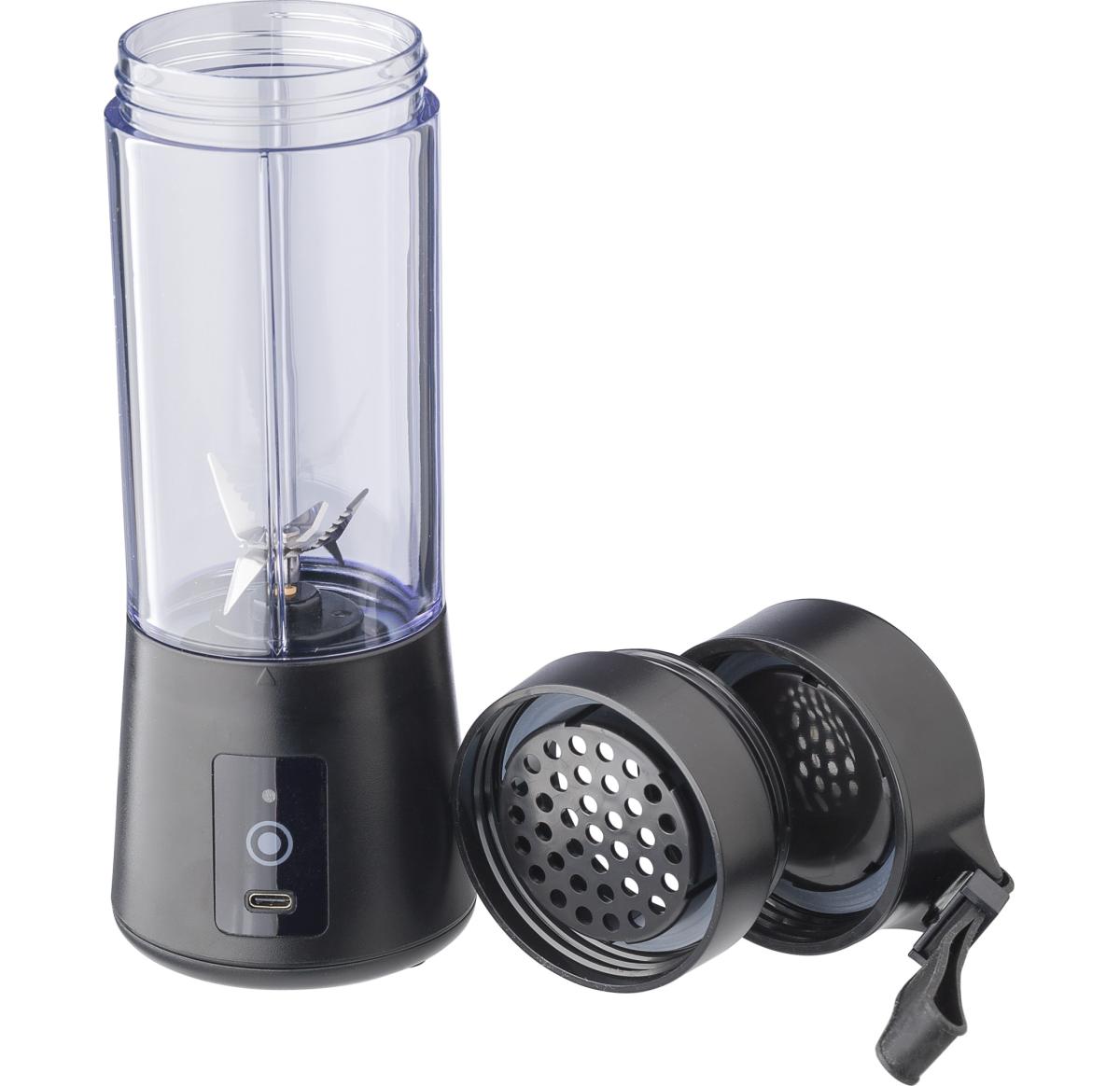 Food grade ABS and PC Electric blender. The cup has a capacity of 320 ml, with six blender blades at the bottom. Charging port: 5V / 1.5A. Battery: 2000mAh / 3.7 V. Motor speed up to 22000 rpm (without load).