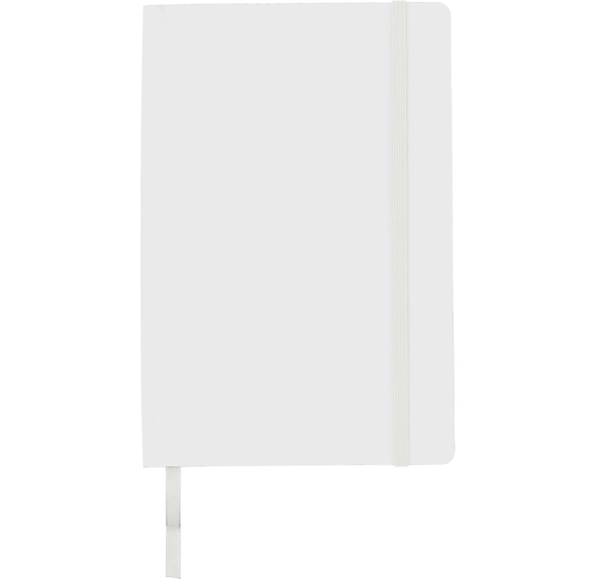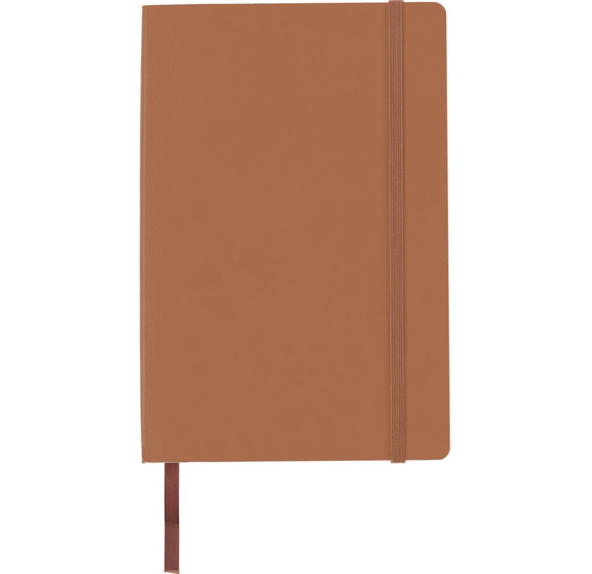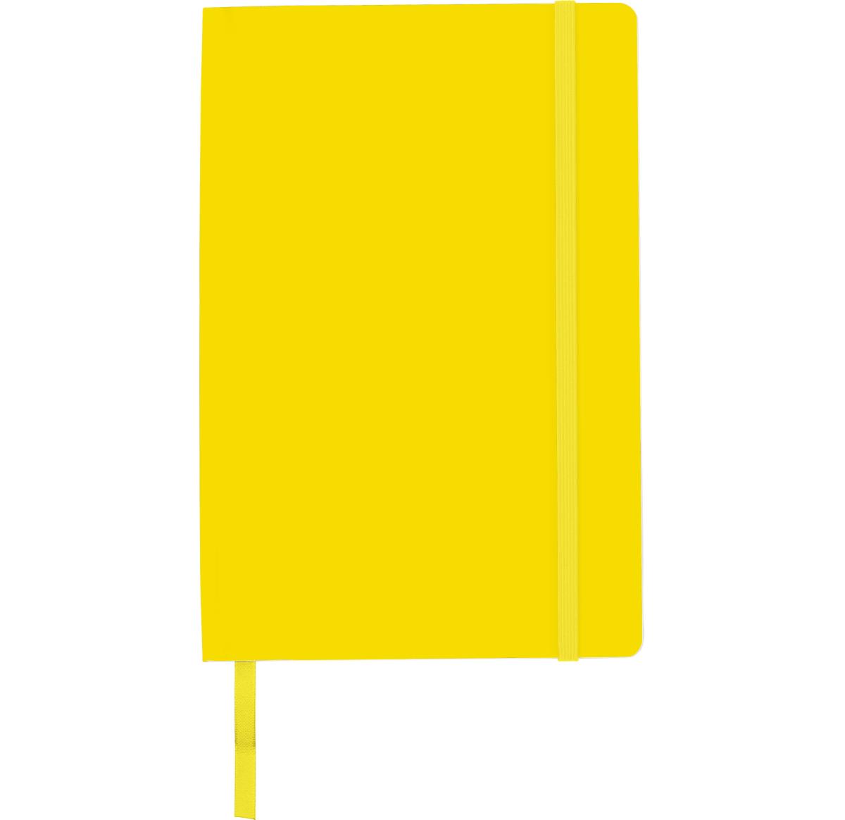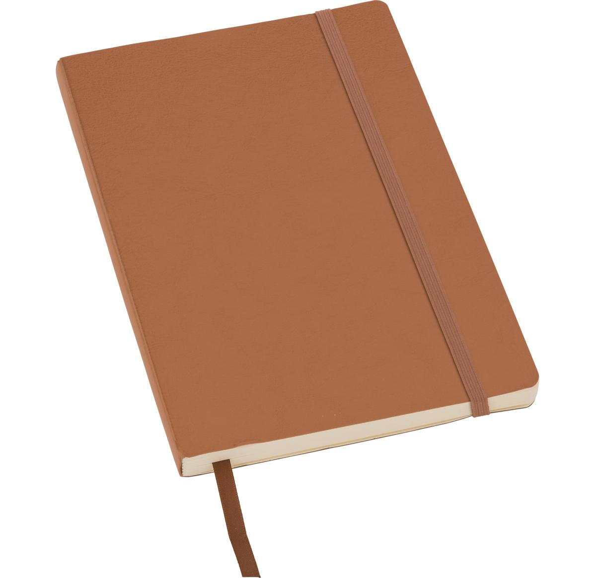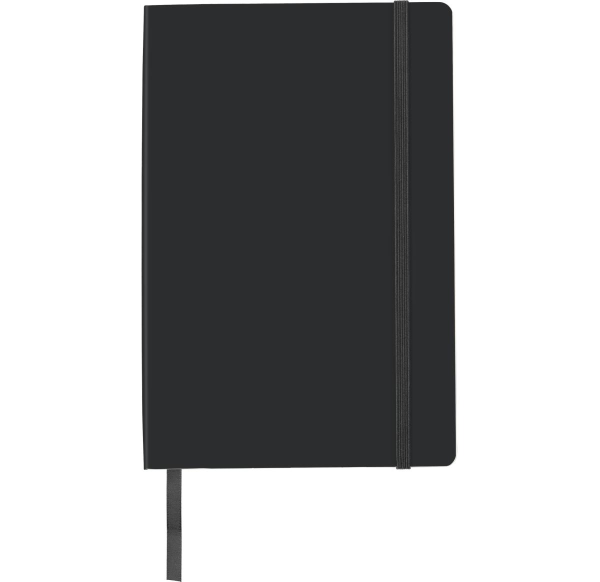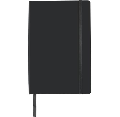 Soft cover notebook (approx. A5) with 80 ruled pages, an elastic strap over the cover, a ribbon bookmark and a pocket on the inside of the cover.