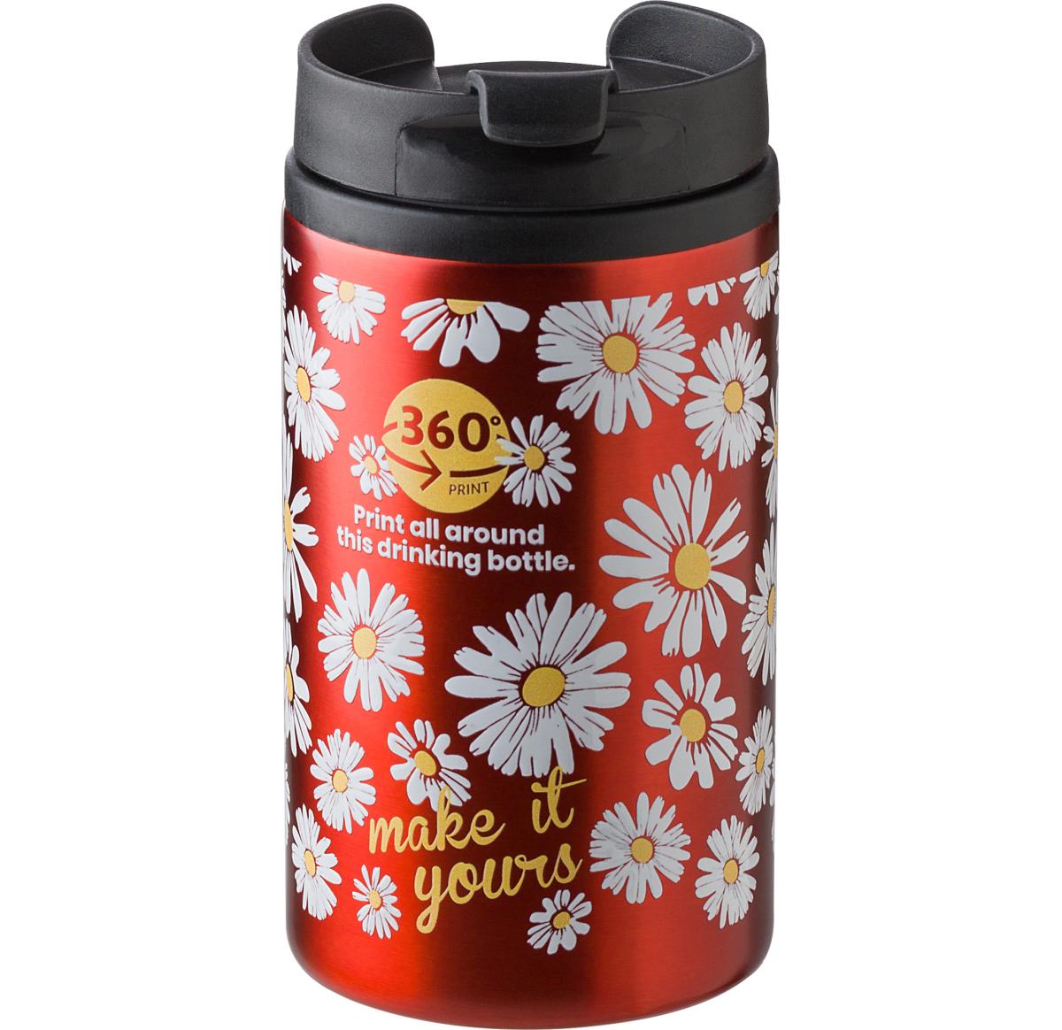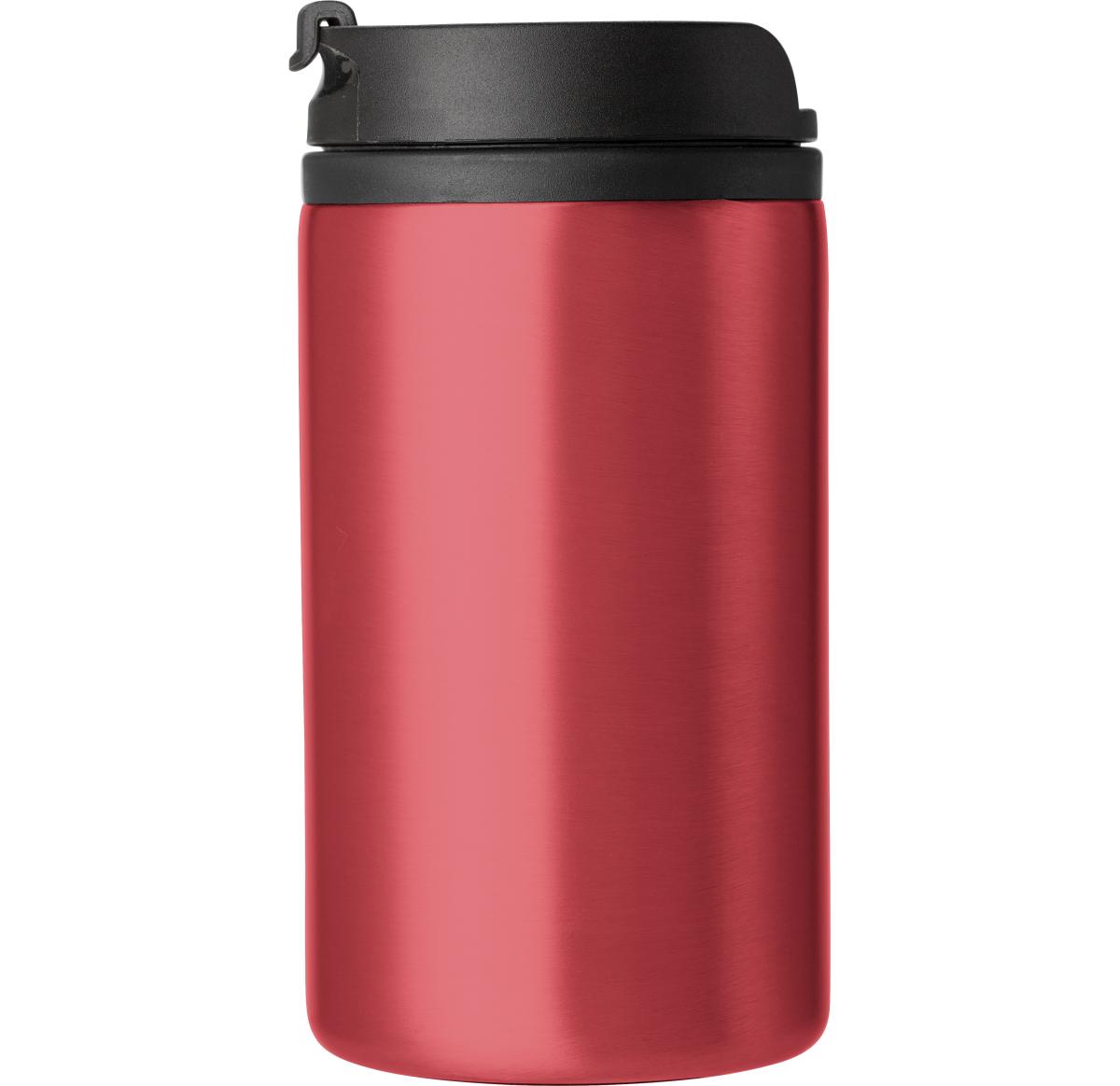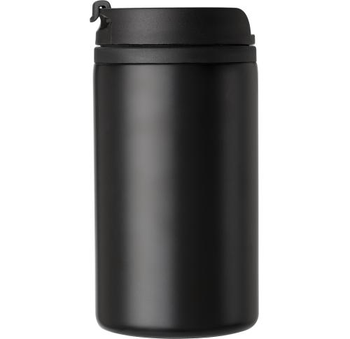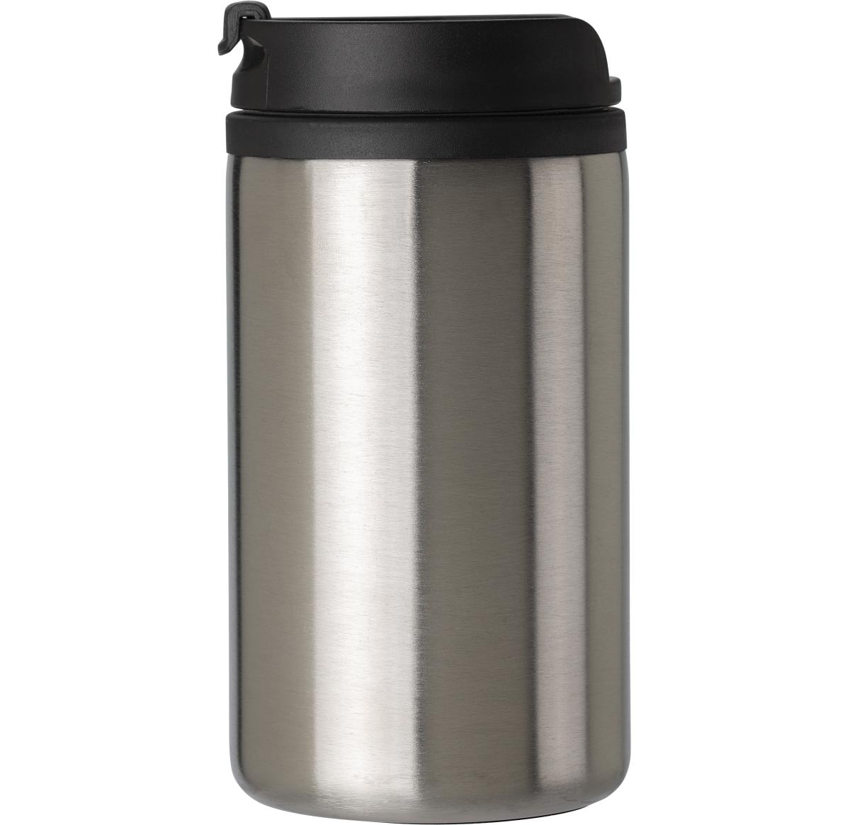 Double walled stainless steel thermos cup (300ml). The outer wall is stainless steel, the inner wall is plastic. The screw-on lid is leakproof and has a snap opening. The bottom of the cup is anti-slip. The double walled design keeps drinks hot or cold for several hours and prevents condensation on the outside of the cup.
