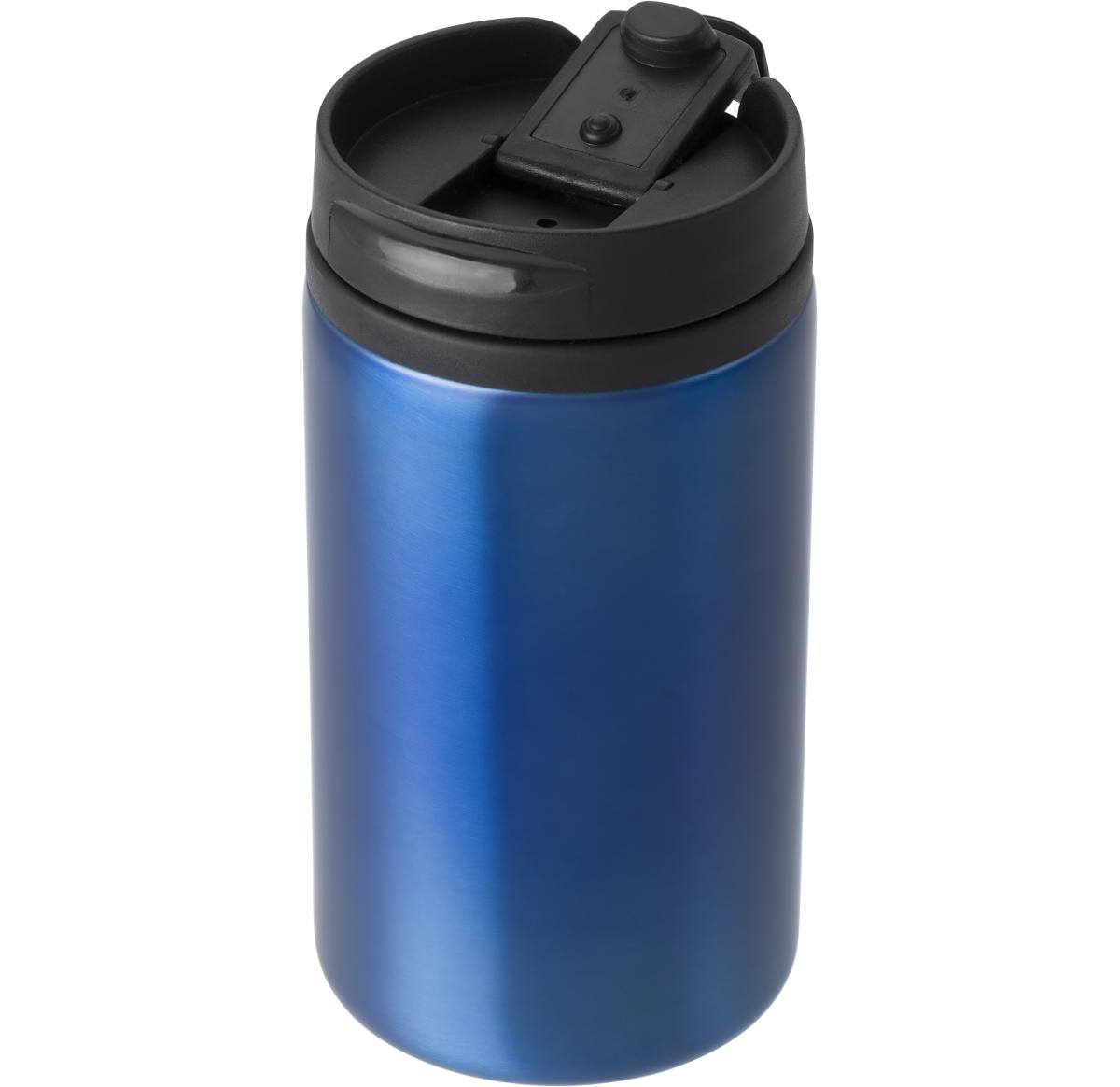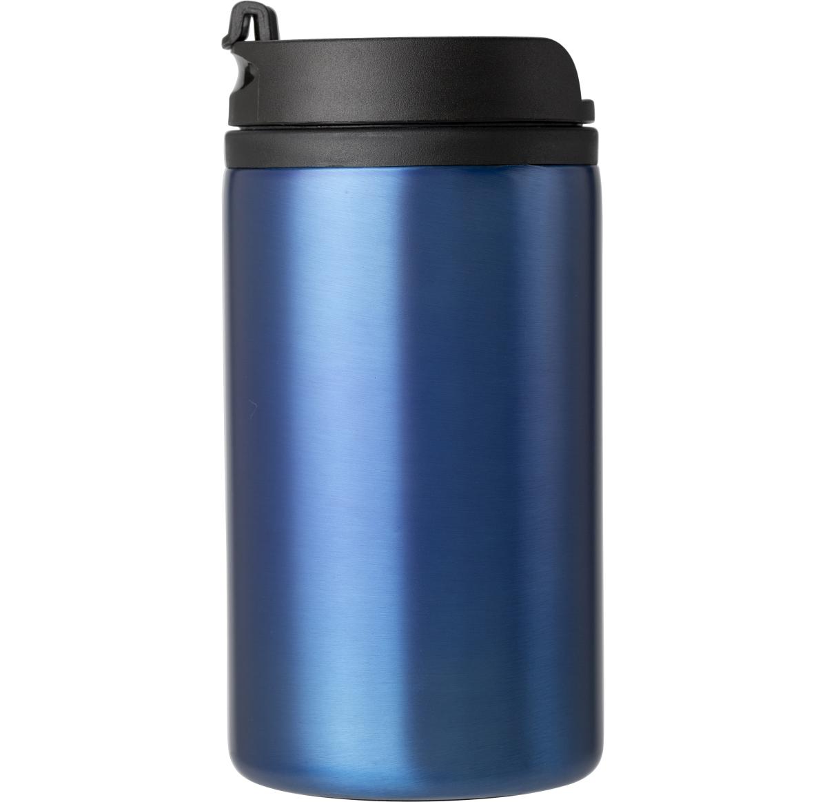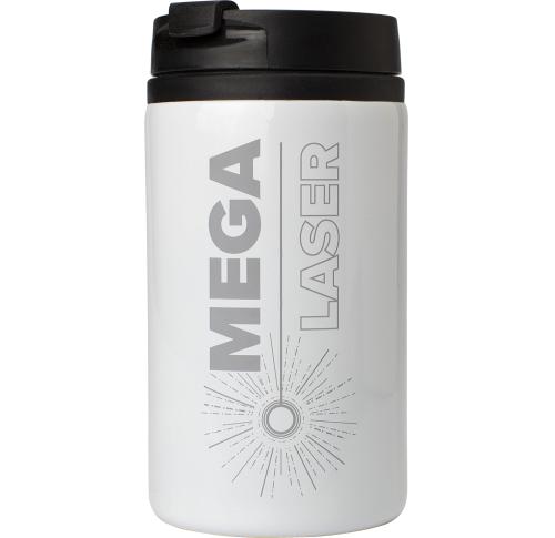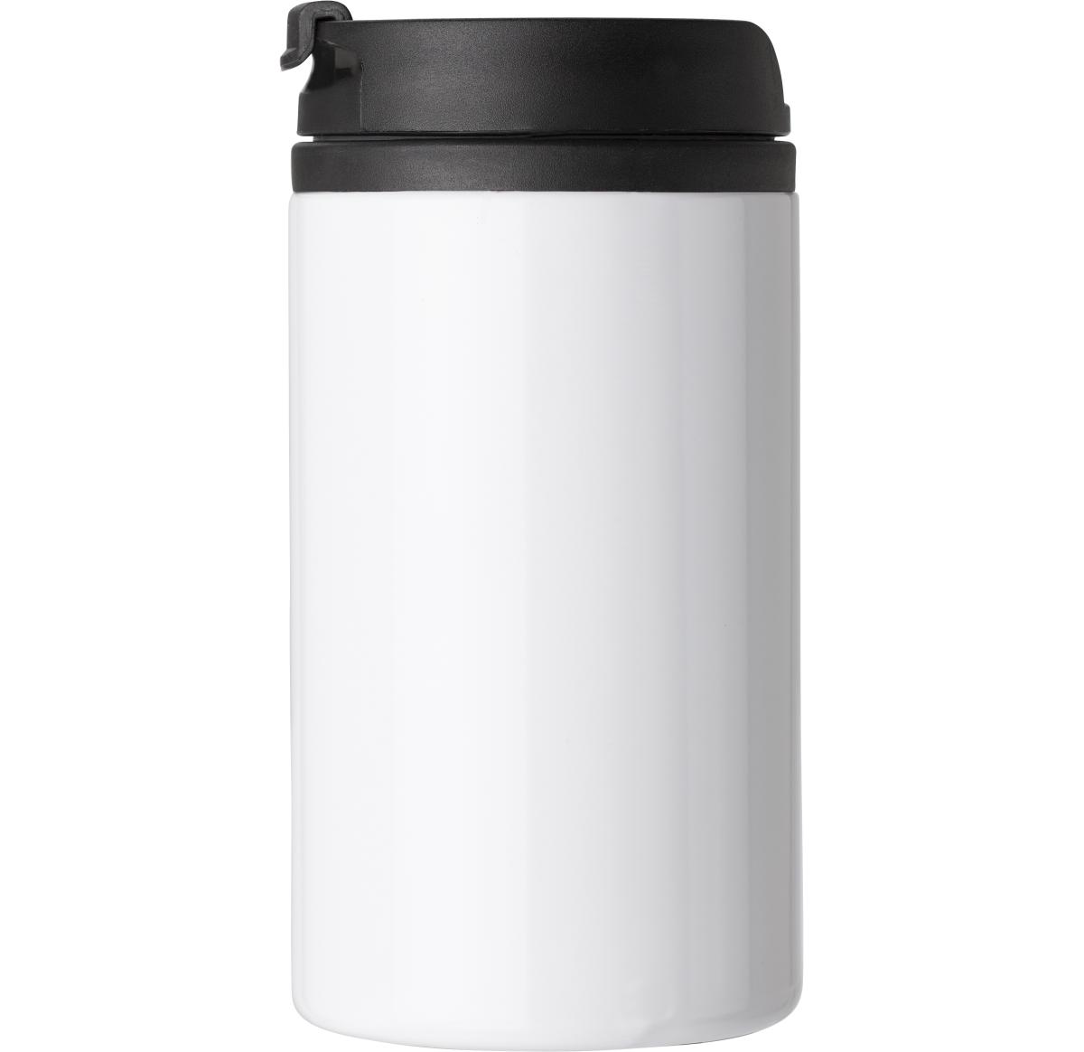 Double walled stainless steel thermos cup (300ml). The outer wall is stainless steel, the inner wall is plastic. The screw-on lid is leakproof and has a snap opening. The bottom of the cup is anti-slip. The double walled design keeps drinks hot or cold for several hours and prevents condensation on the outside of the cup.