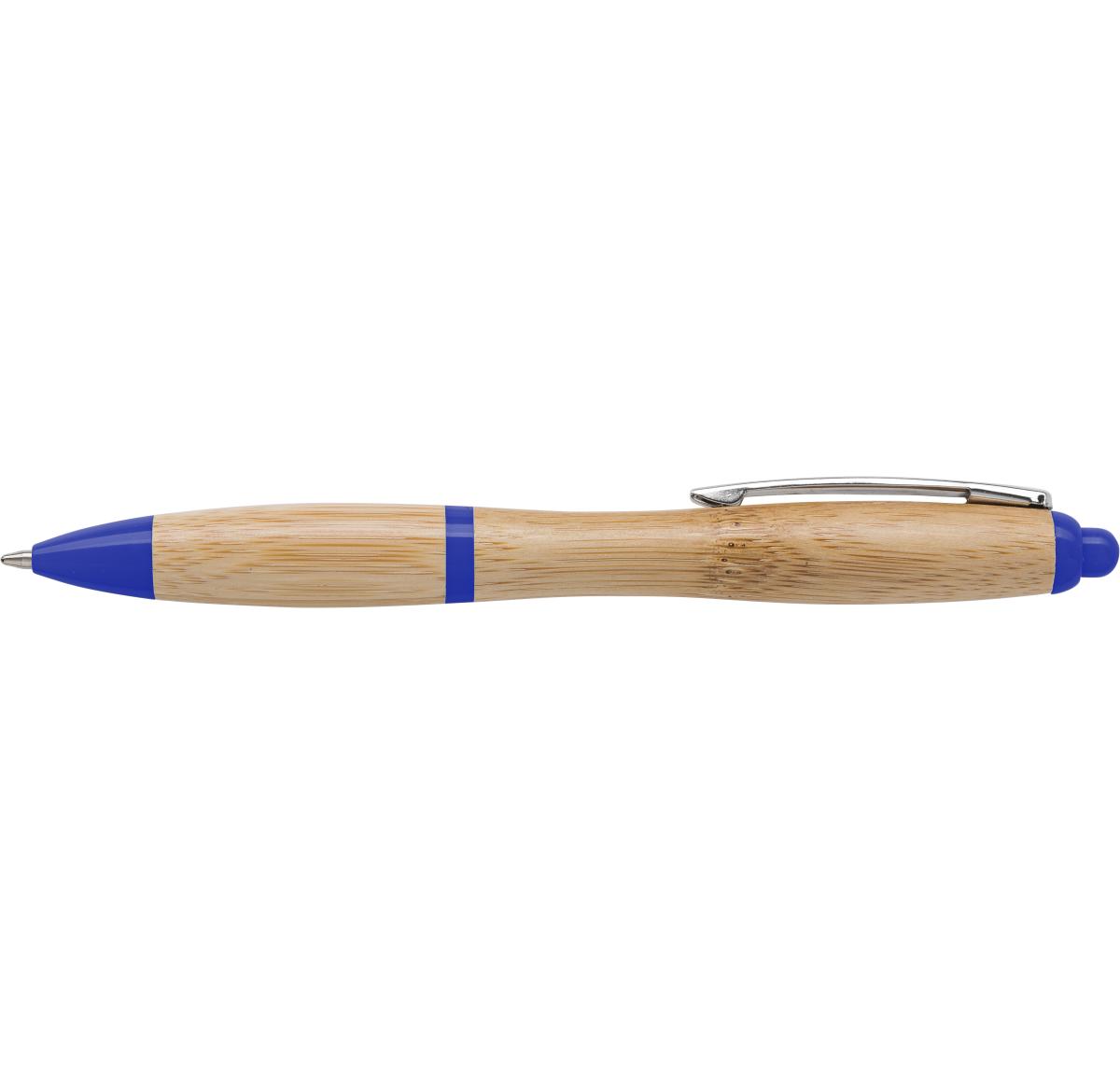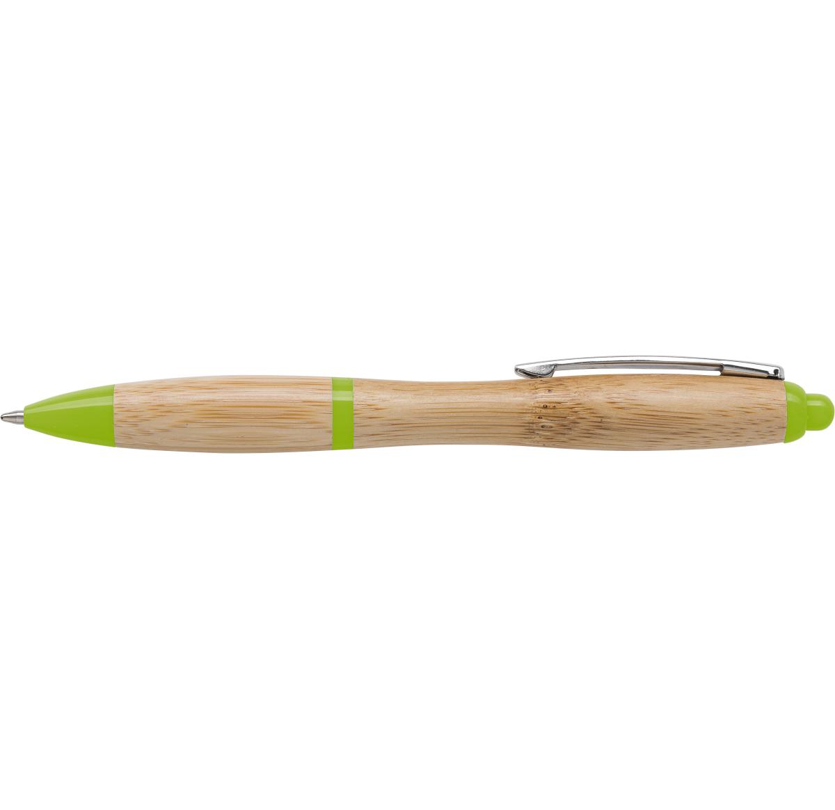 Bamboo ballpen with coloured plastic trim parts, a metal clip and blue ink.