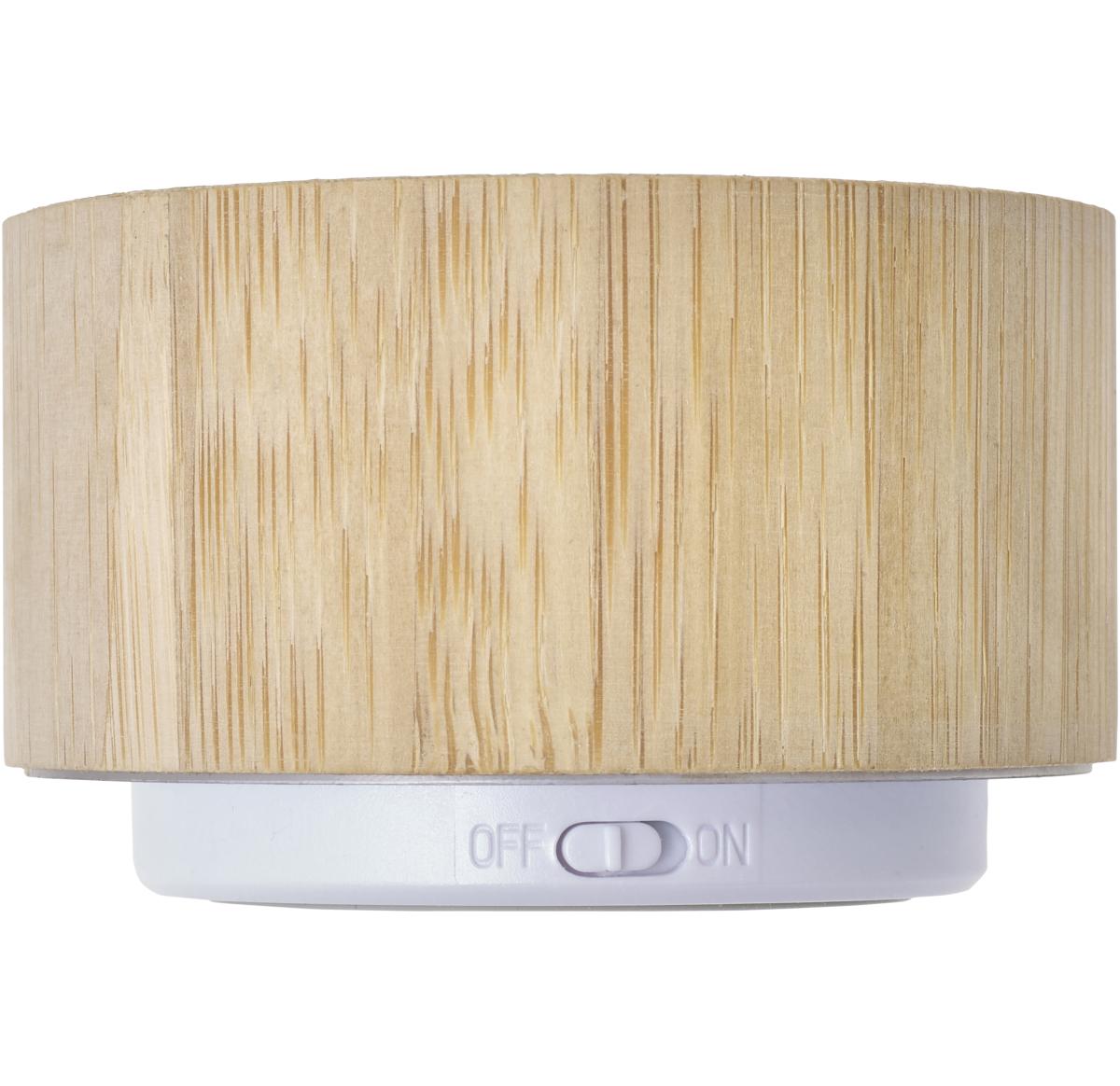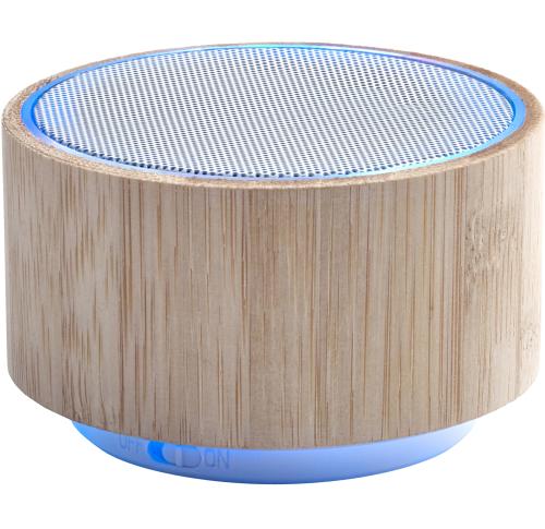 Bamboo wireless speaker with multi-coloured lights. The 3w speaker has a rechargeable 3 mAh li-ion battery and includes a Micro USB cable.