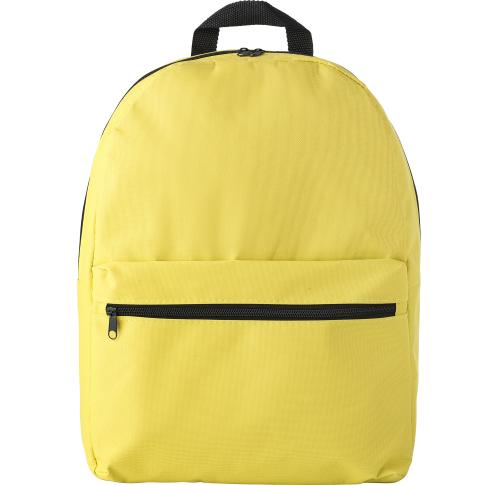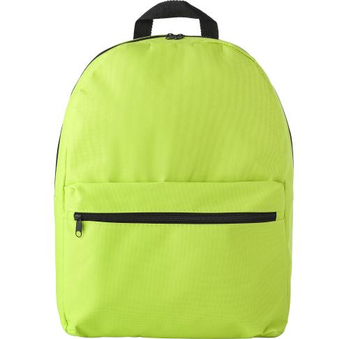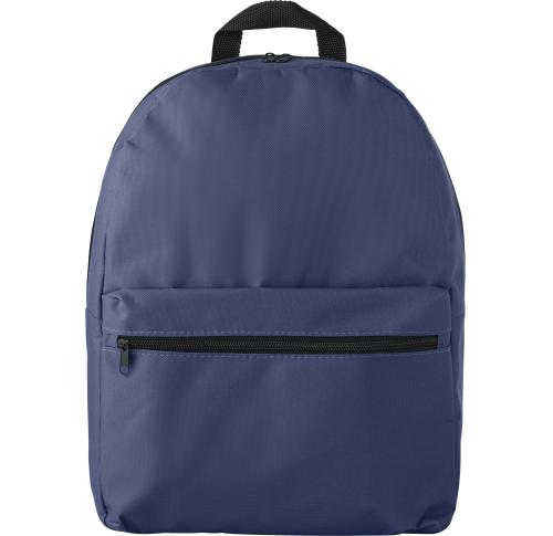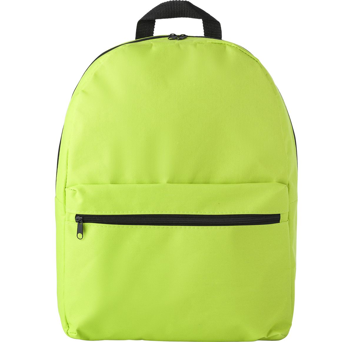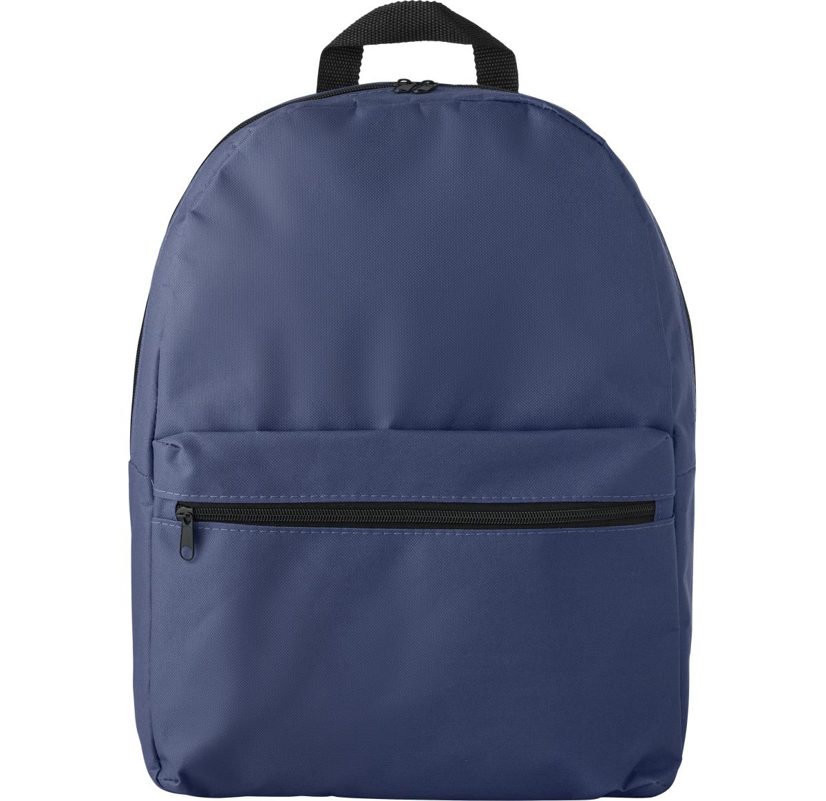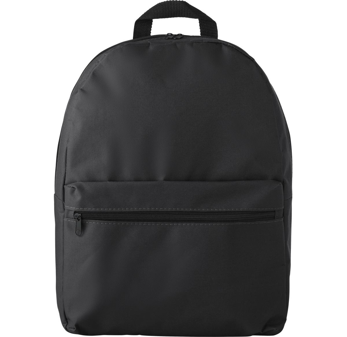 Polyester (600D) backpack with zipper on the main compartment and front pocket. The bag has adjustable, padded shoulder straps.