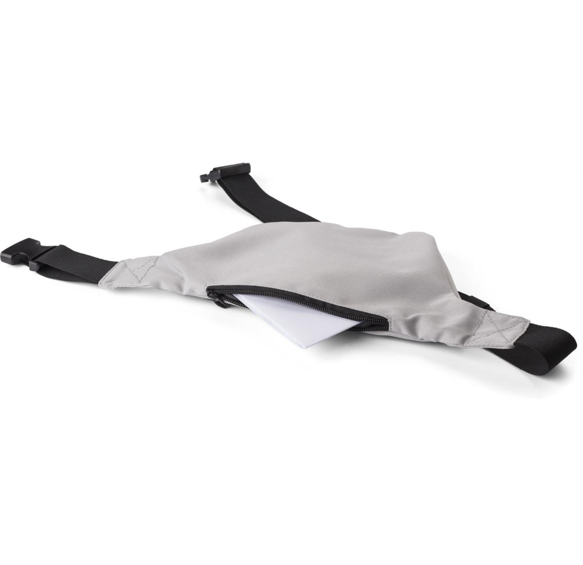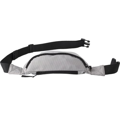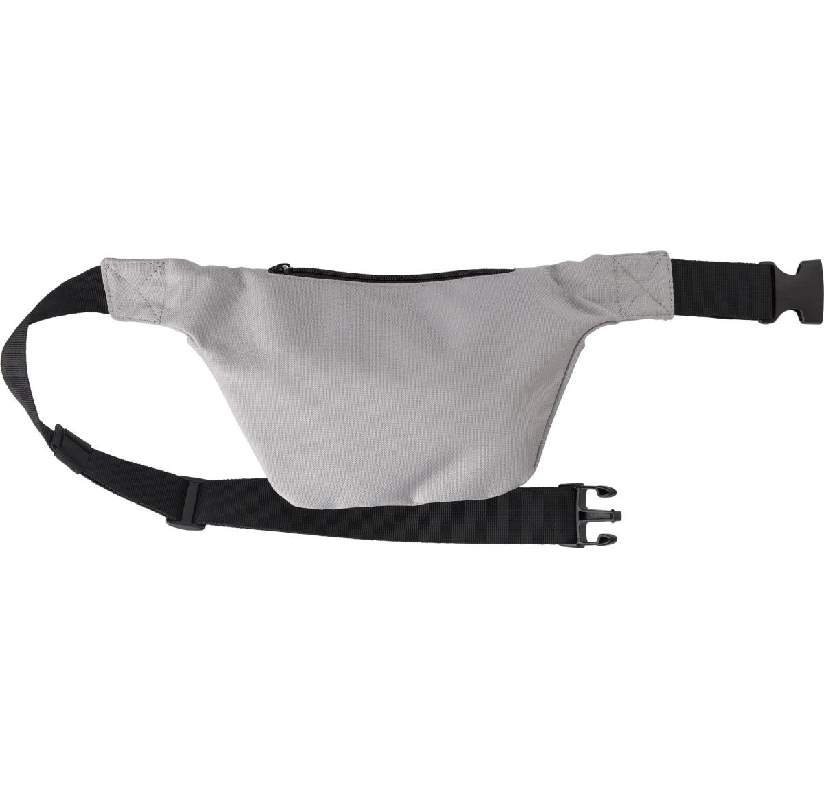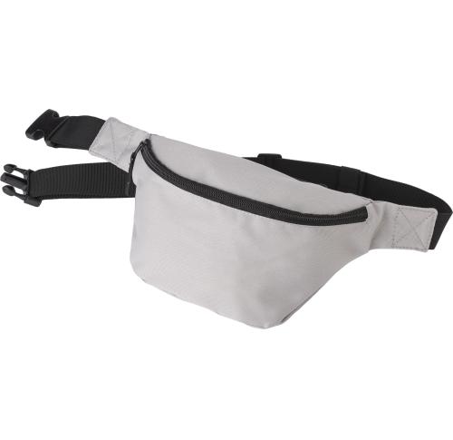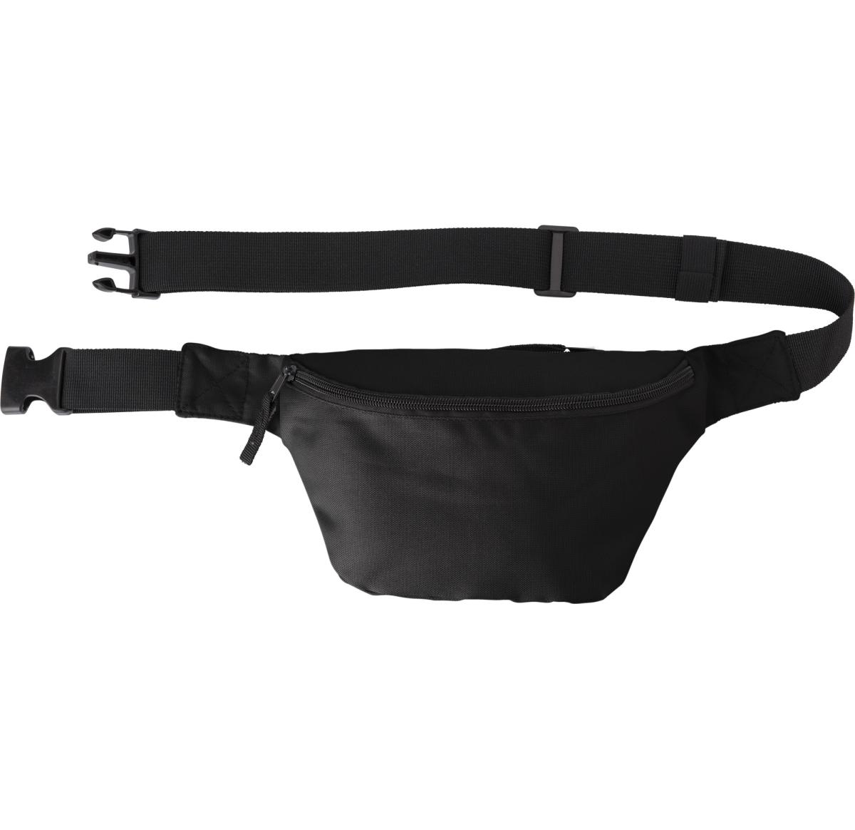 Polyester (600D) waist bag with one front pocket and one small pocket on the backside. Both pockets can be closed by a zipper. With black adjustable strap with firm buckle closure.