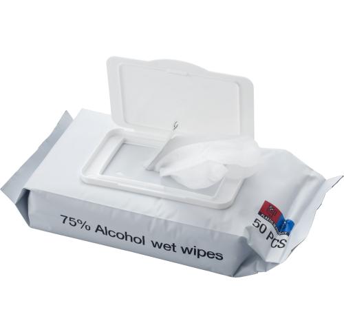 Sealed pouch with 50 pcs of wet tissues (75% alcohol).