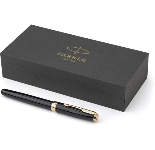 Stainless steel and lacquered brass Parker Sonnet rollerball pen with cap. Black ink. Including giftbox