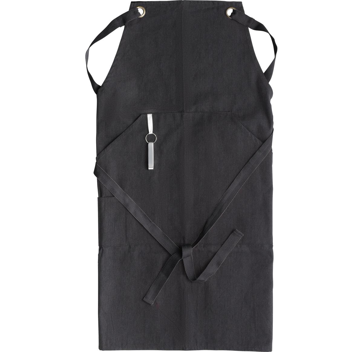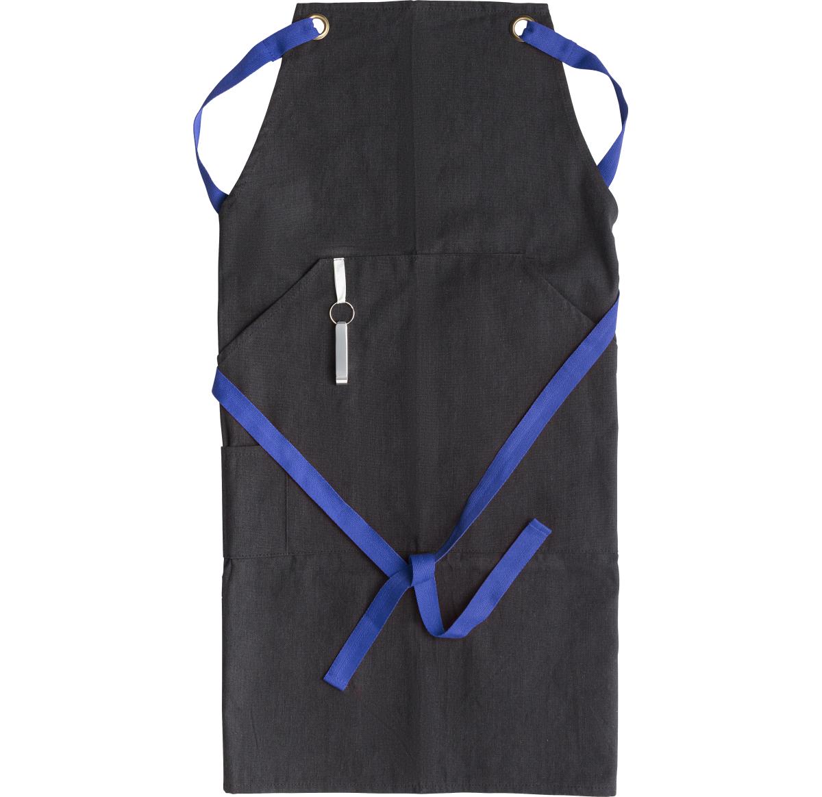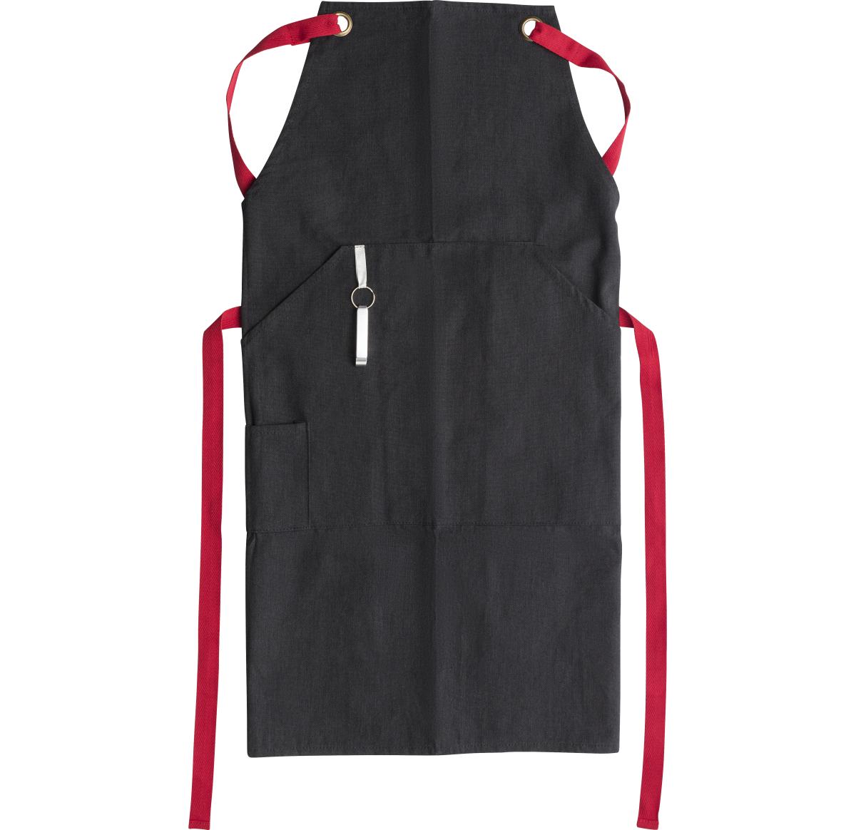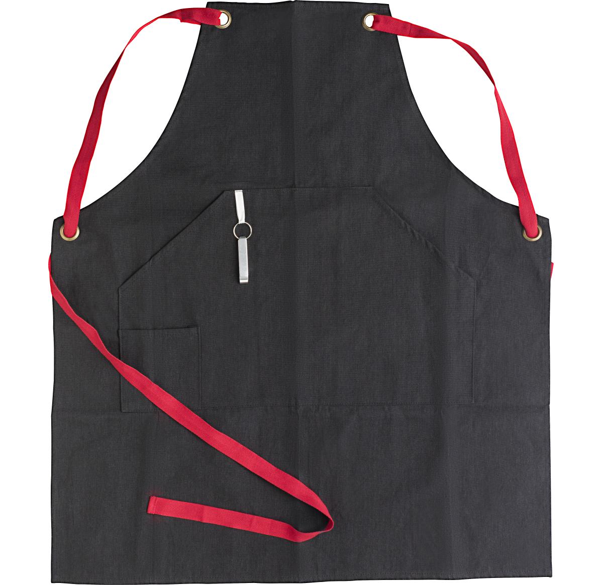 Polyester and cotton apron with coloured bands and front pocket. Includes bottle opener