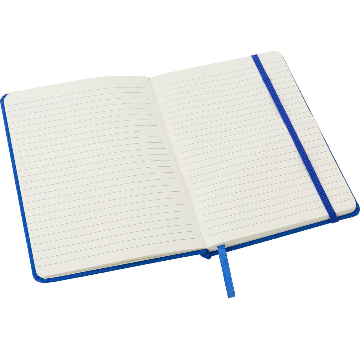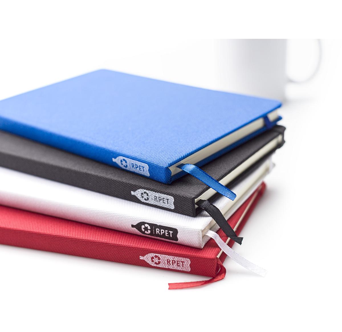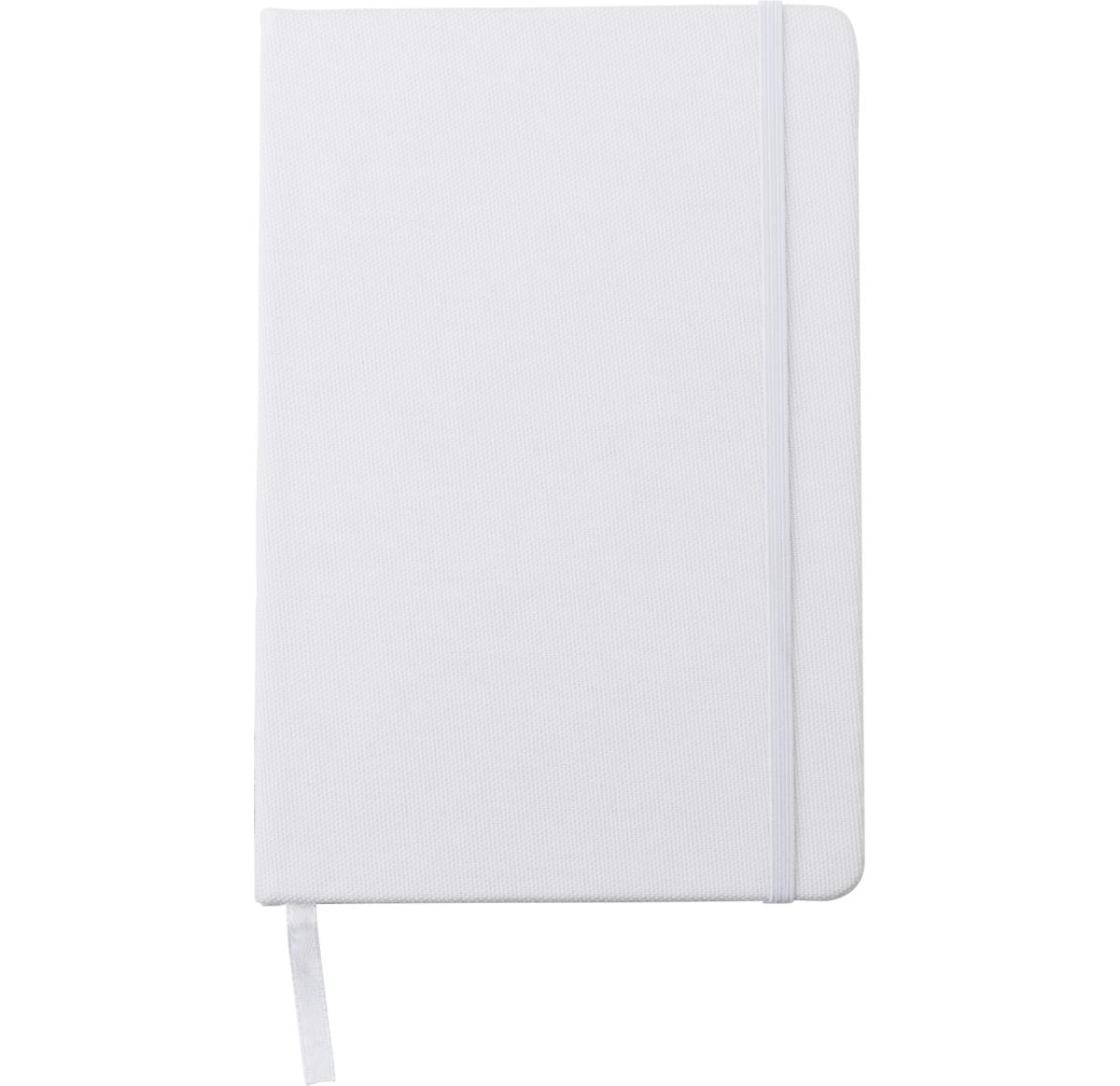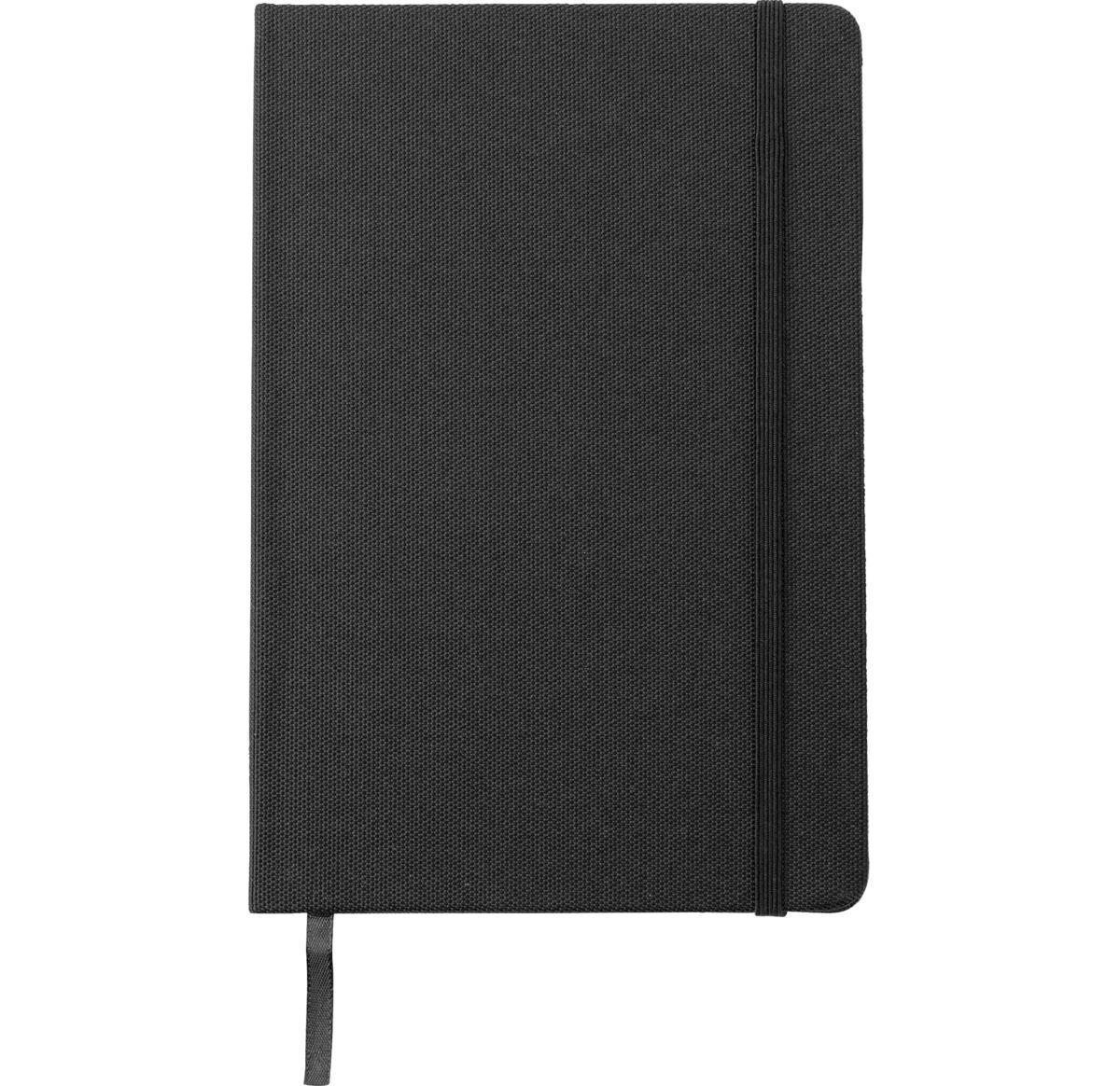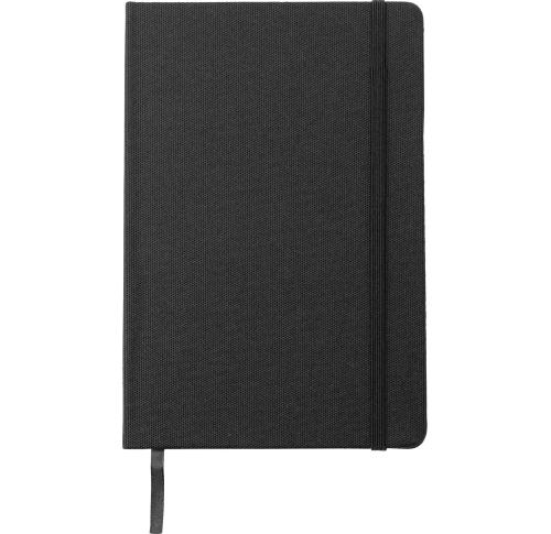 A5 RPET and PU Notebook with elastic closure and ribbon bookmark. Notebook has 80 lined pages of 70gsm paper.