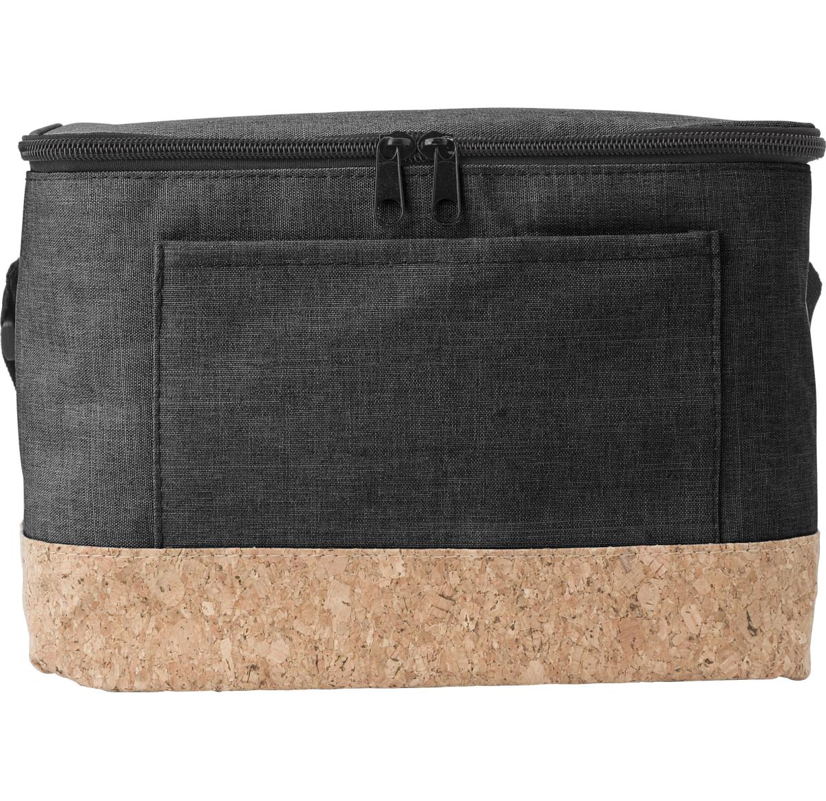Cool bag made from polyester (600D) and cork. Interior material is EVA. The bag can hold six cans of 0.5 litres