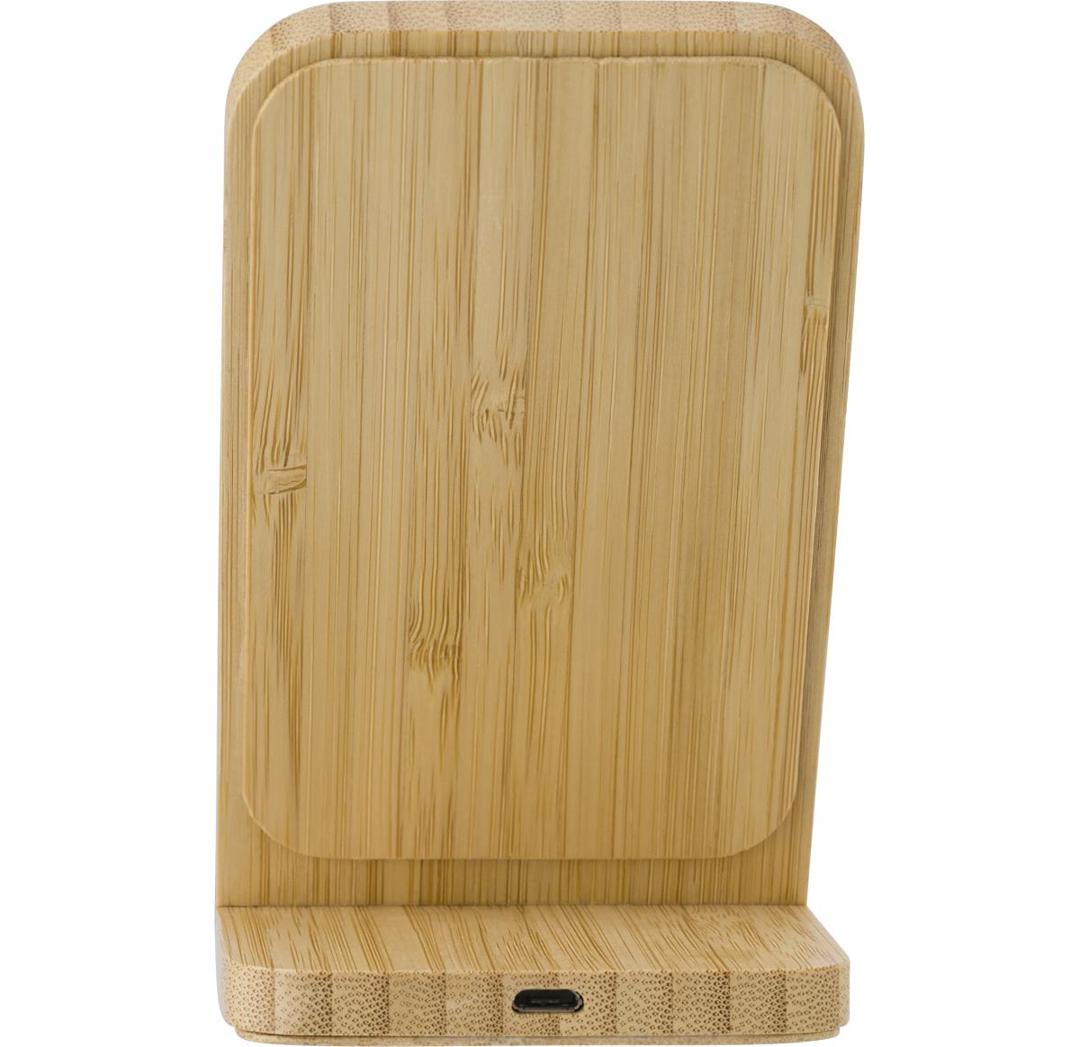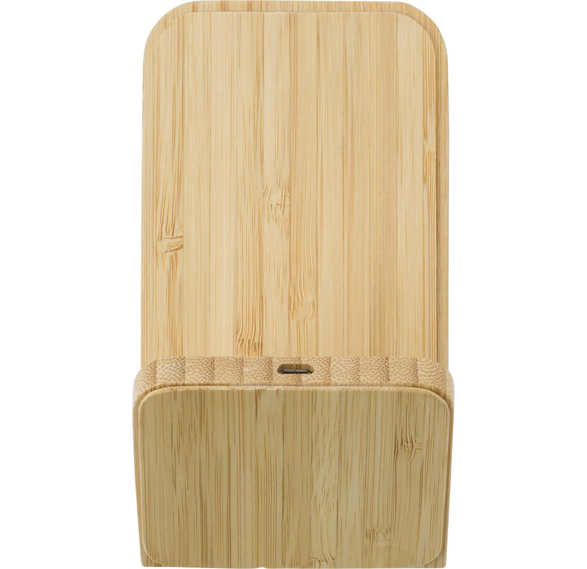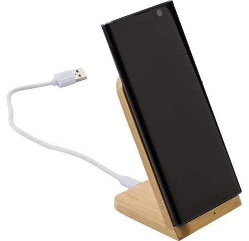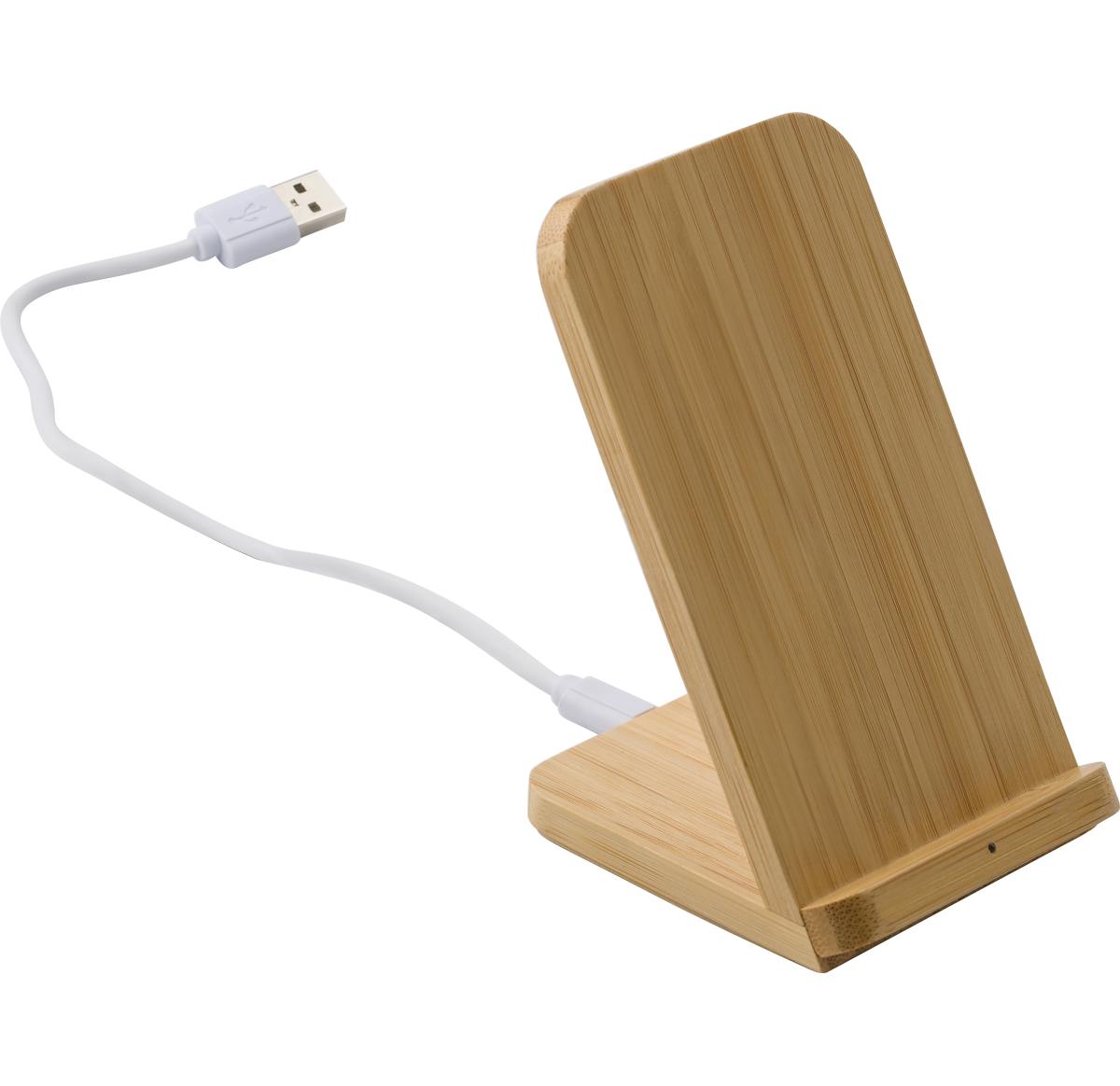 Bamboo phone holder with wireless charger (5W). Output DC5V/1A. Includes micro USB - USB charging cable.