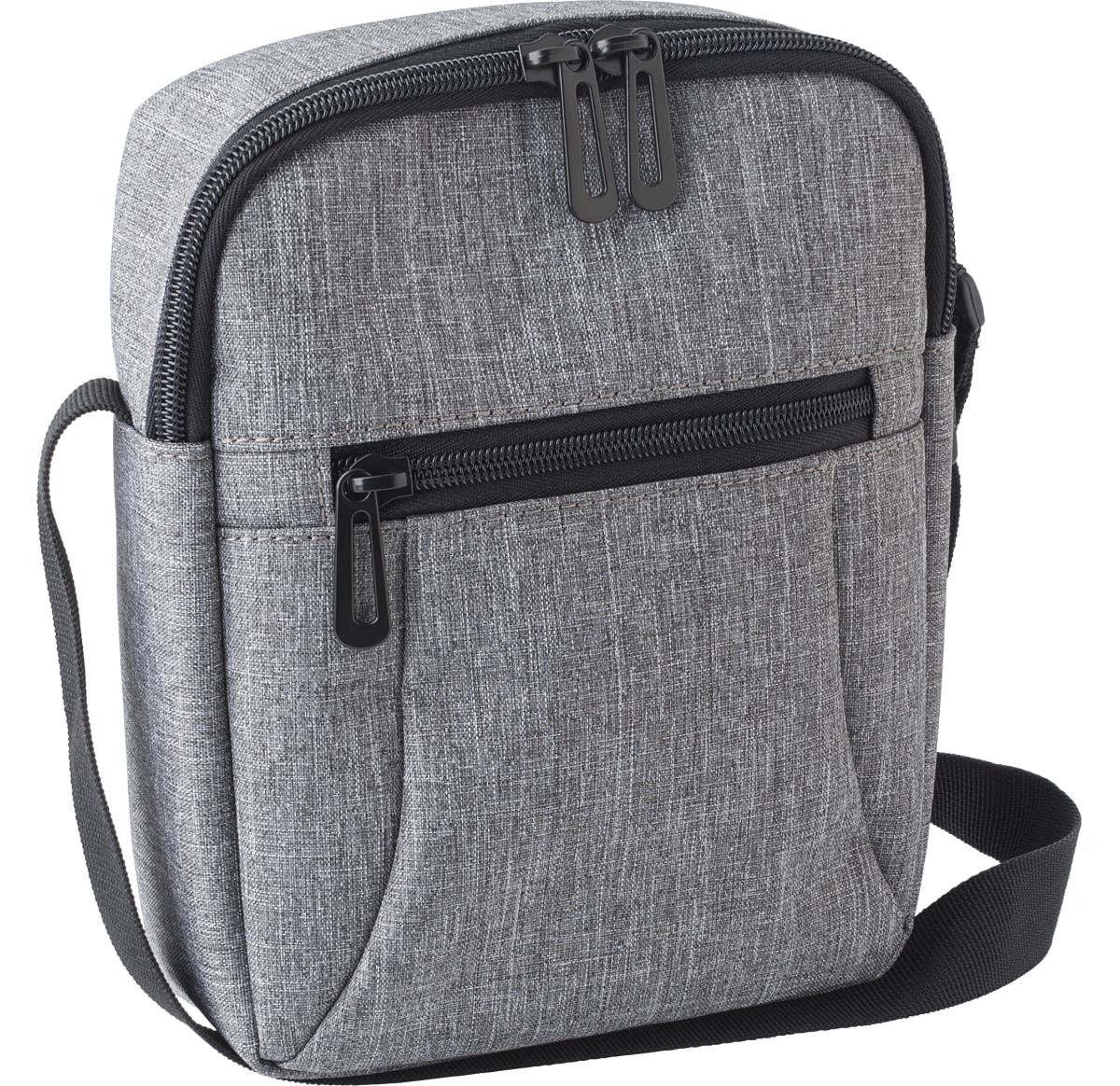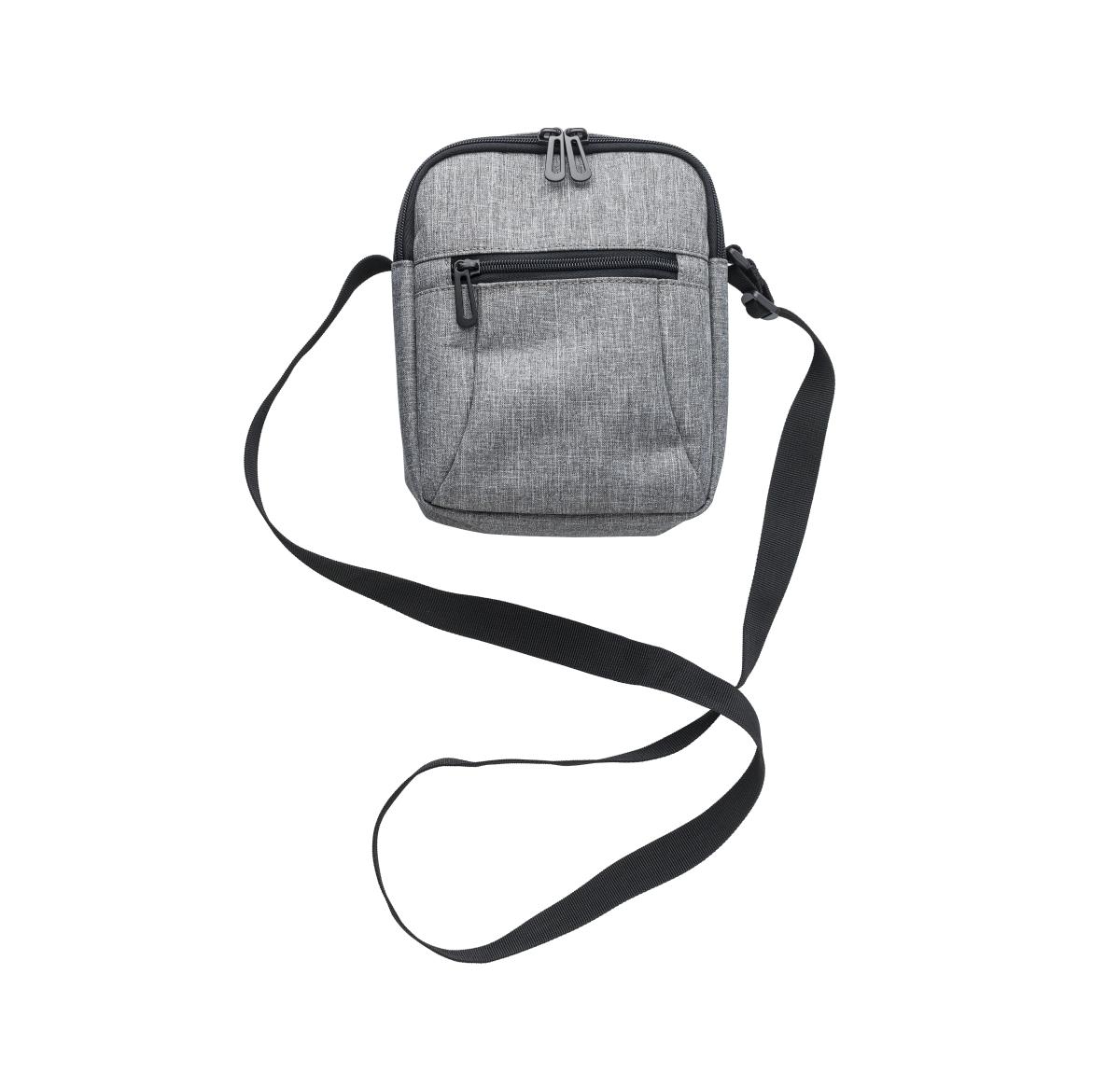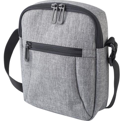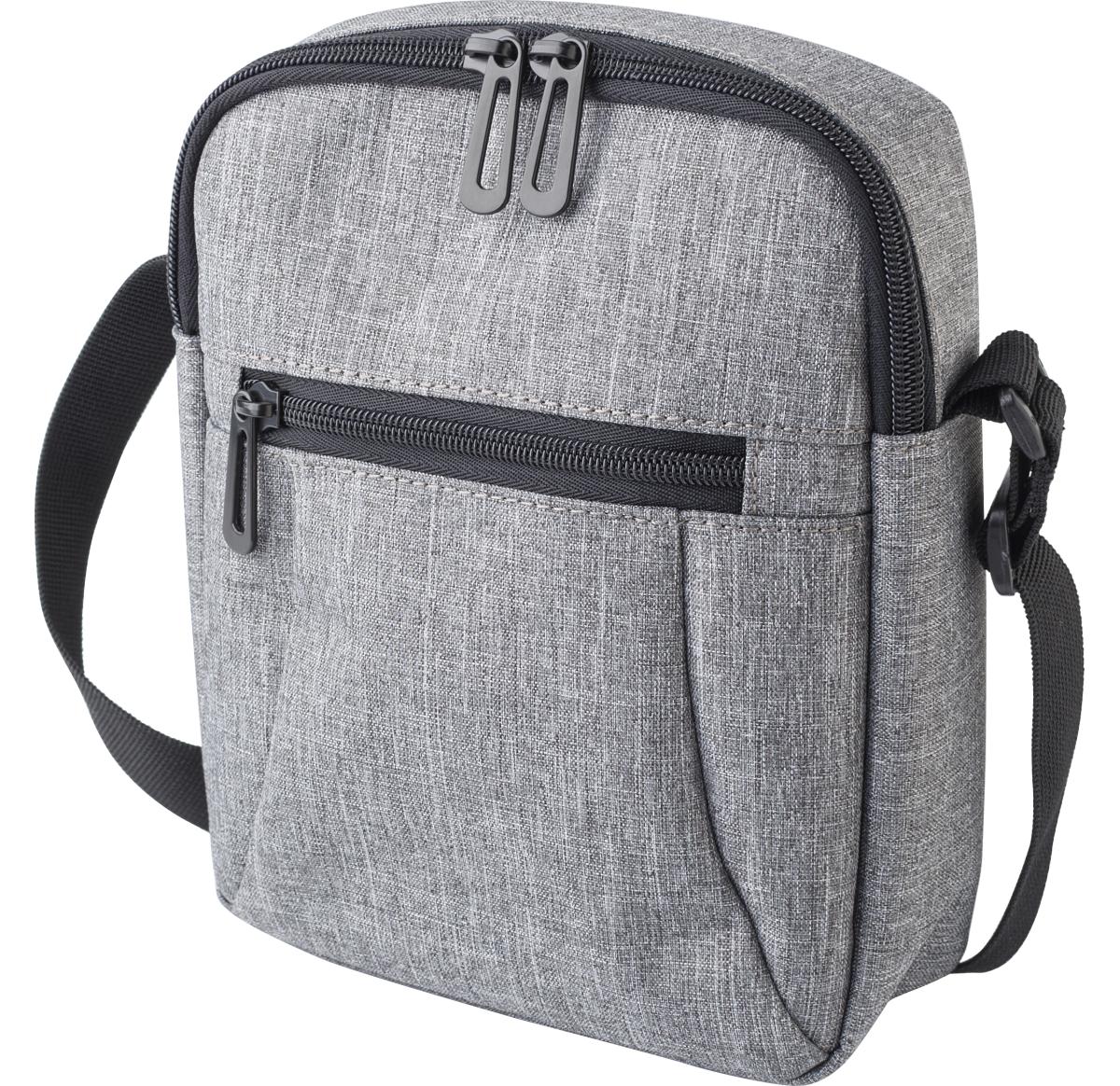Polyester shoulder bag, main compartment and front pocket with zipper and an interior pouch. Adjustable shoulder strap.