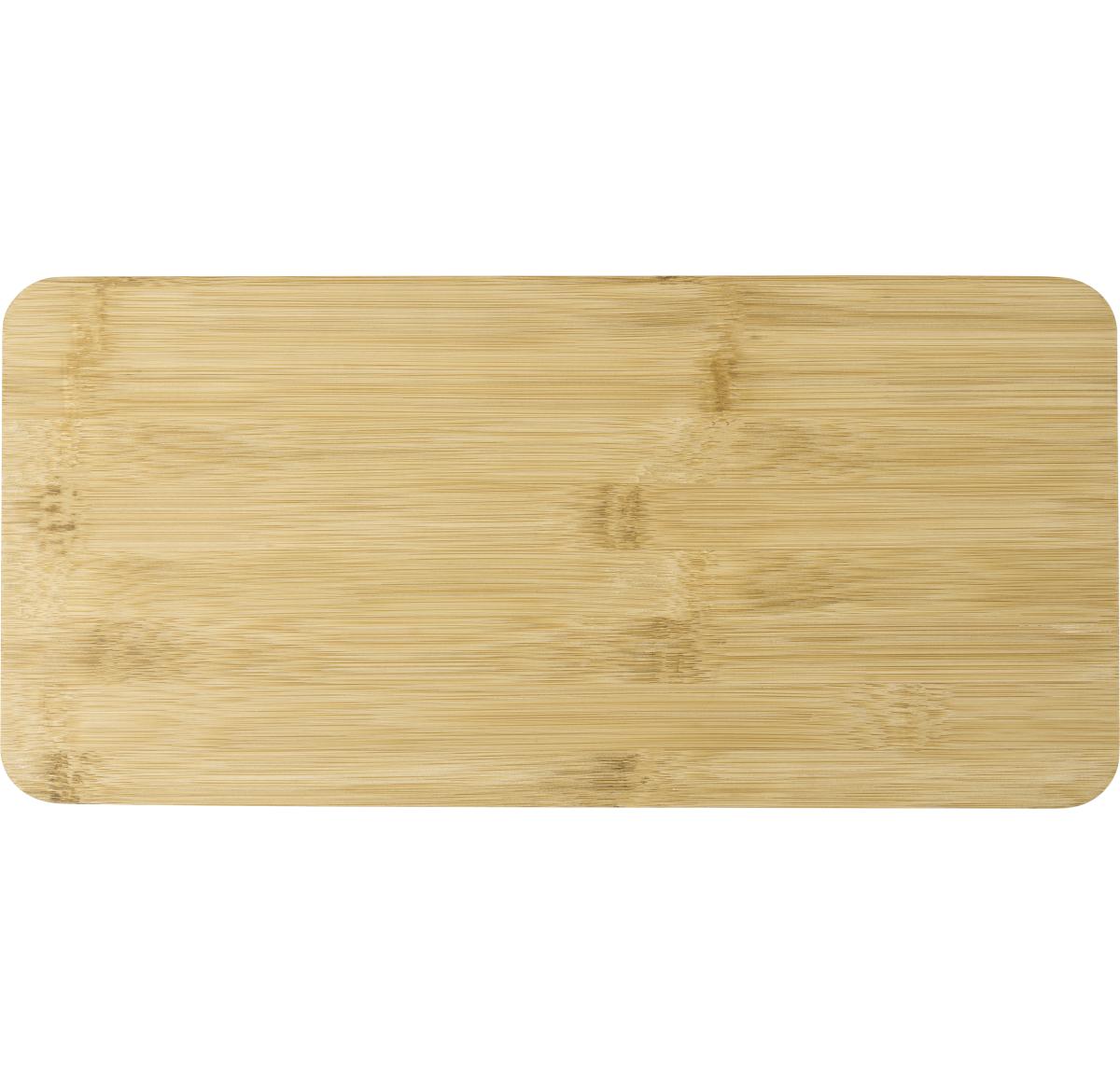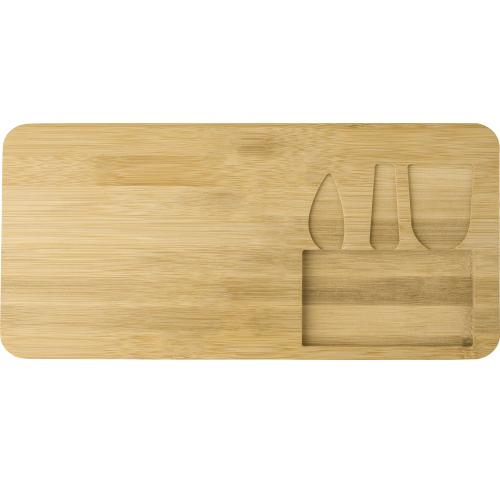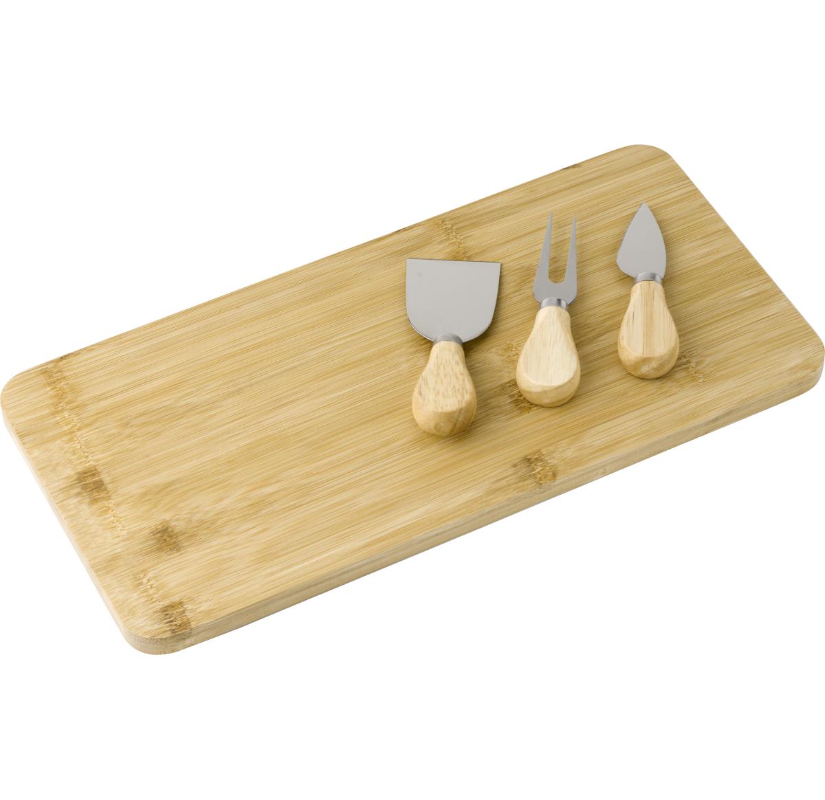 Bamboo cheese board with three utensils, which fit inside cut-outs on the board. Individually packed in brown cardboard box