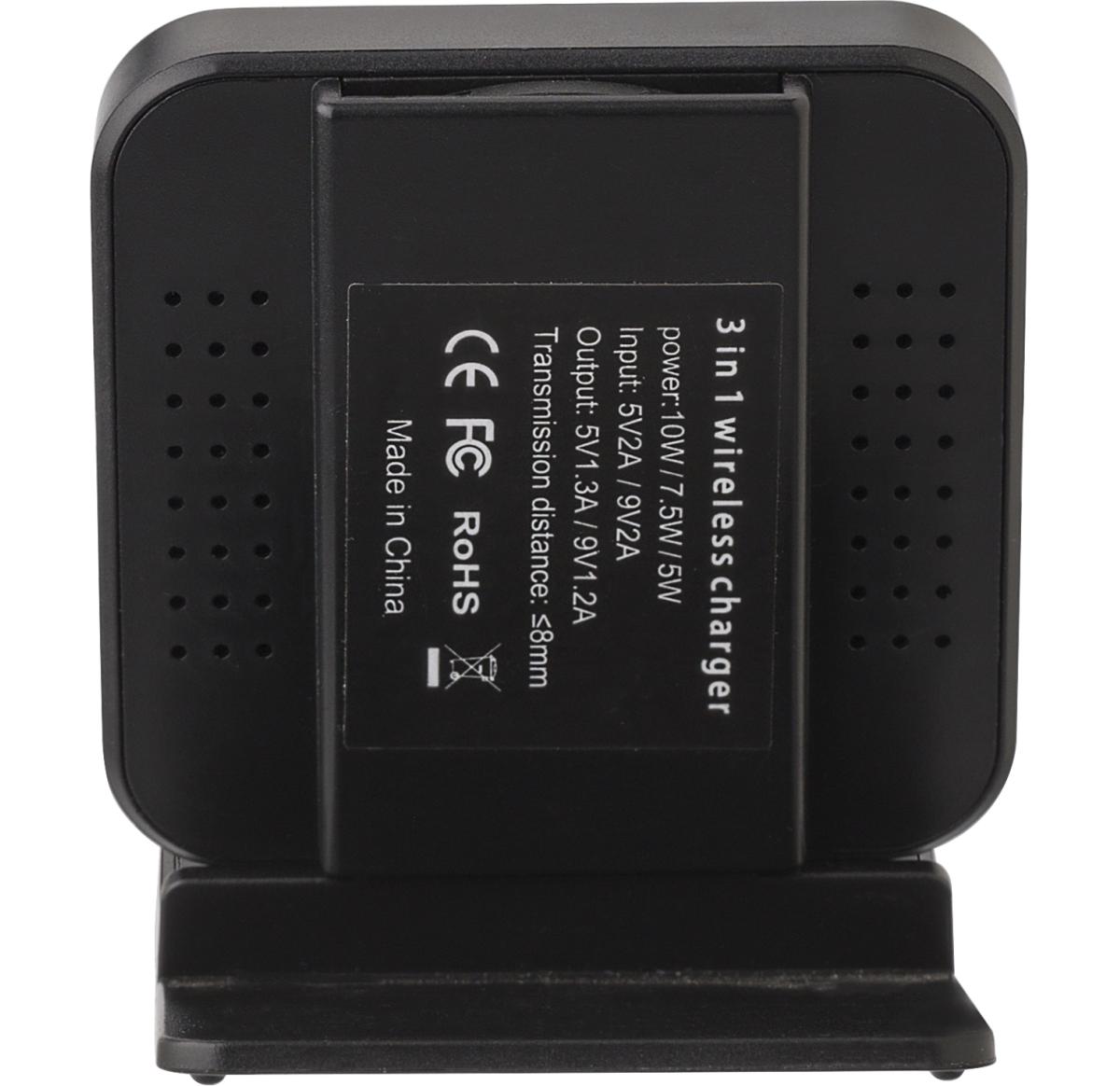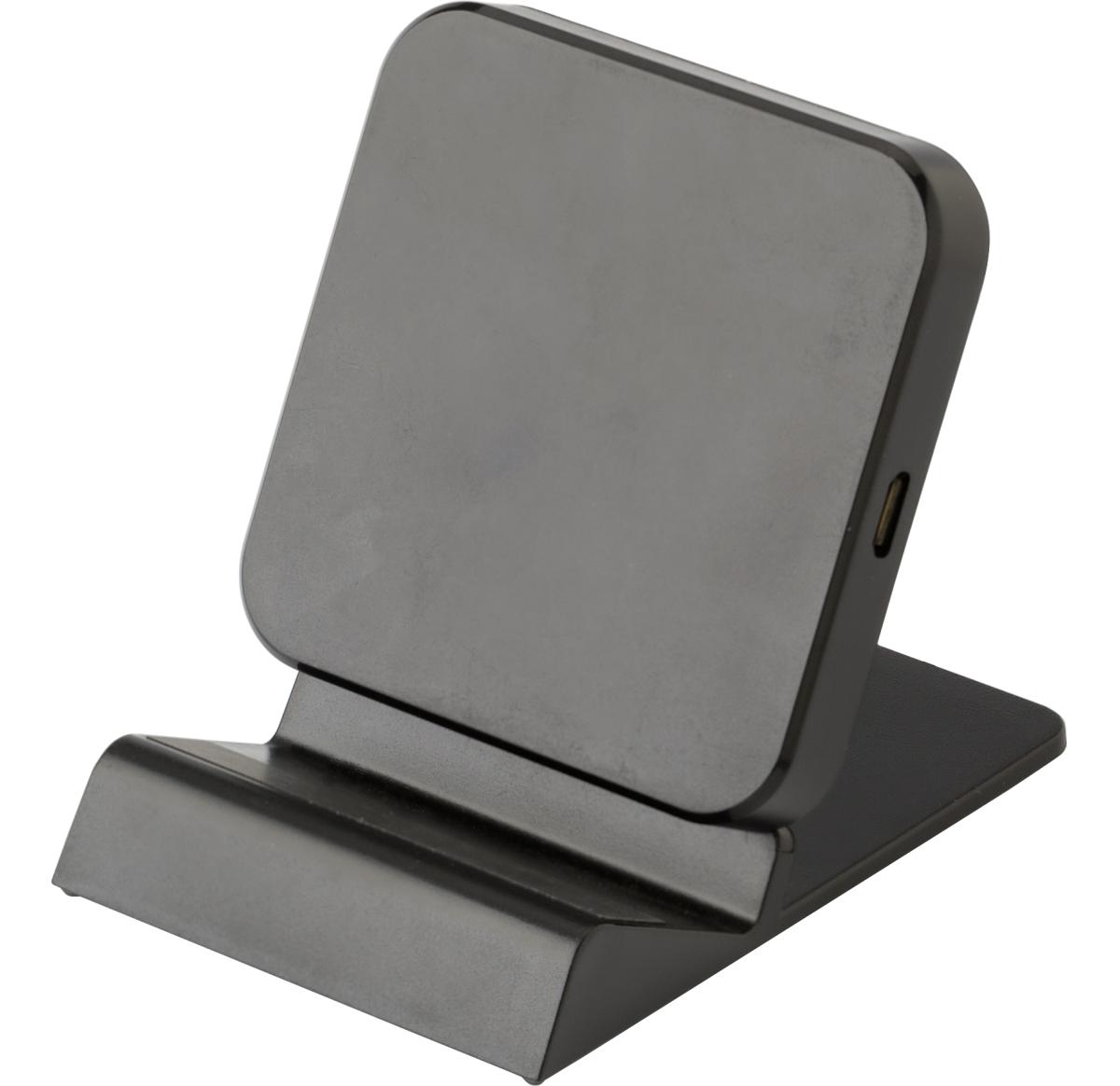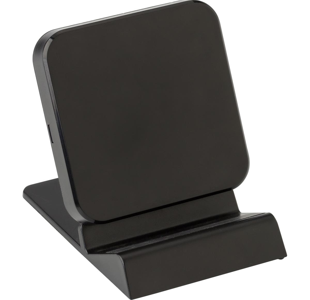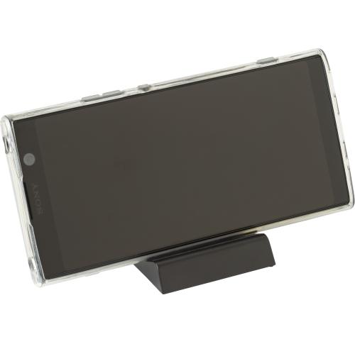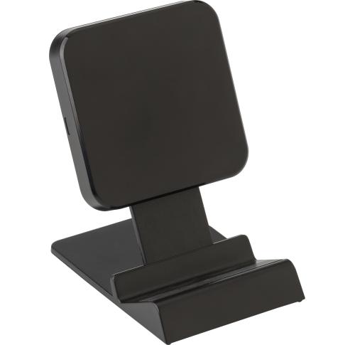 Plastic wireless charger and phone stand. The charging pad is adjustable in height. Stand is suitable for both portrait and landscape mode. Rechargeable via micro USB port. Input: 5V2A/9V2A, output: 5V1.3A/9V1.2A.