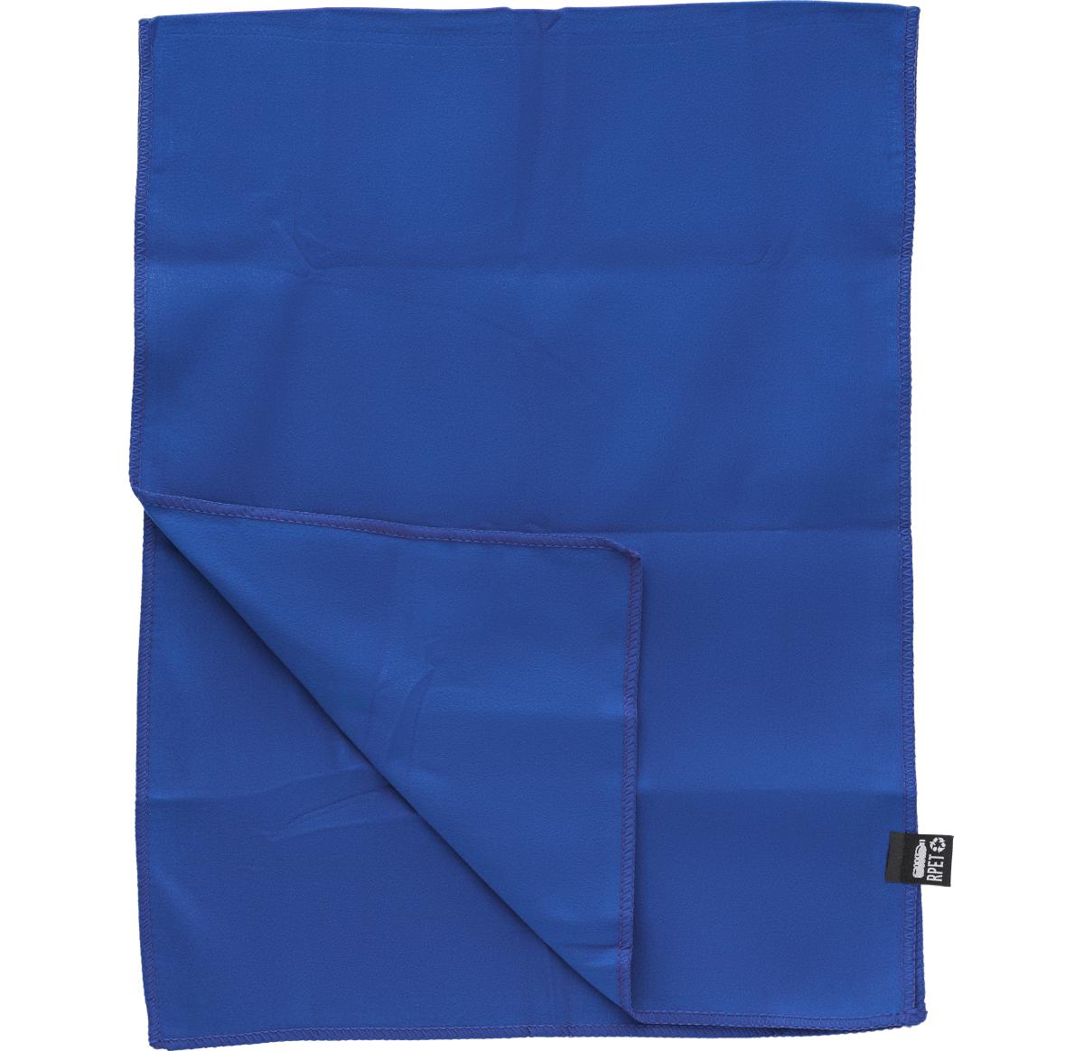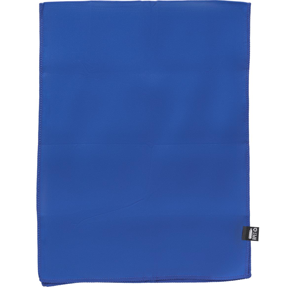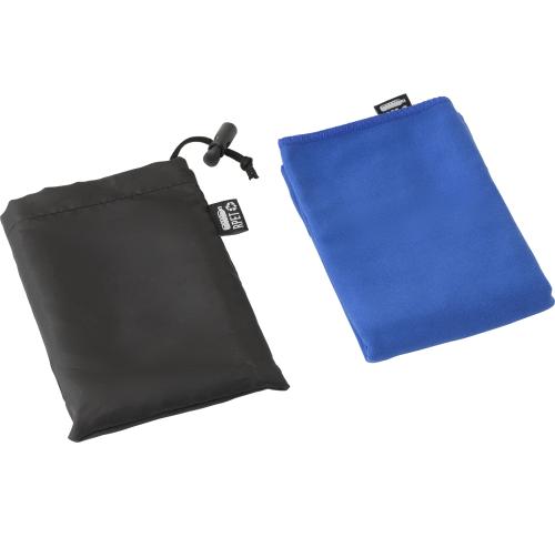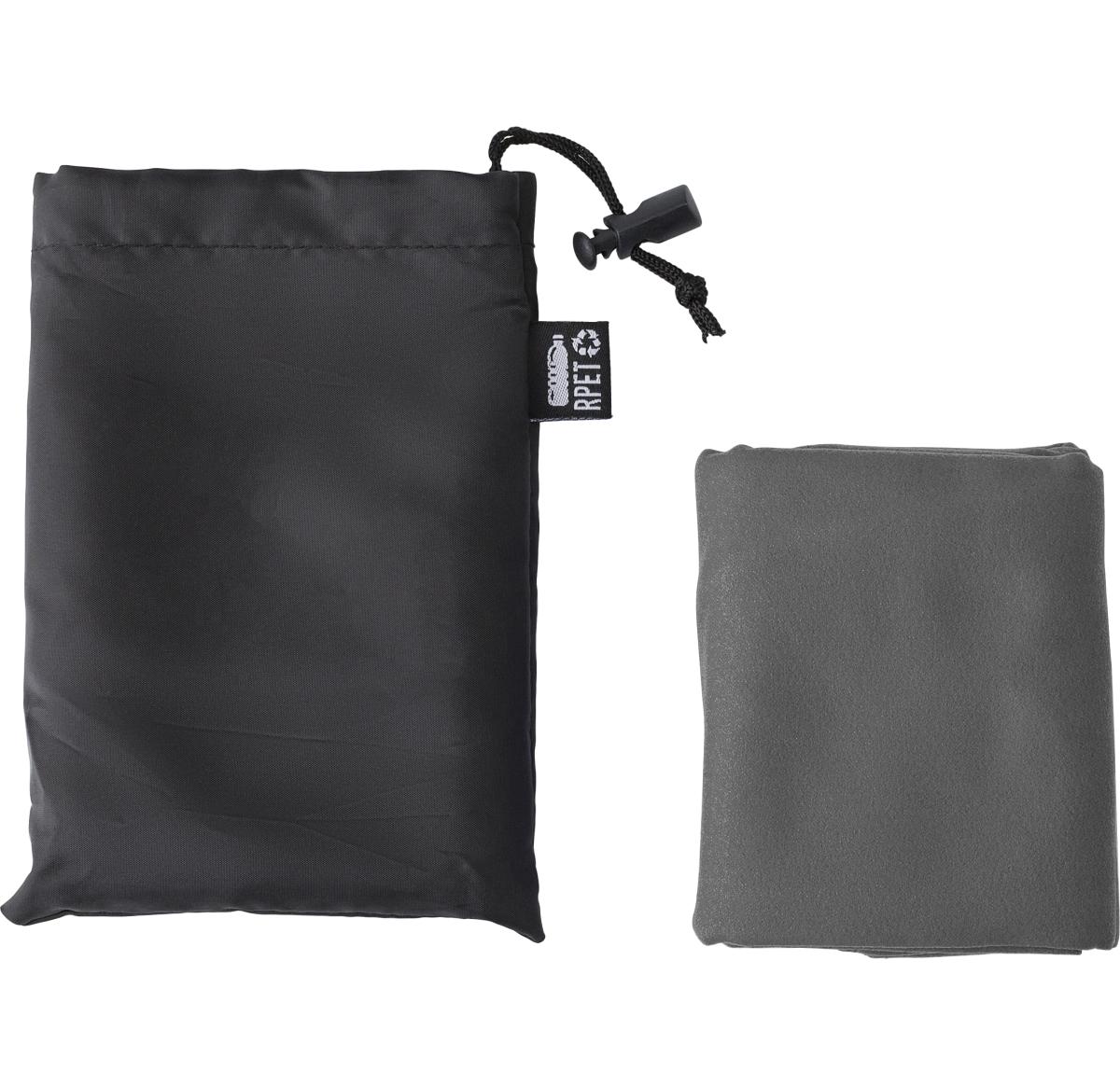 RPET Towel (79cm x 30cm) in RPET pouch with drawstring closure. (RPET - recycled polyethylene terephtlalate) RPET takes plastic that has already been created, usually plastic bottles, and chops the bottles into tiny flakes. These flakes are then melted to separate the core PET ingredient inside of the bottle that can then be turned into new products. Using RPET as an alternative to PVC is a huge step forward on the path toward a greener planet 100% recyclable.