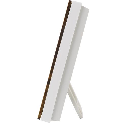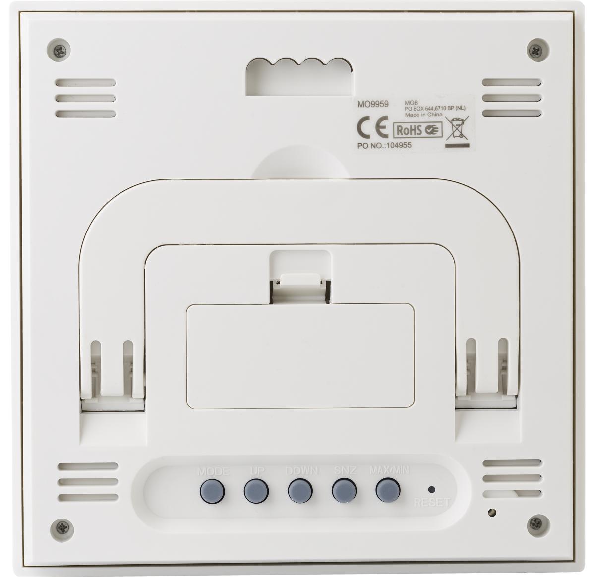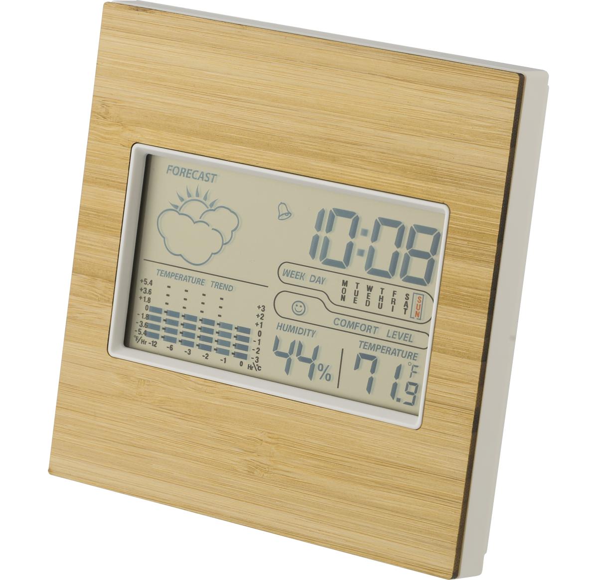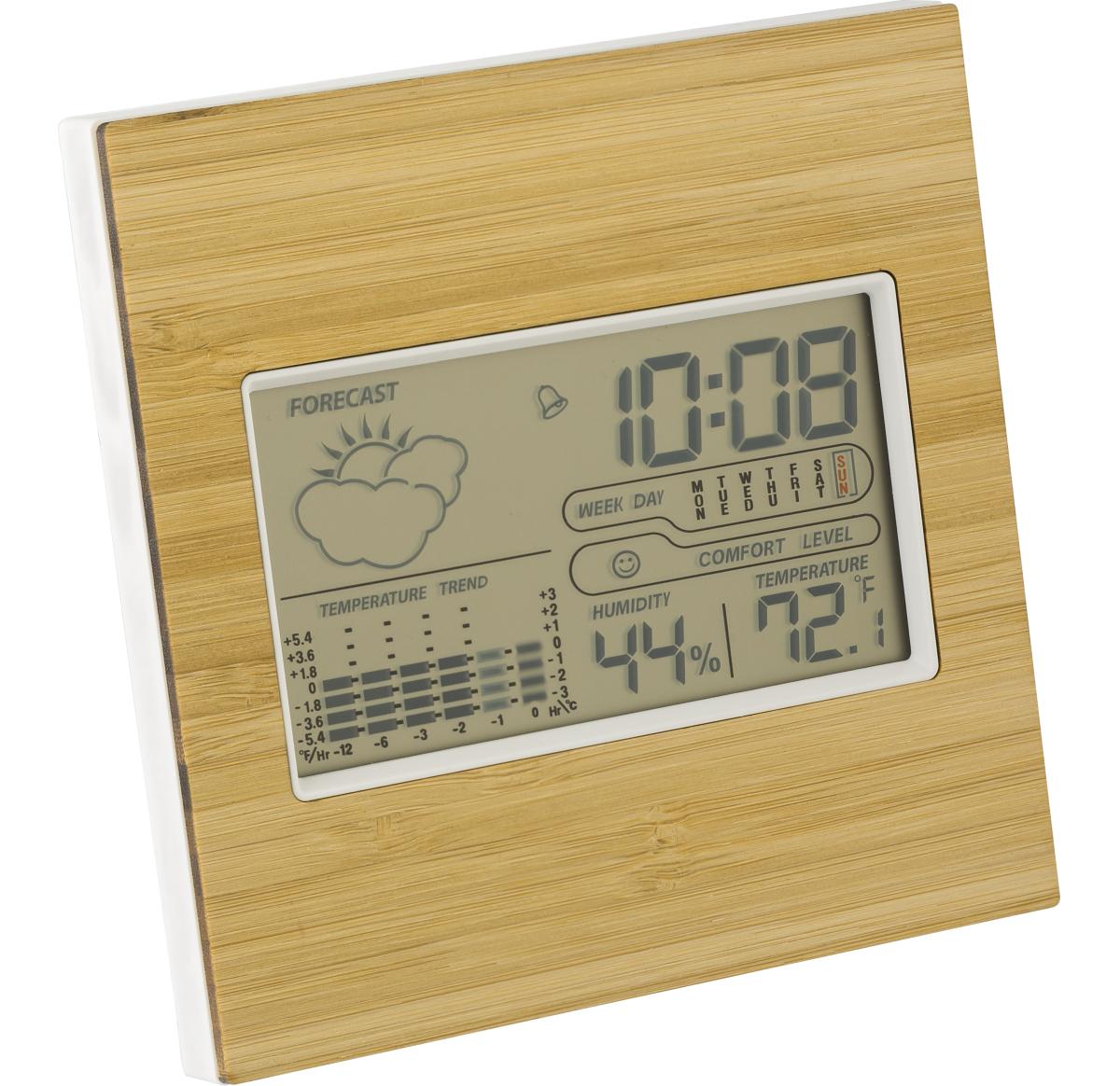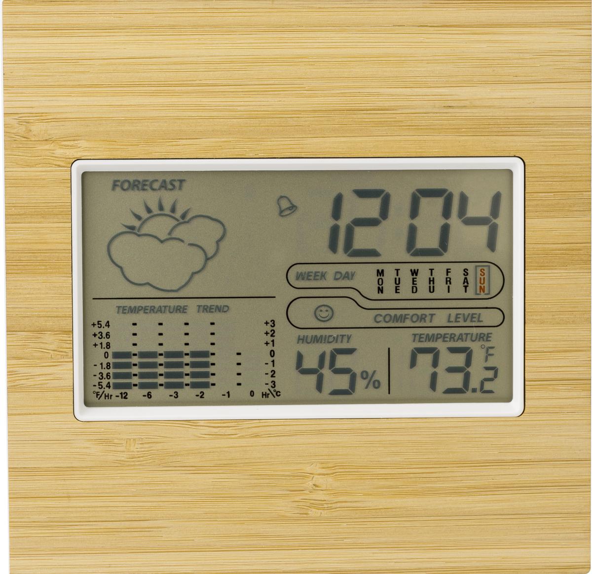 Bamboo and plastic weather station with foldable stand that locks into several different positions. Functions: time, calendar, week overview, alarm and snooze, temperature, humidity and weather information. Batteries included.