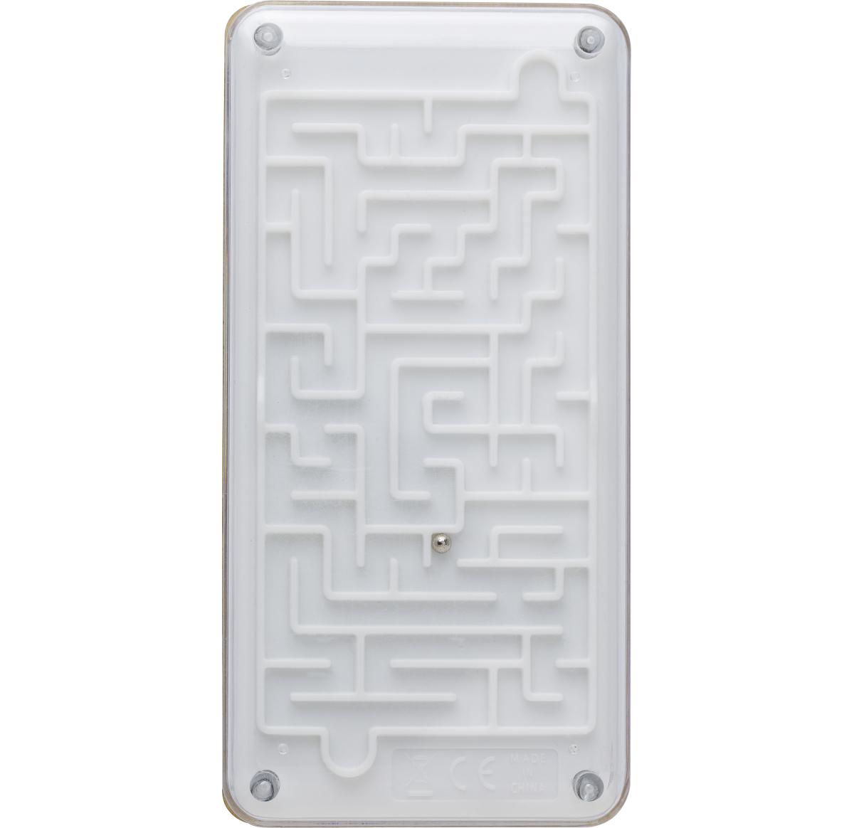 Bamboo and plastic calculator with a ball maze game on the back, displays up to 8 digits.