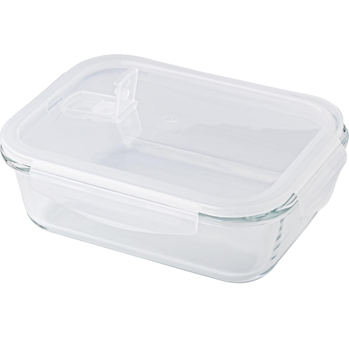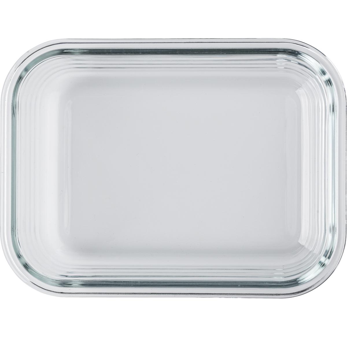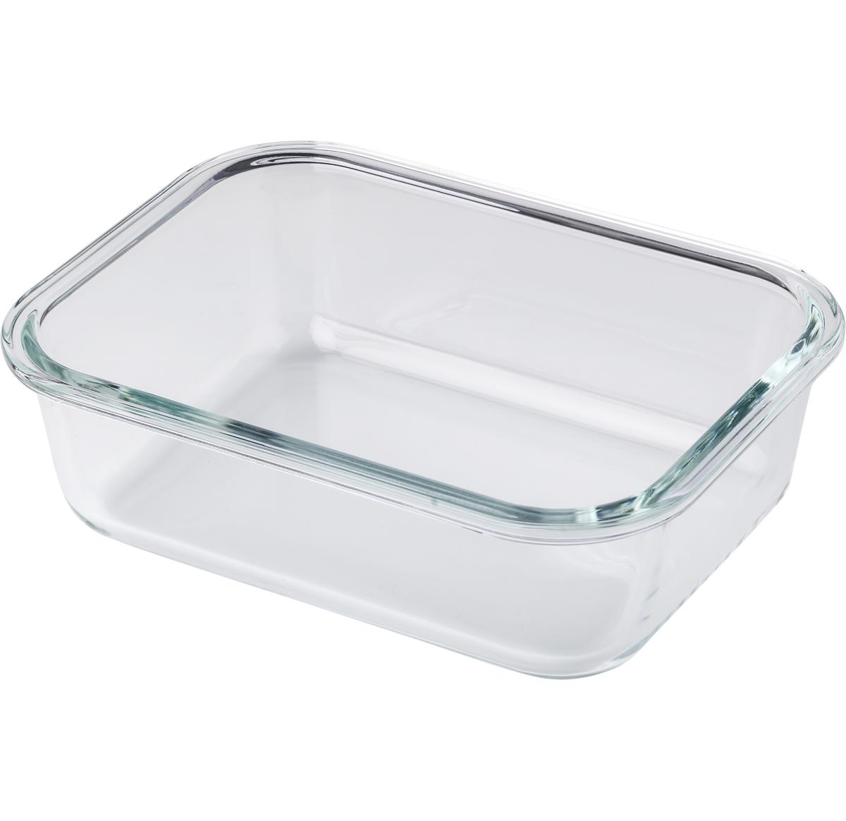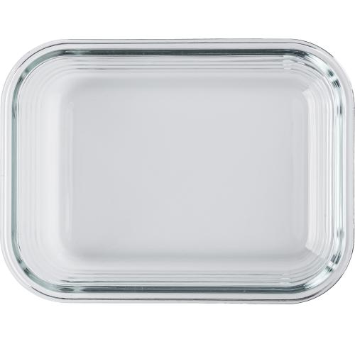 High borosilicate glass lunch box with plastic lid. Suitable for microwave. Capacity: approximately 1 ltr