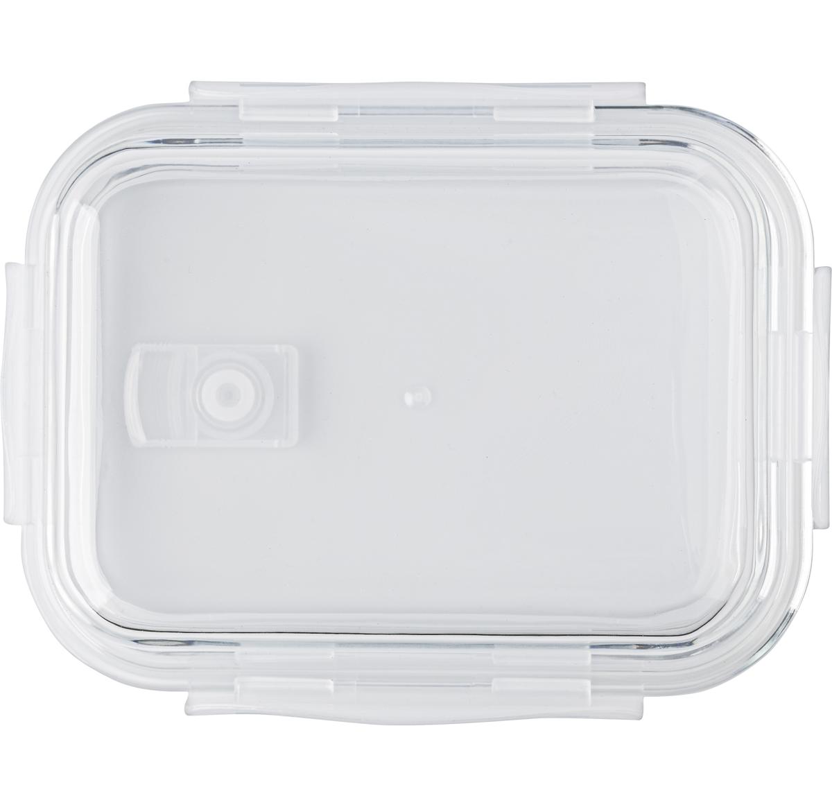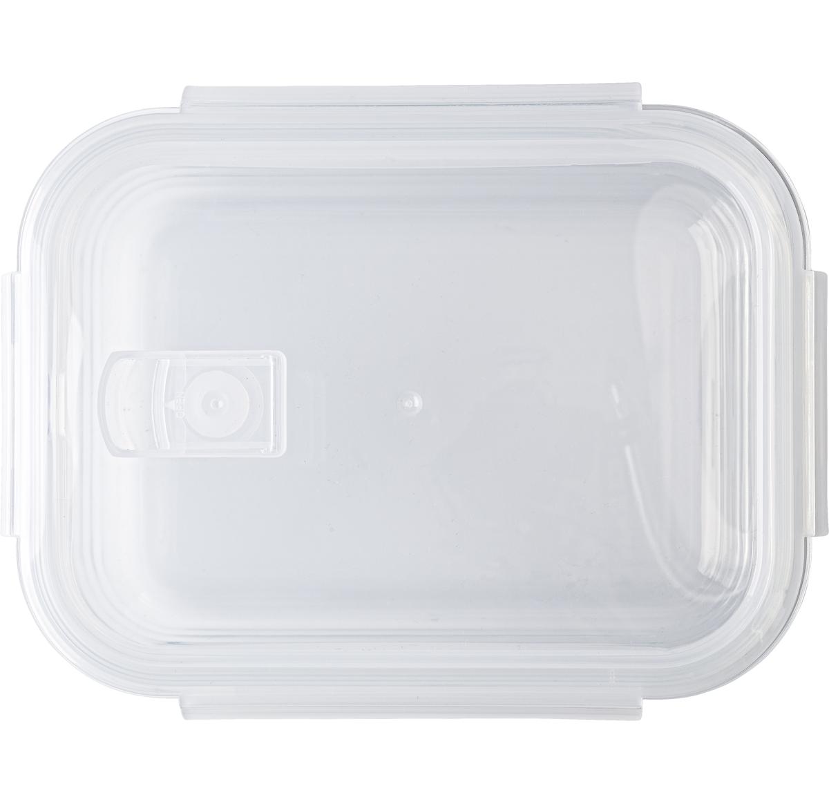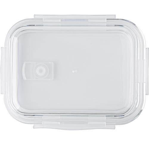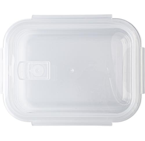 High borosilicate glass lunch box with plastic lid. Suitable for microwave. Capacity: approximately 1 ltr