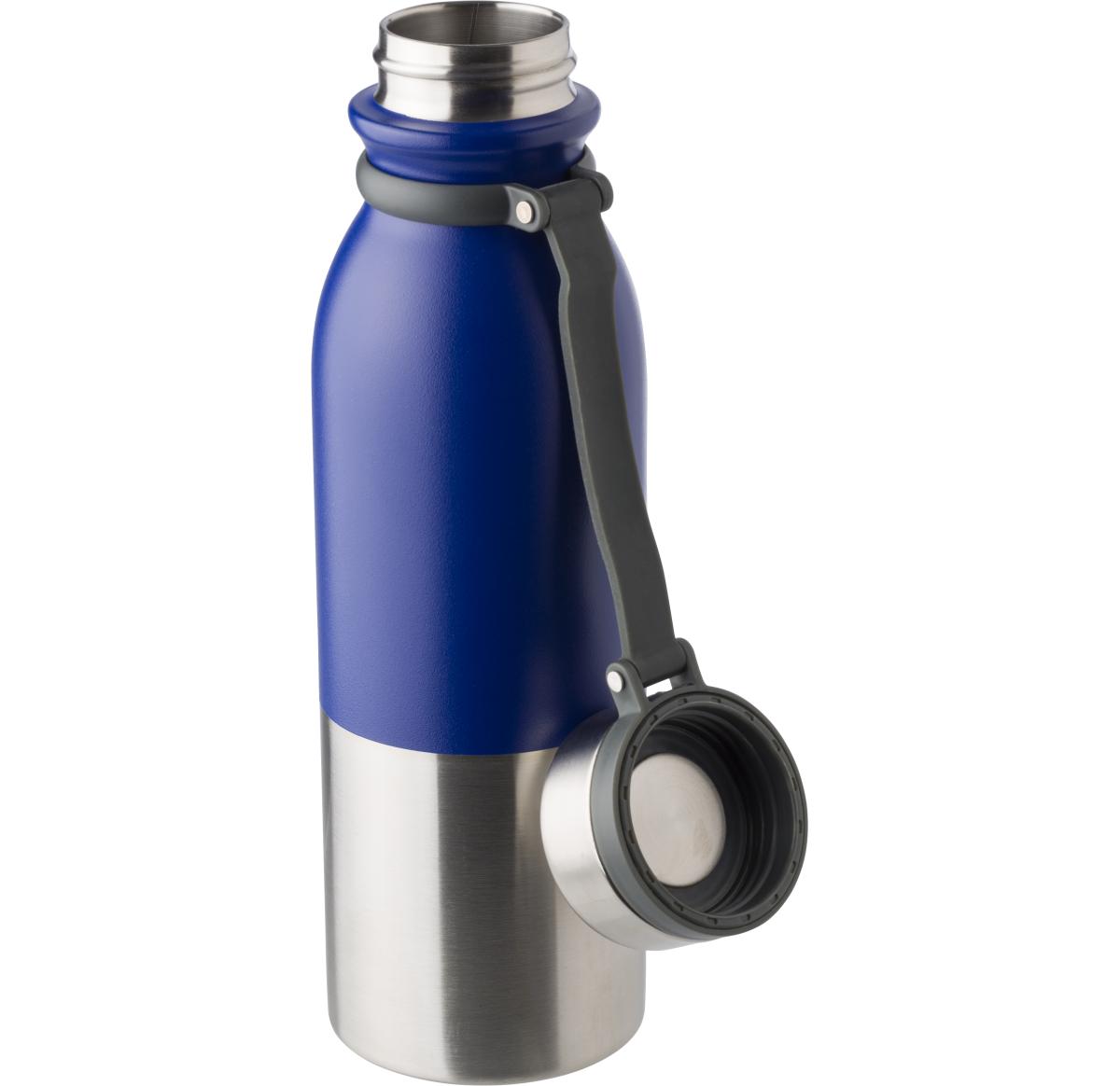 Stainless steel, double walled bottle (600 ml). Silicone strap keeps the cap attached to the bottle.