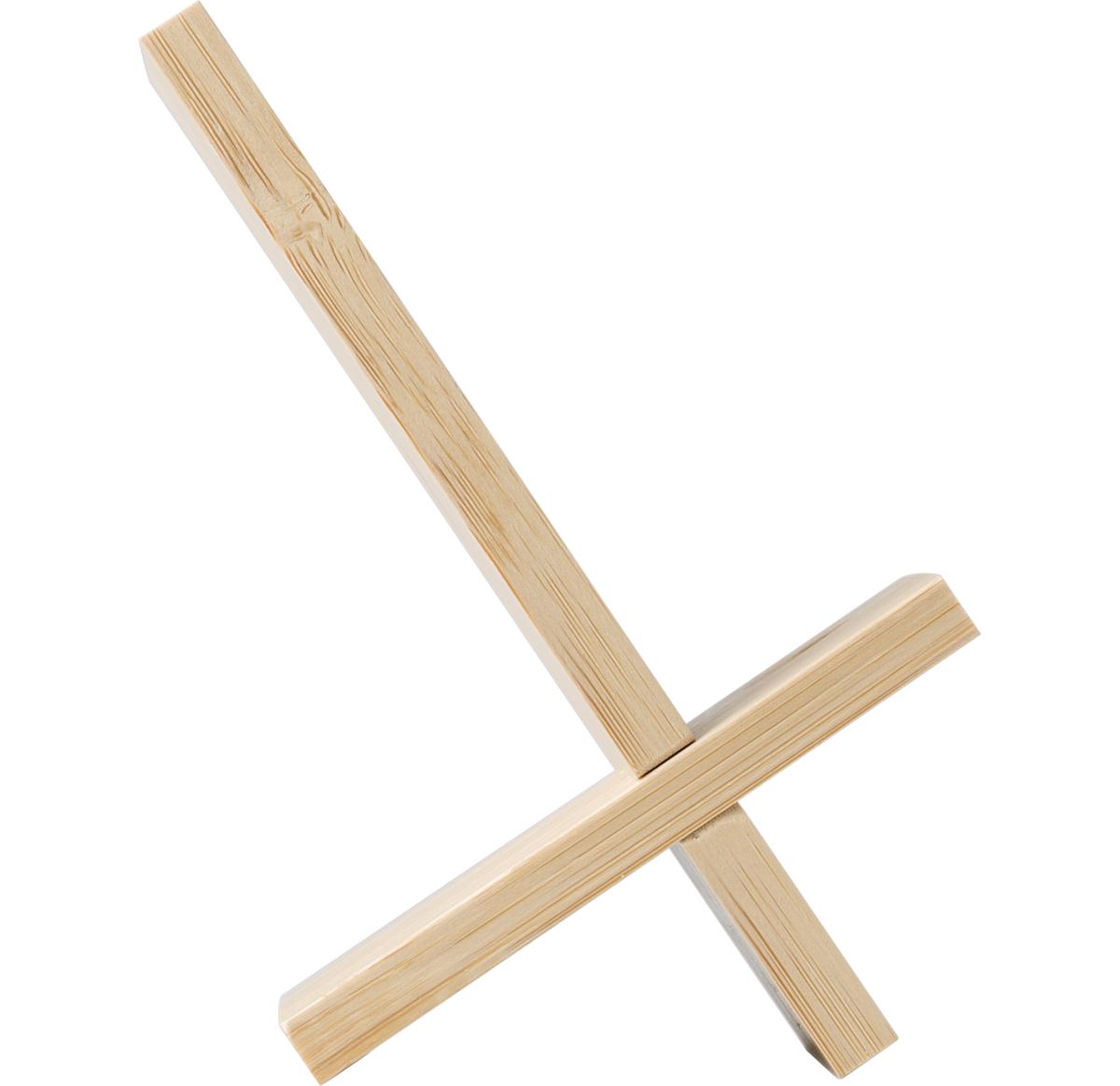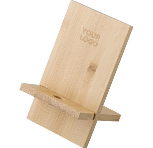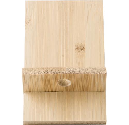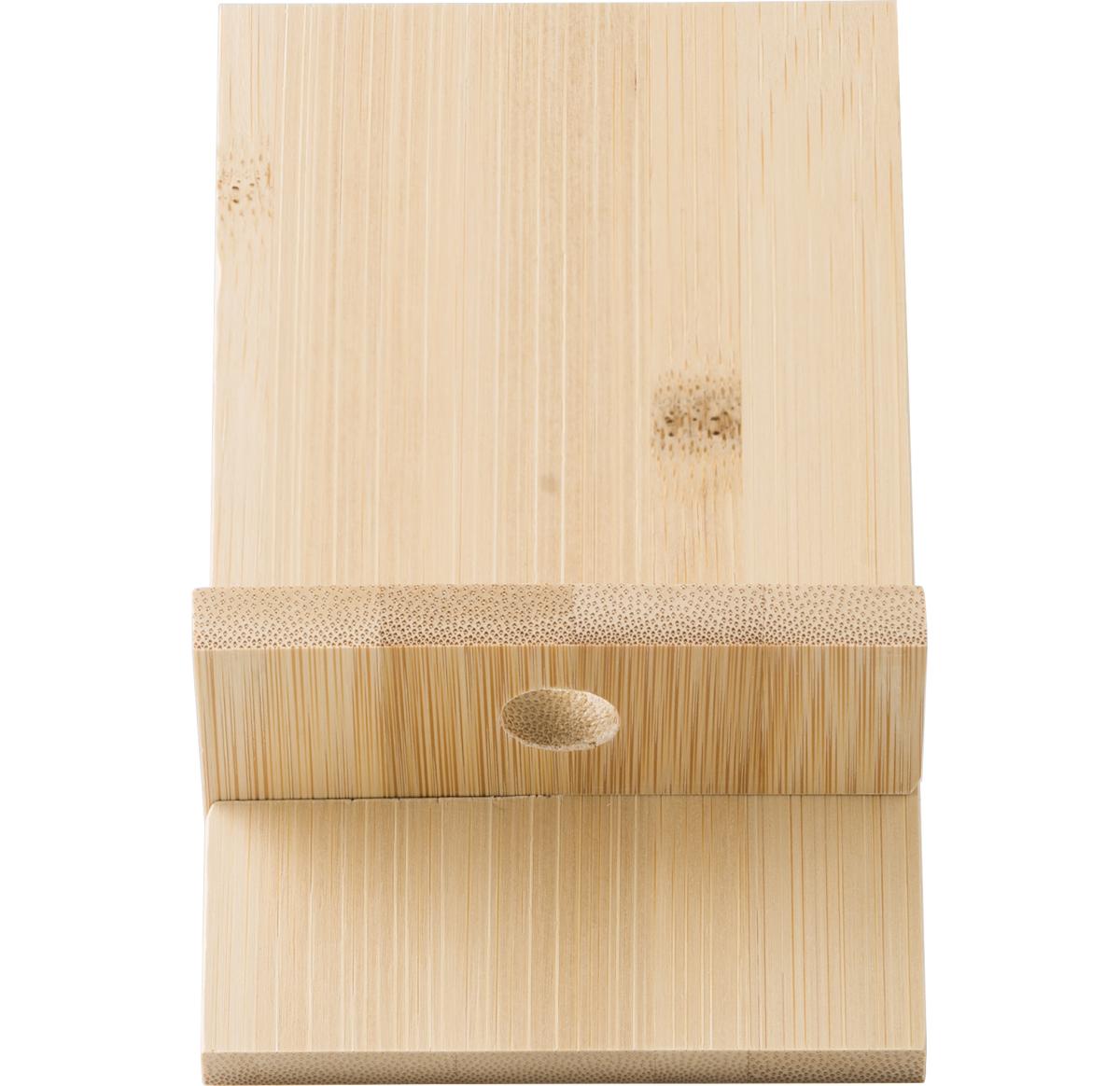 Bamboo phone stand with opening (1 cm diameter) for the phone charger. Assembly required: delivered in two pieces. Packaged in giftbox.
