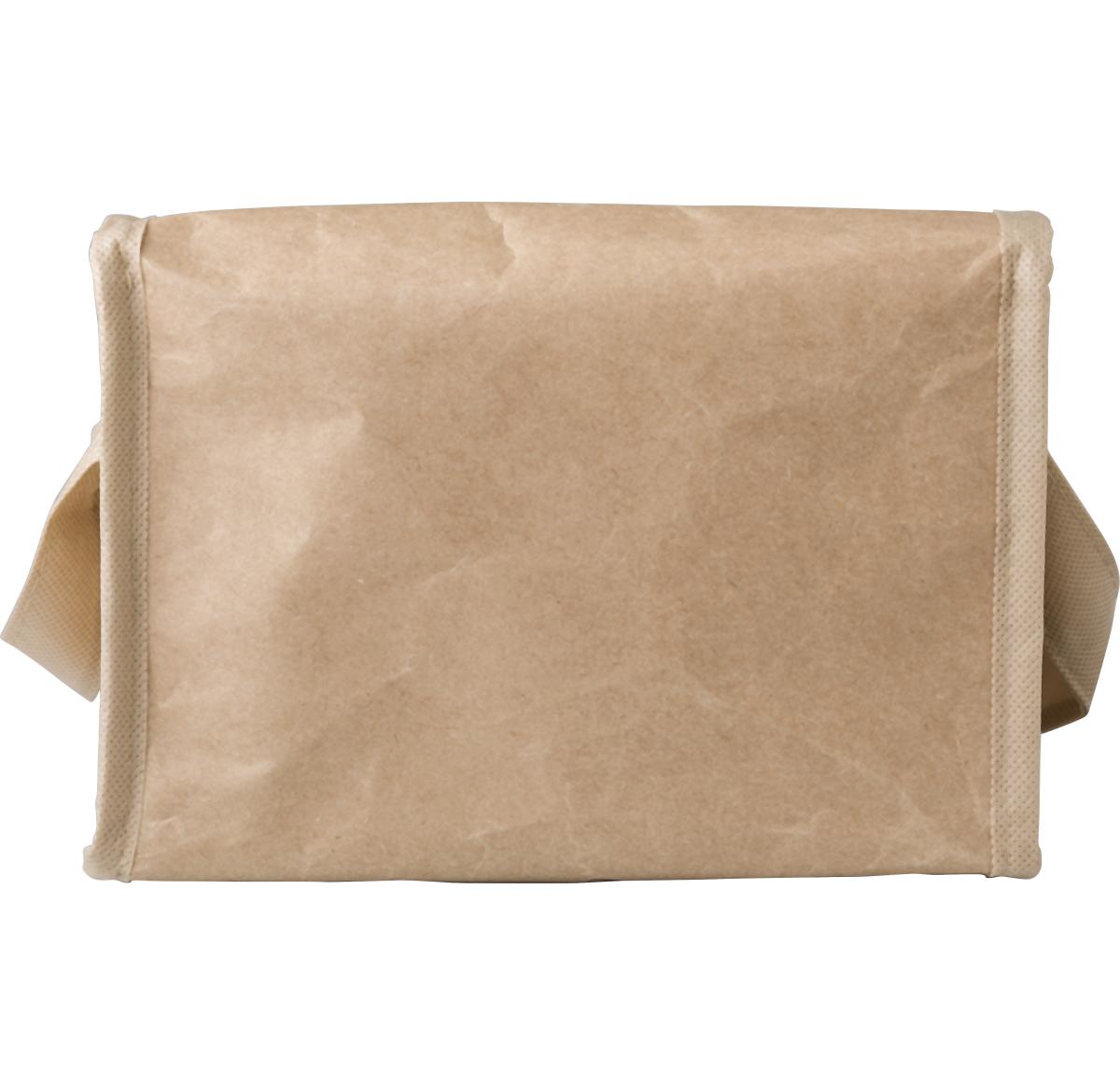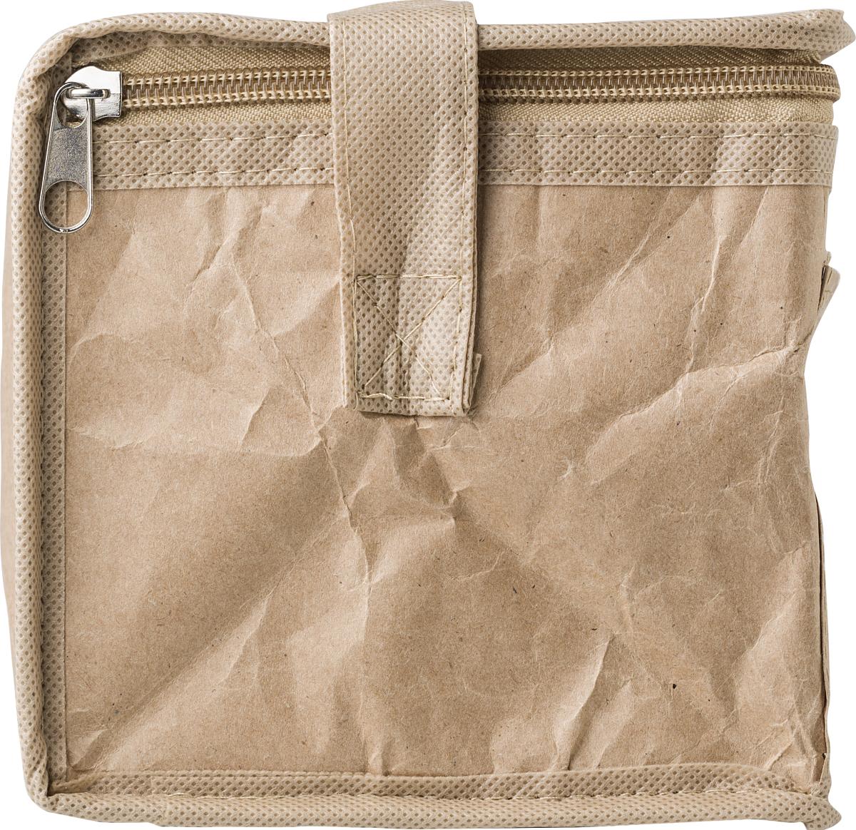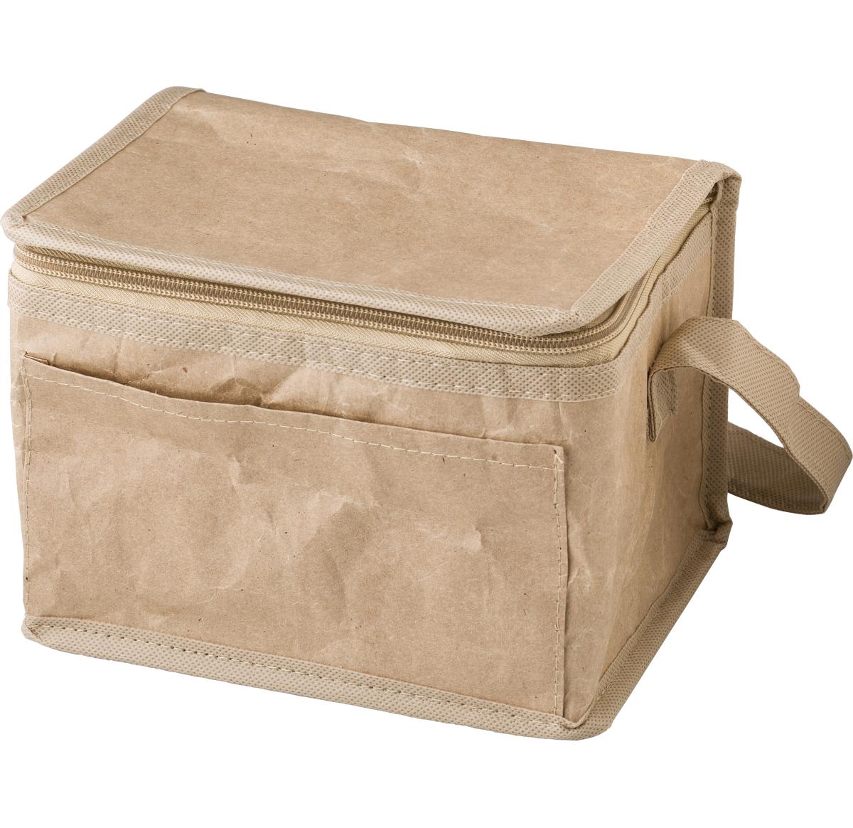 Paper (80 gsm) woven cooler bag with aluminium foil interior, for six 330 ml cans. With front pocket and strap. Capacity: 3 liters.