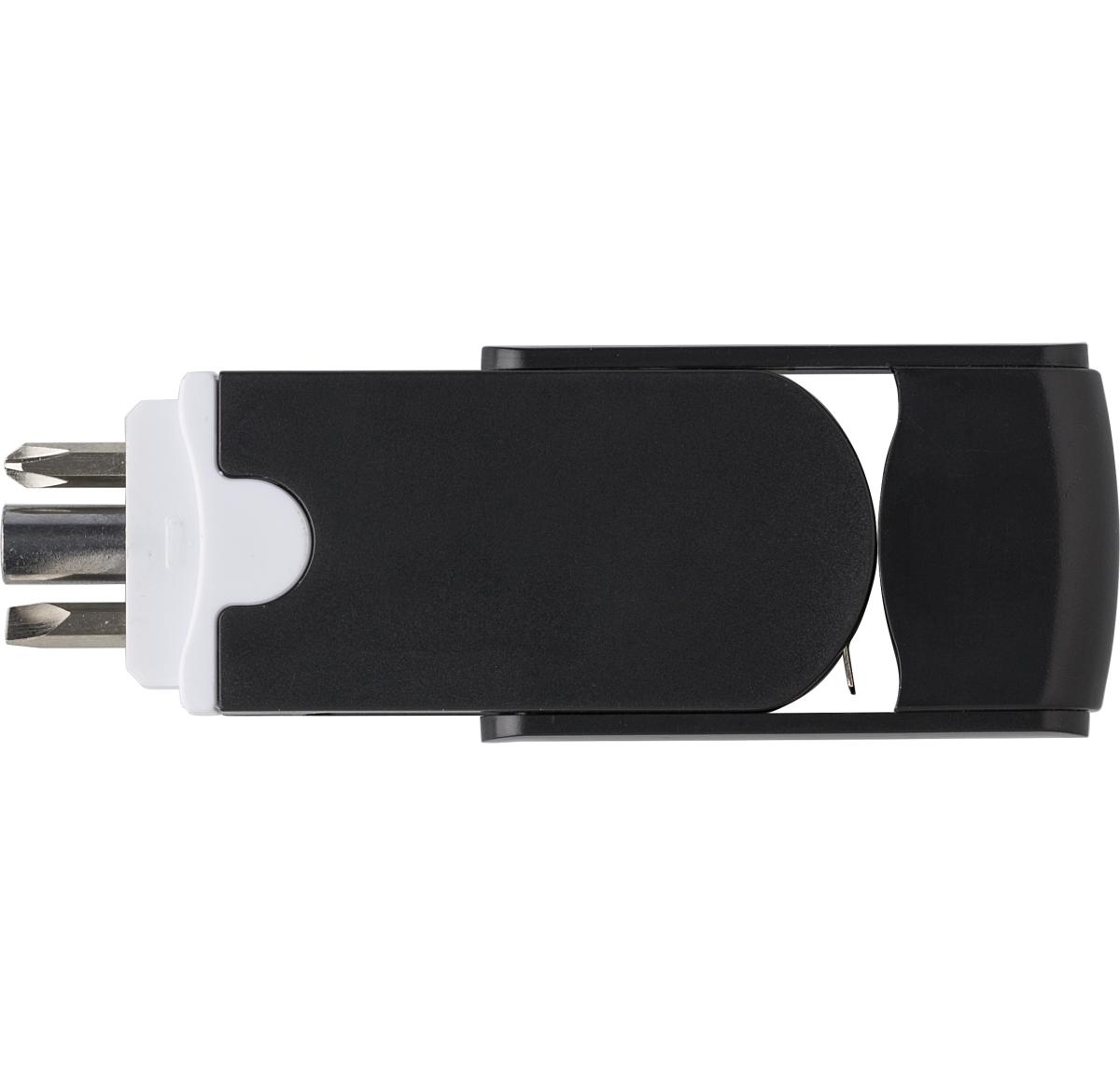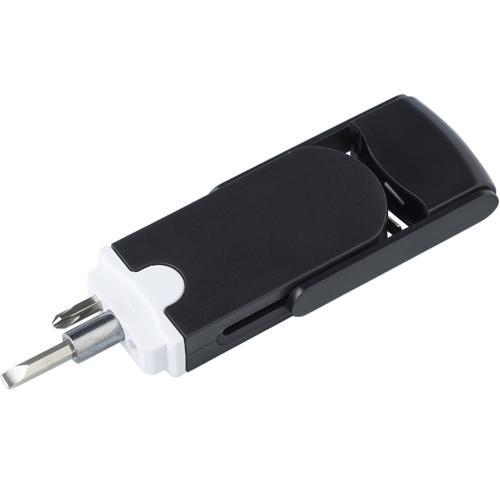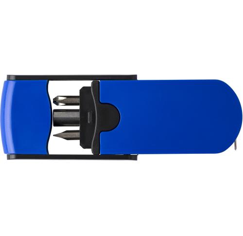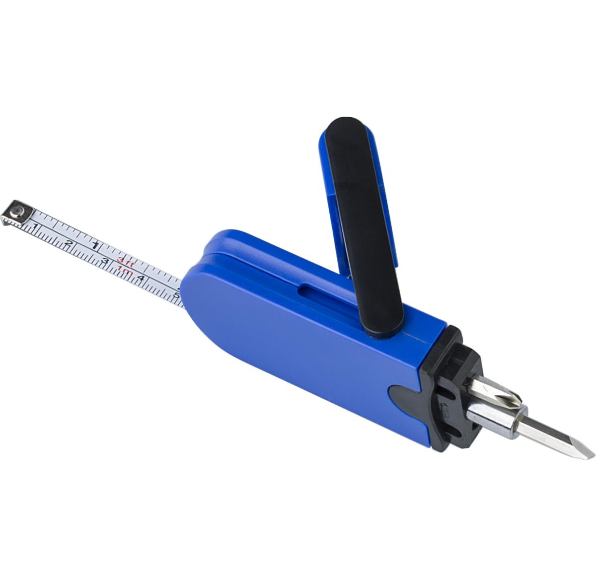 Metal and plastic multi-functional tool with two sizes of flat head and Philips head screwdrivers and measuring tape (1 meter)